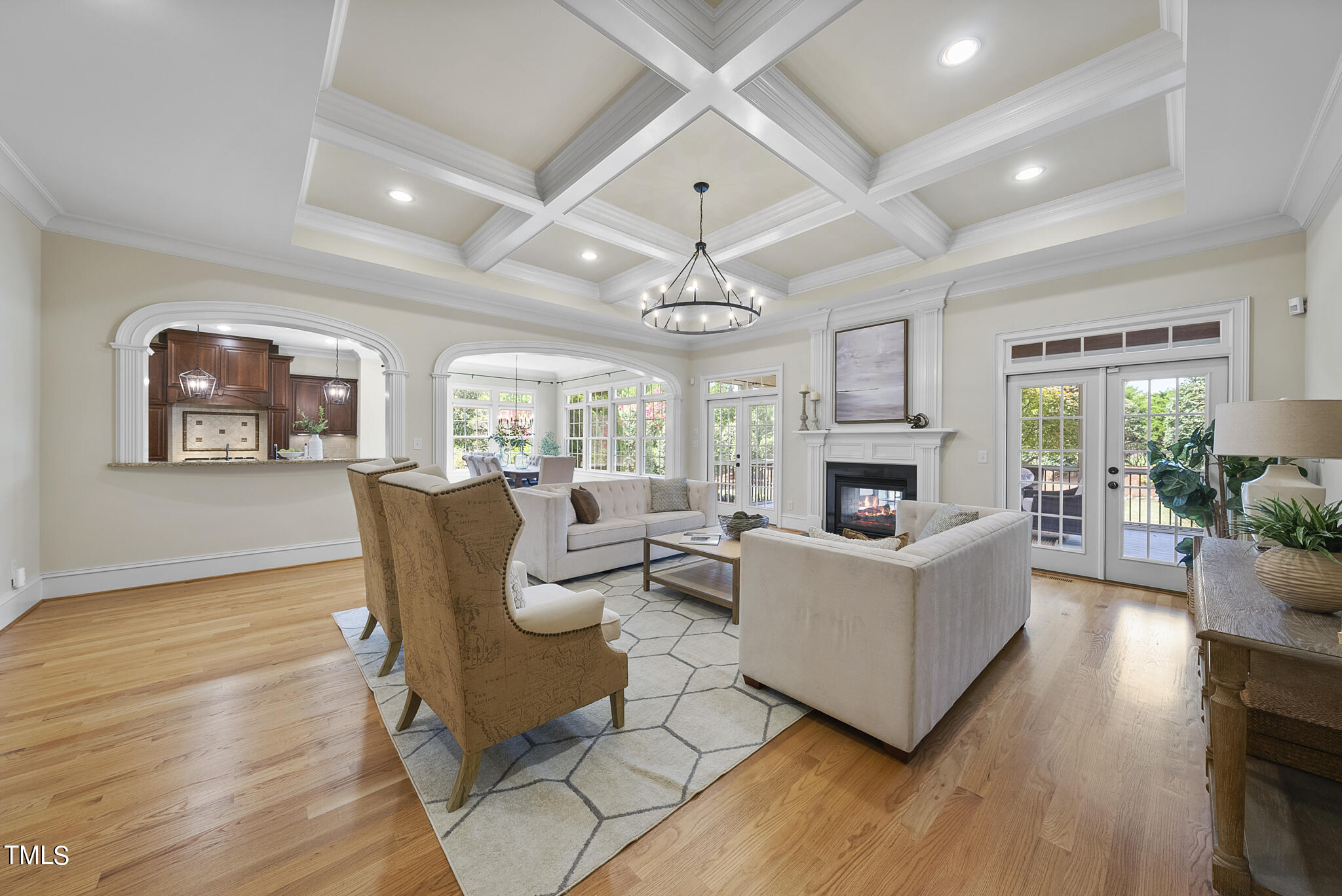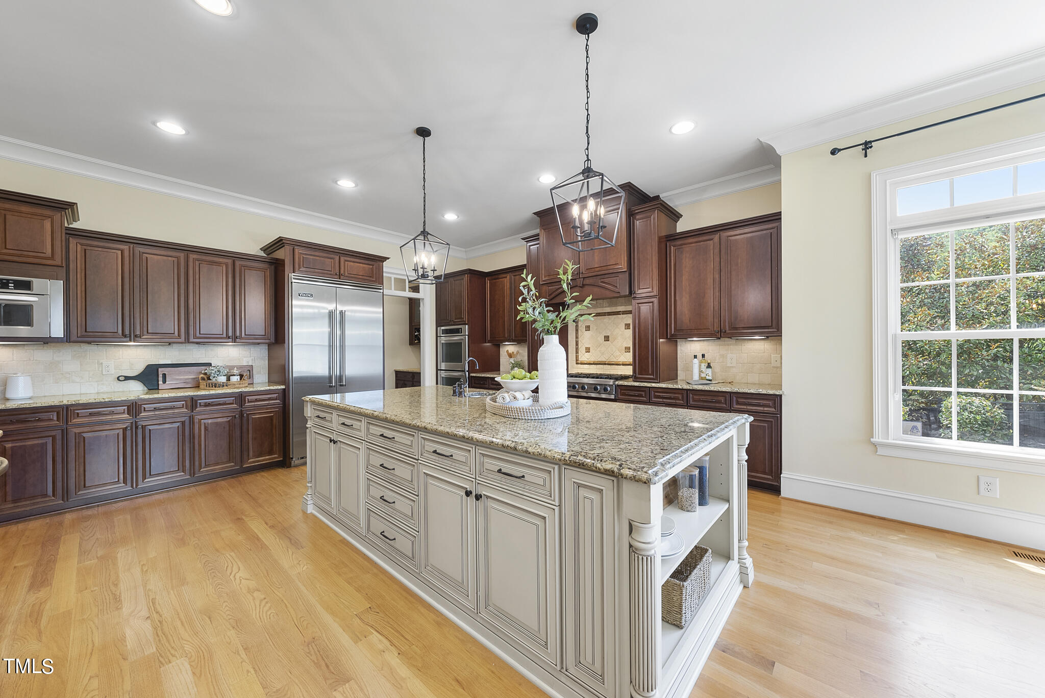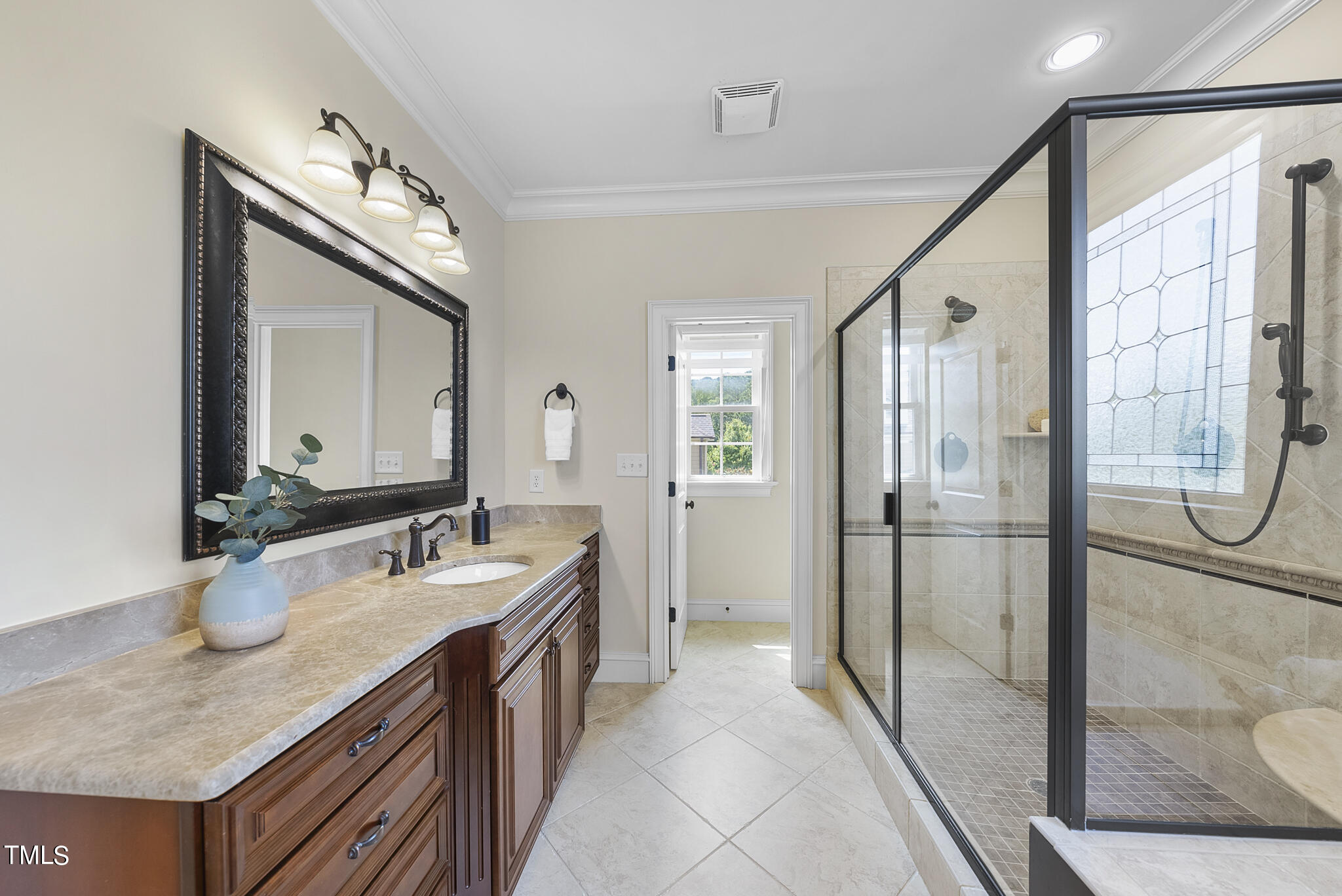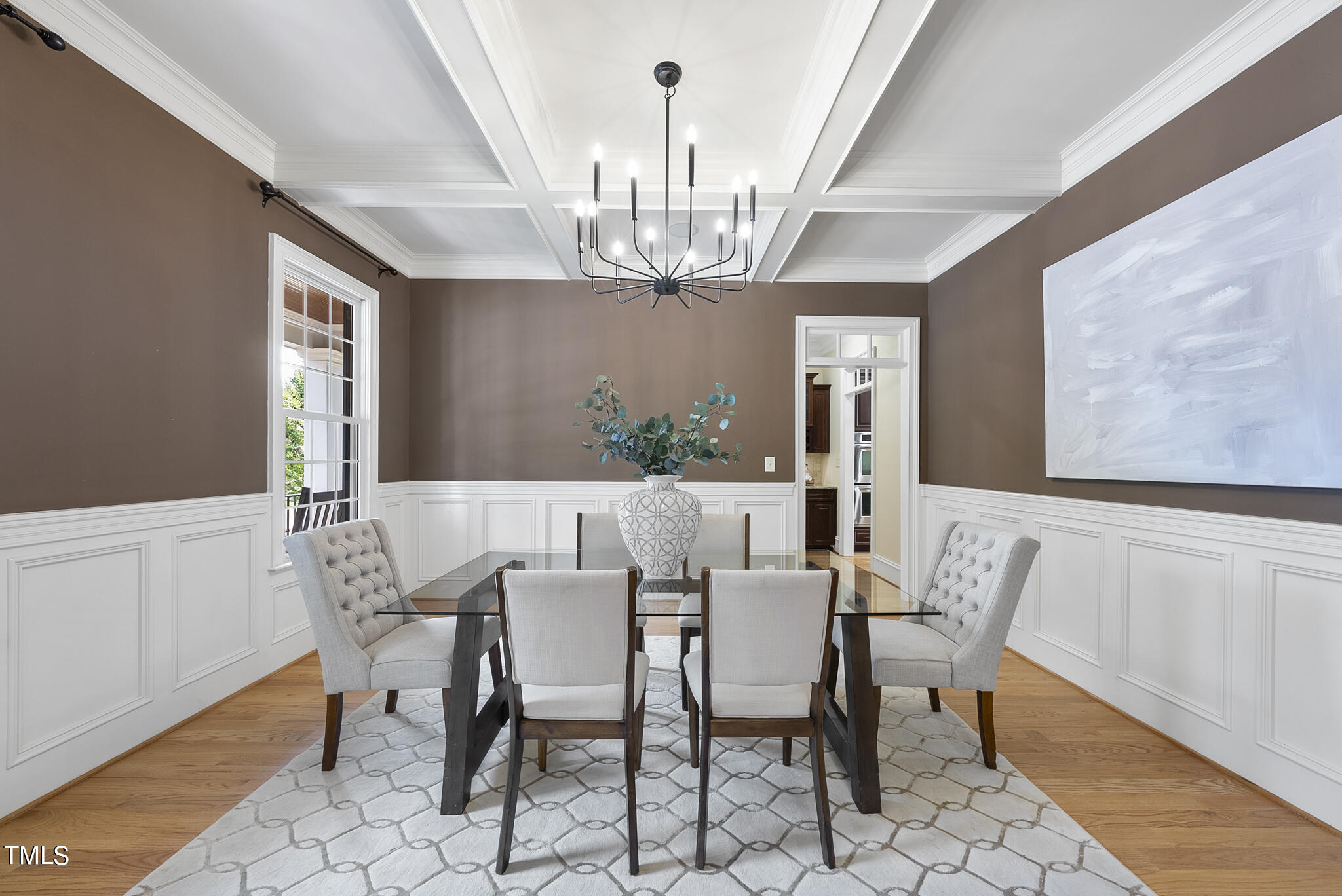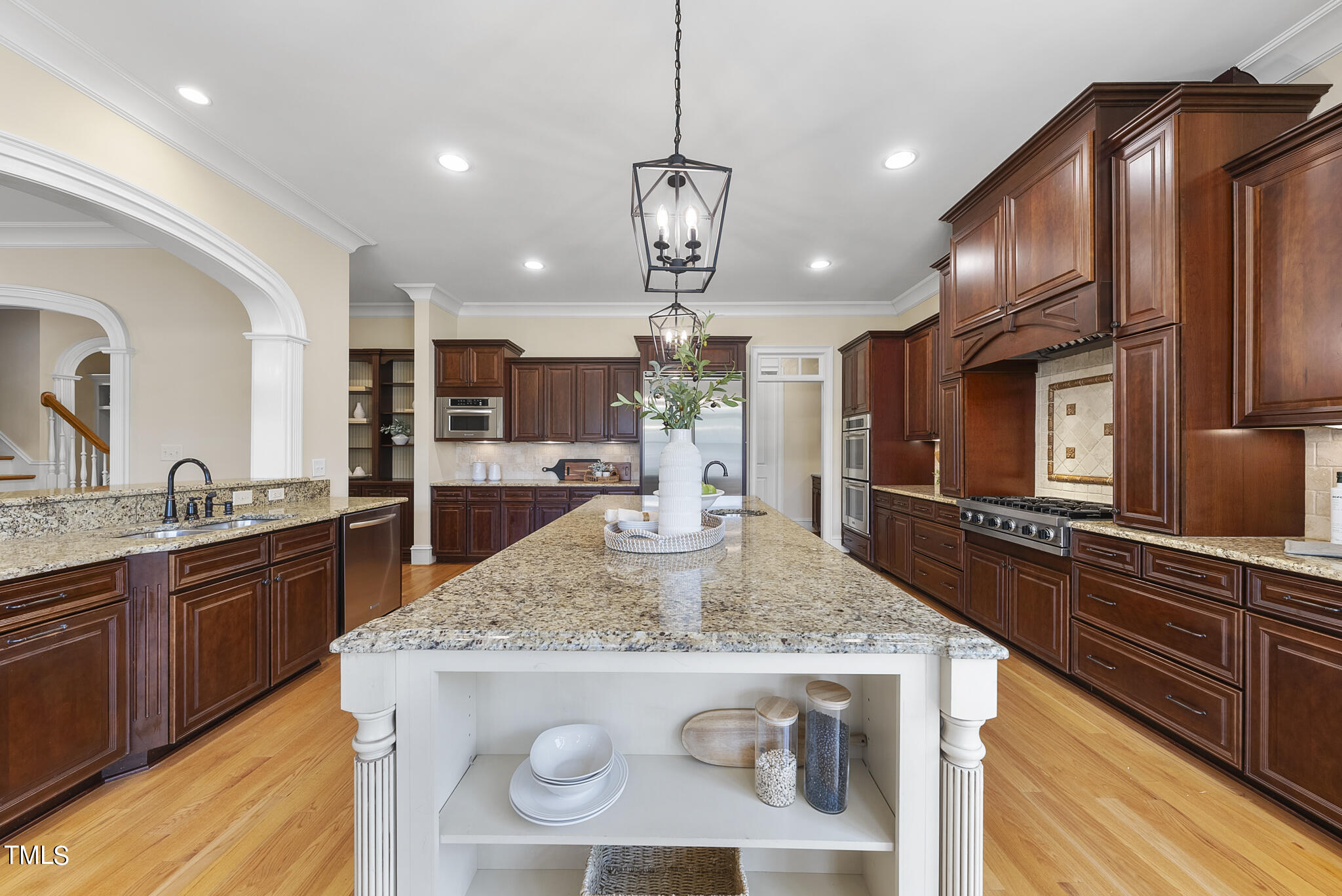 Beautiful, well maintained home with impressive curb appeal and a spacious interior plan. The front of this home offers delightful landscaping, a circular drive with brick inlays and a wraparound front porch. In the rear you'll find a screened porch overlooking a private fenced yard, large patio with pergola, grill island and easy access to the neighborhood pool or community greenway system connecting to the American Tobacco Trail. The main level is open, spacious and features arched thresholds, coffered ceilings, a see-through gas fireplace and a plethora of windows overlooking the lush backyard. The kitchen and breakfast room is a large space perfect for entertaining and includes Viking and KitchenAid stainless appliances. 1st floor guest bed/office/bath. The 2nd floor features the primary and 3 secondary bedrooms with ensuite baths and bonus room with wet bar. Expand your living space via the walk-up 3rd floor. New HVAC and hot water in 2018, irrigation, wired security and whole house water softener systems, distributed audio and a closed crawlspace.