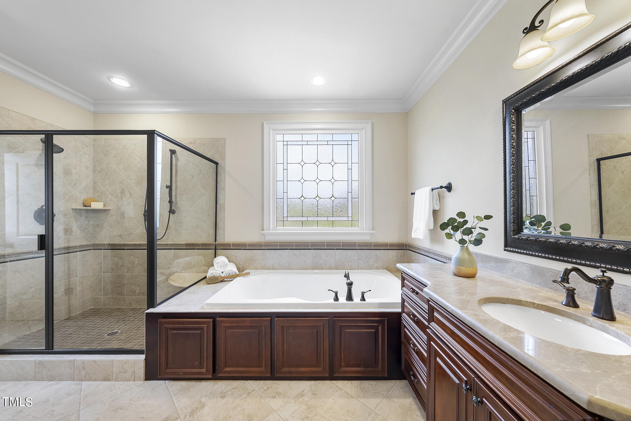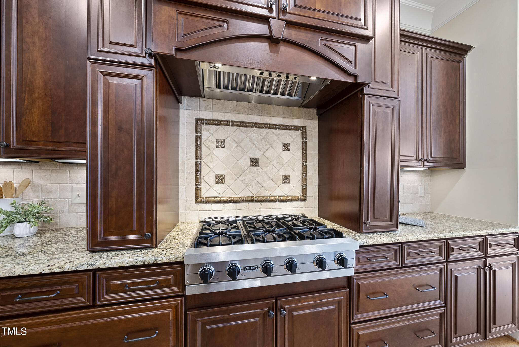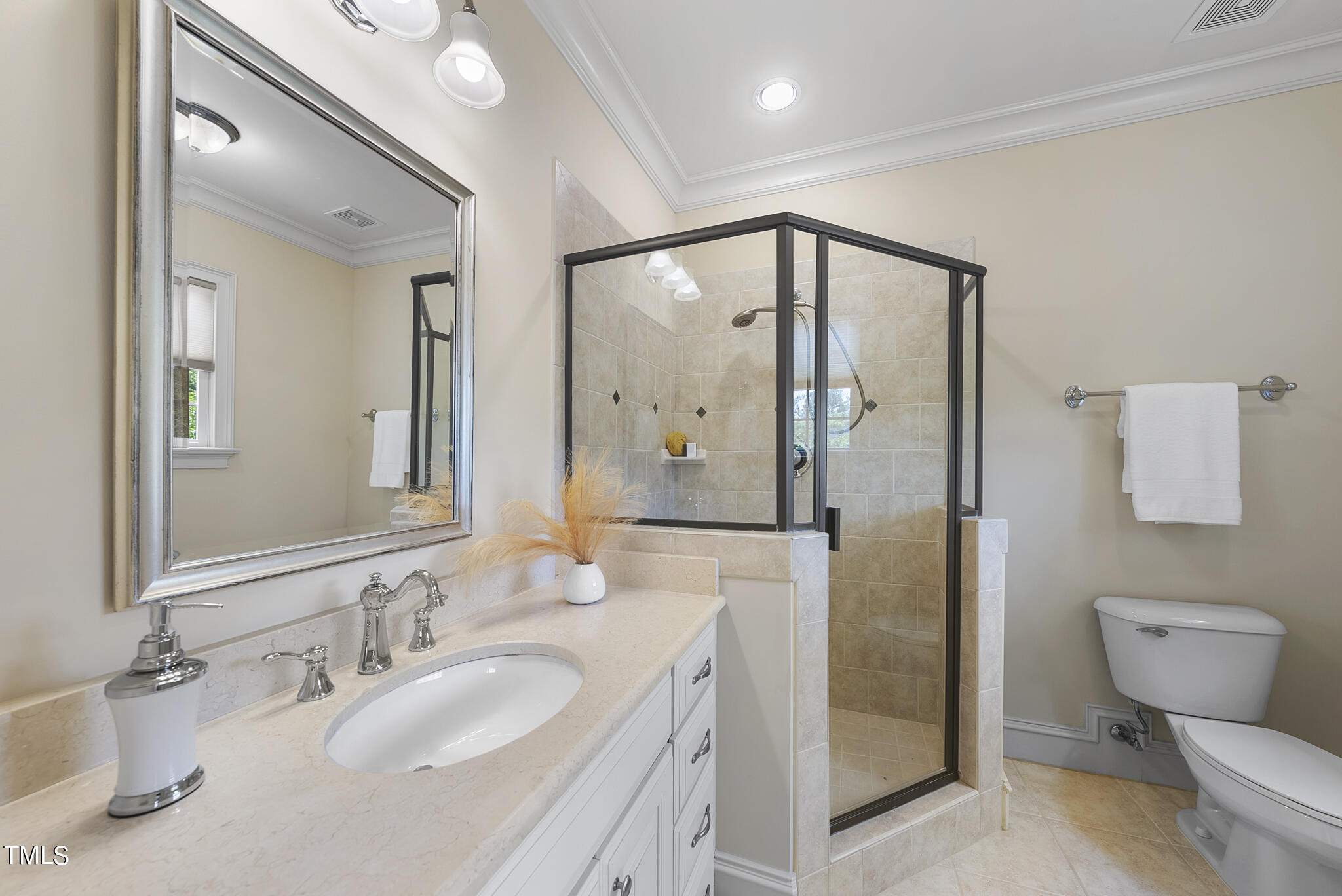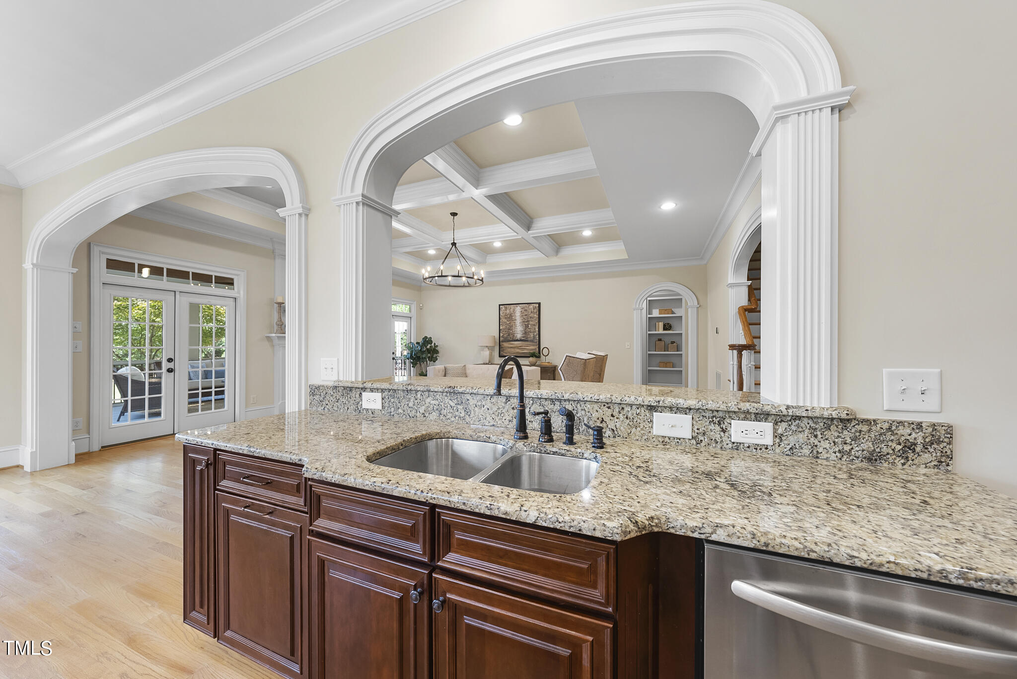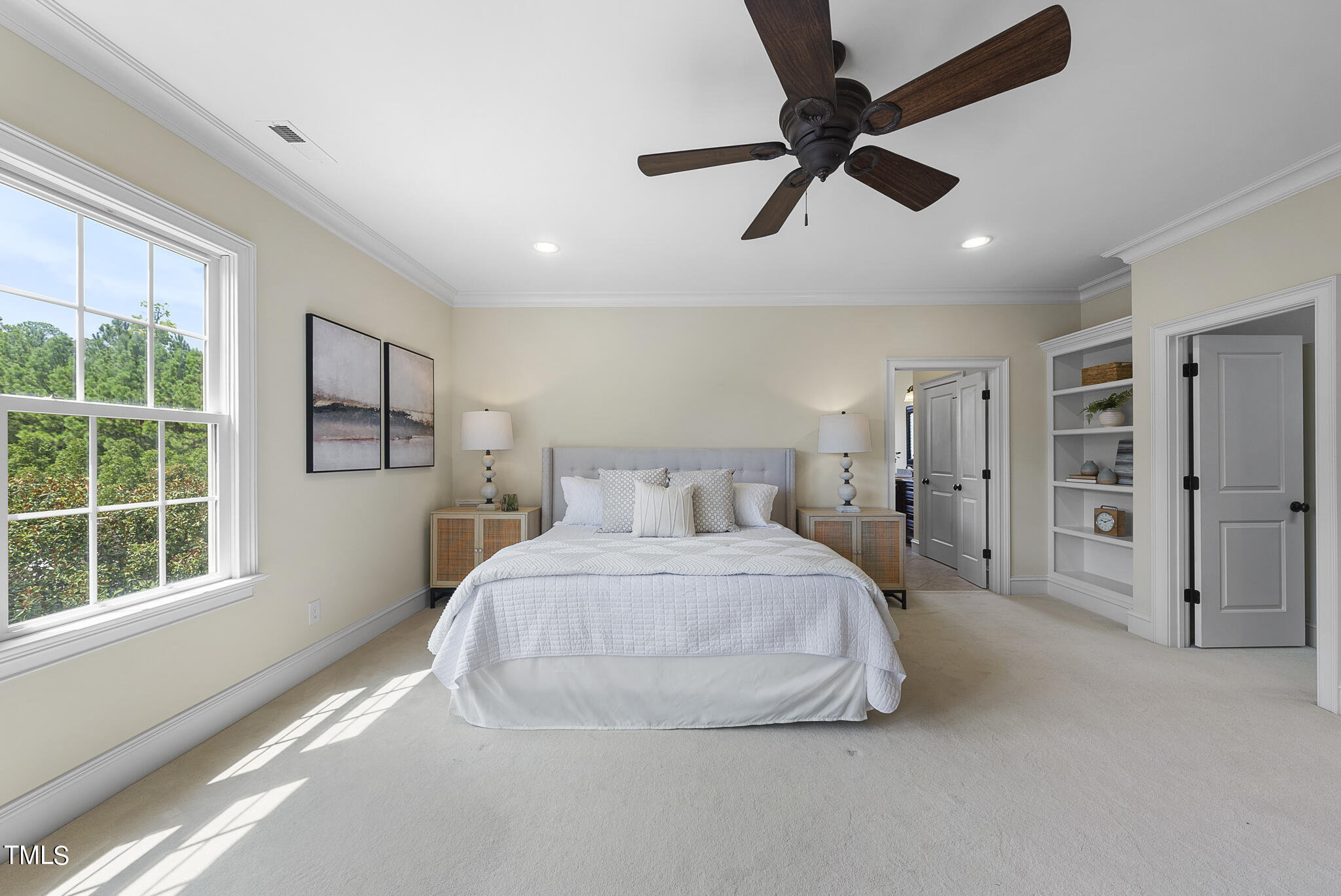 Beautiful, well maintained home with impressive curb appeal and a spacious interior plan. The front of this home offers delightful landscaping, a circular drive with brick inlays and a wraparound front porch. In the rear you'll find a screened porch overlooking a private fenced yard, large patio with pergola, grill island and easy access to the neighborhood pool or community greenway system connecting to the American Tobacco Trail. The main level is open, spacious and features arched thresholds, coffered ceilings, a see-through gas fireplace and a plethora of windows overlooking the lush backyard. The kitchen and breakfast room is a large space perfect for entertaining and includes Viking and KitchenAid stainless appliances. 1st floor guest bed/office/bath. The 2nd floor features the primary and 3 secondary bedrooms with ensuite baths and bonus room with wet bar. Expand your living space via the walk-up 3rd floor. New HVAC and hot water in 2018, irrigation, wired security and whole house water softener systems, distributed audio and a closed crawlspace.