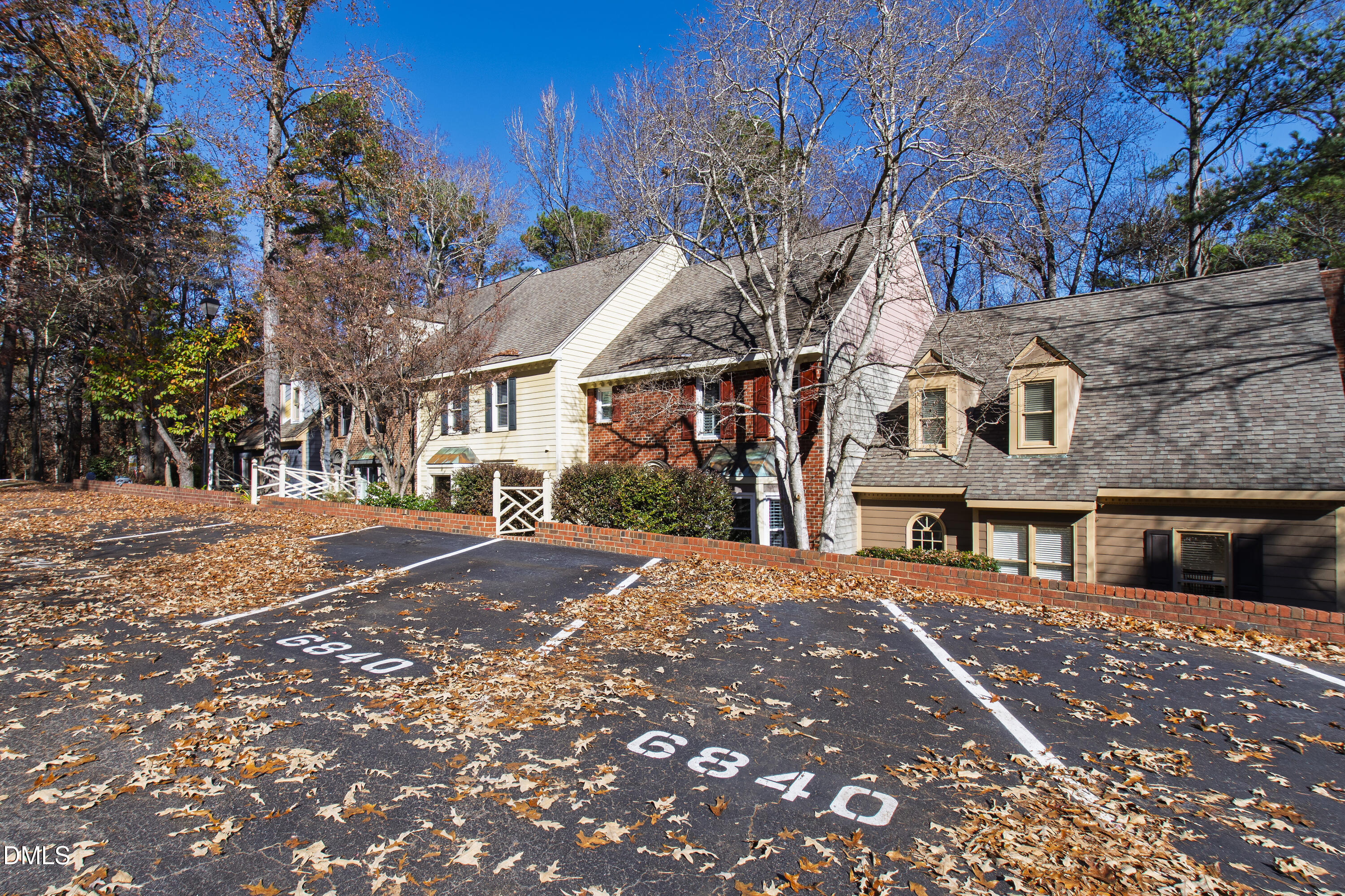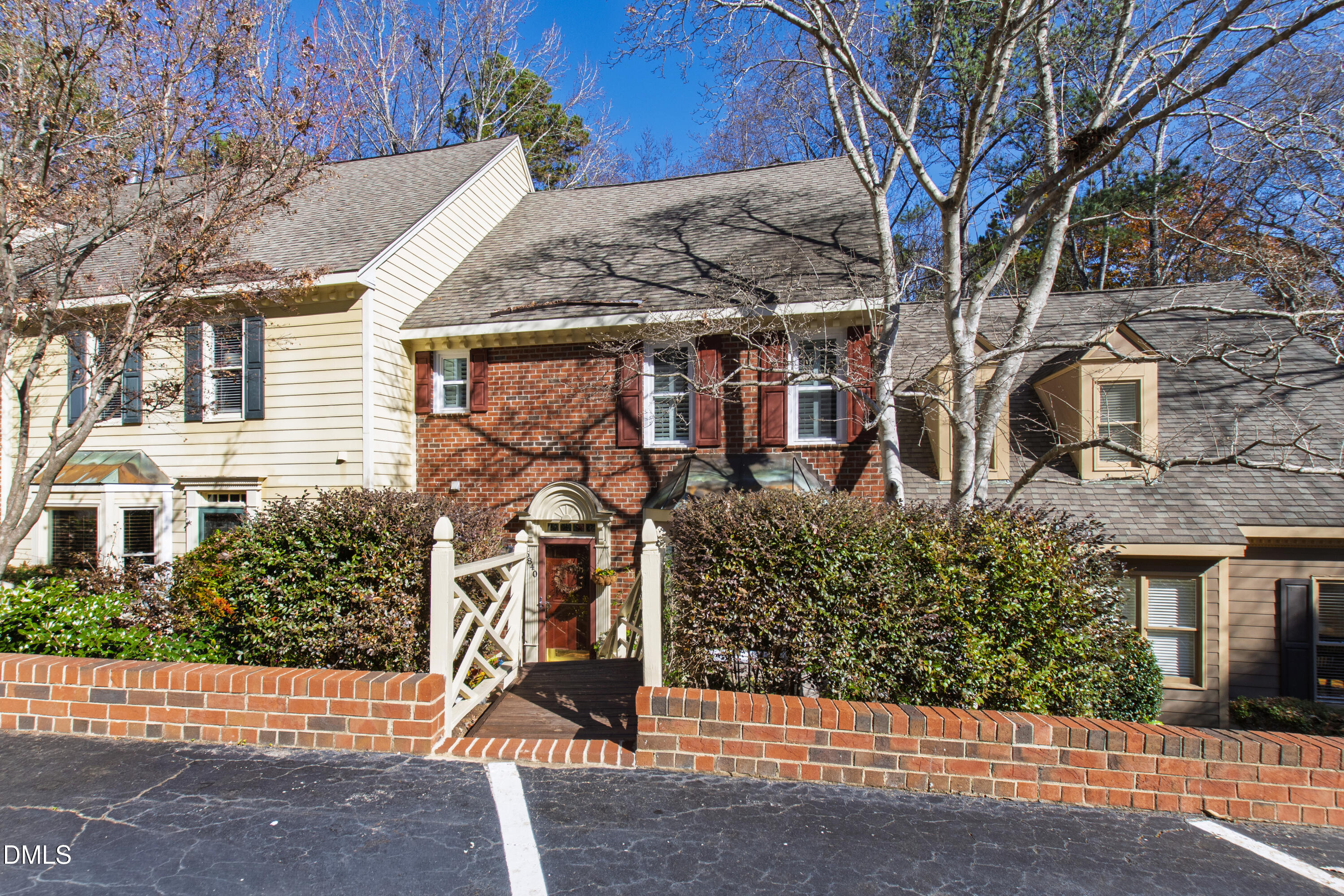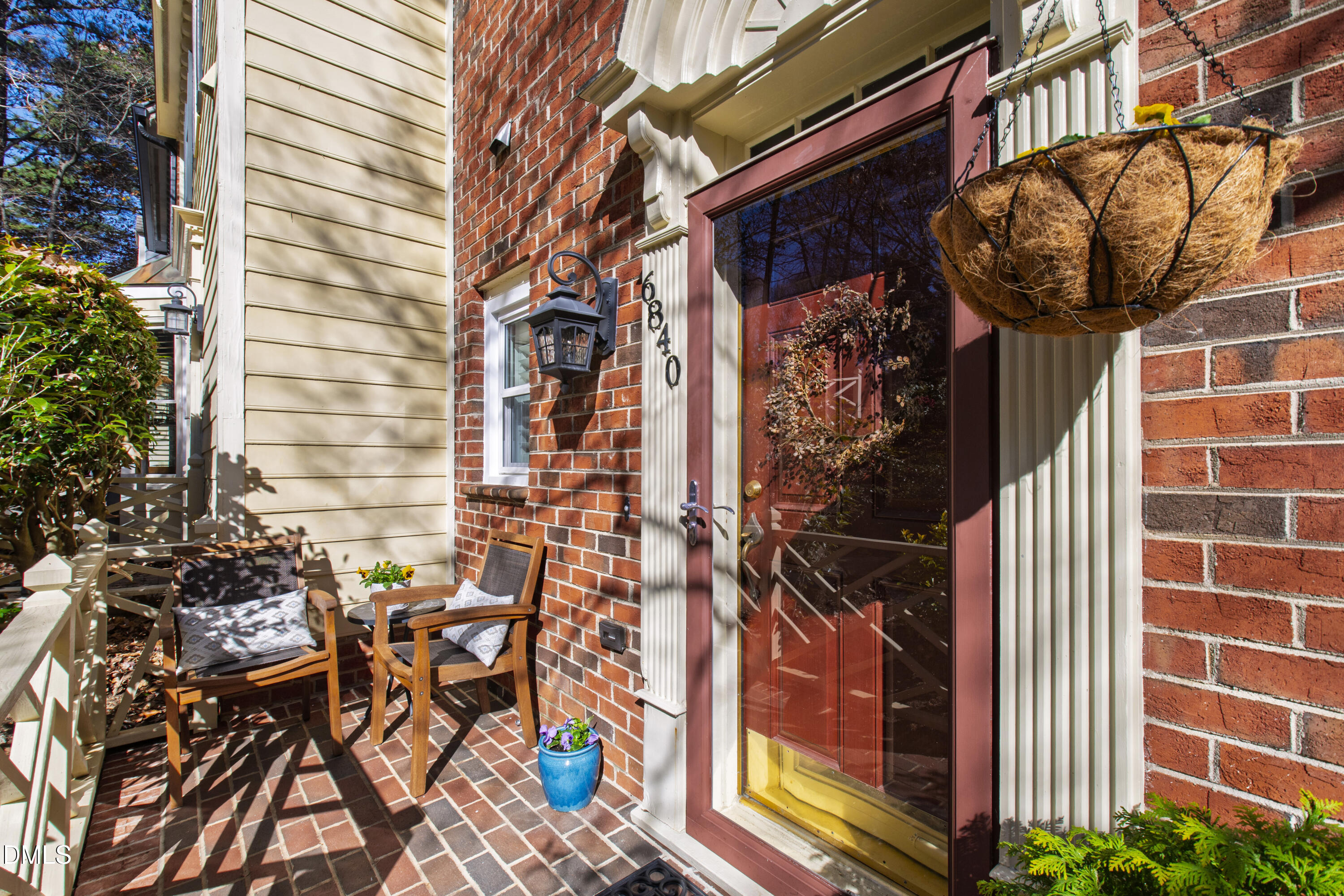 Welcome home to 6840 Gloucester Road--an inviting and beautifully maintained townhome tucked away in one of Raleigh's most convenient locations. This two-bedroom, two-and-a-half-bath home offers thoughtfully updated interiors, comfortable living spaces, and a charming natural backdrop. Enjoy a welcoming brick front porch with room for seating, perfect for soaking up sunshine even on cooler days. Step inside to a cozy living room centered around a classic brick gas-log fireplace, perfect for relaxing evenings at home. A separate dining room flows into the kitchen which is outfitted with a four-burner gas range, built-in microwave, Bosch dishwasher, pantry, granite countertops, and a stylish tile backsplash. The primary suite features a walk-in closet and a walk-in shower, while all bathrooms throughout the home have been refreshed to make every space feel polished and current. Additionally, the custom blinds in the primary bedroom offer both style and light control.