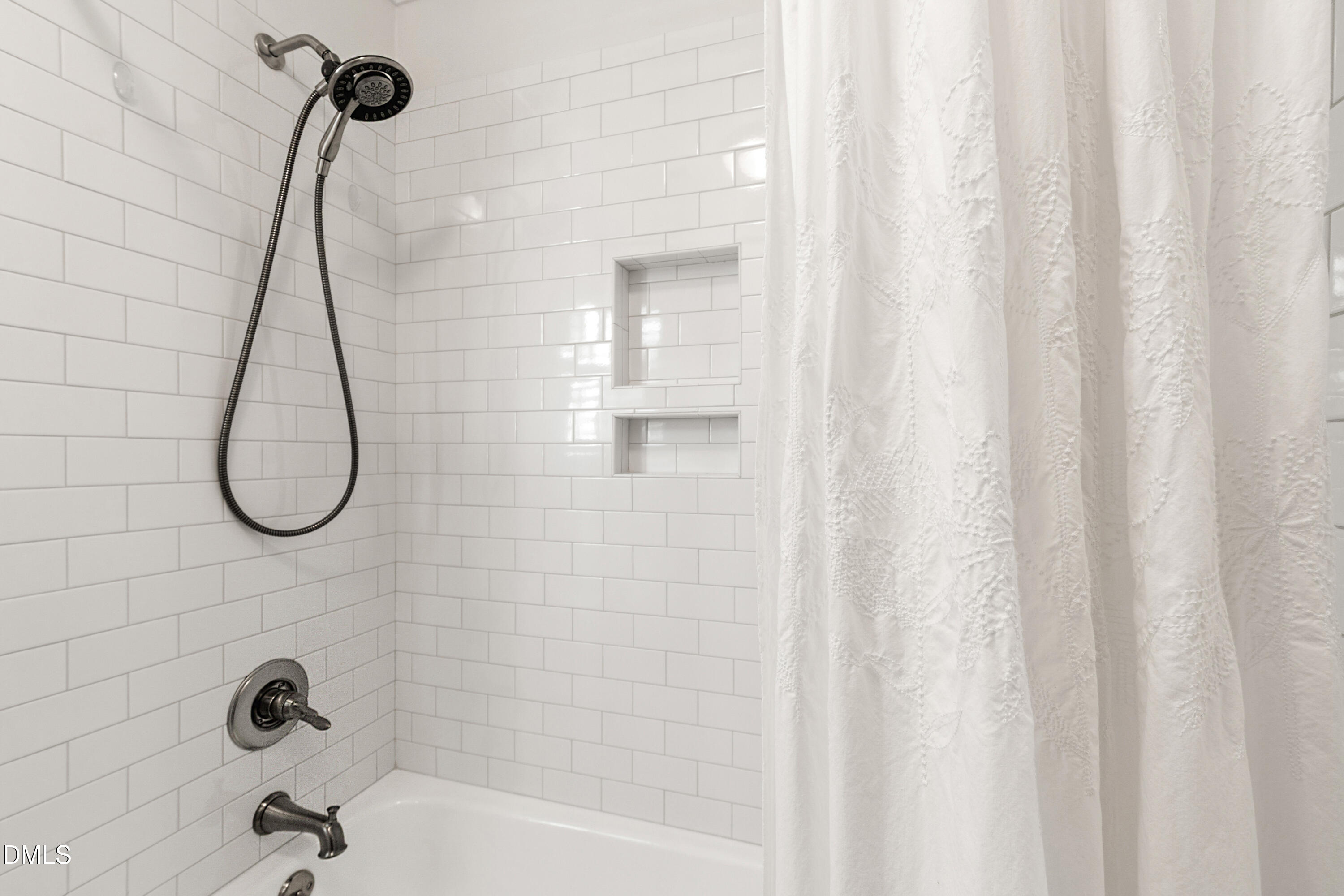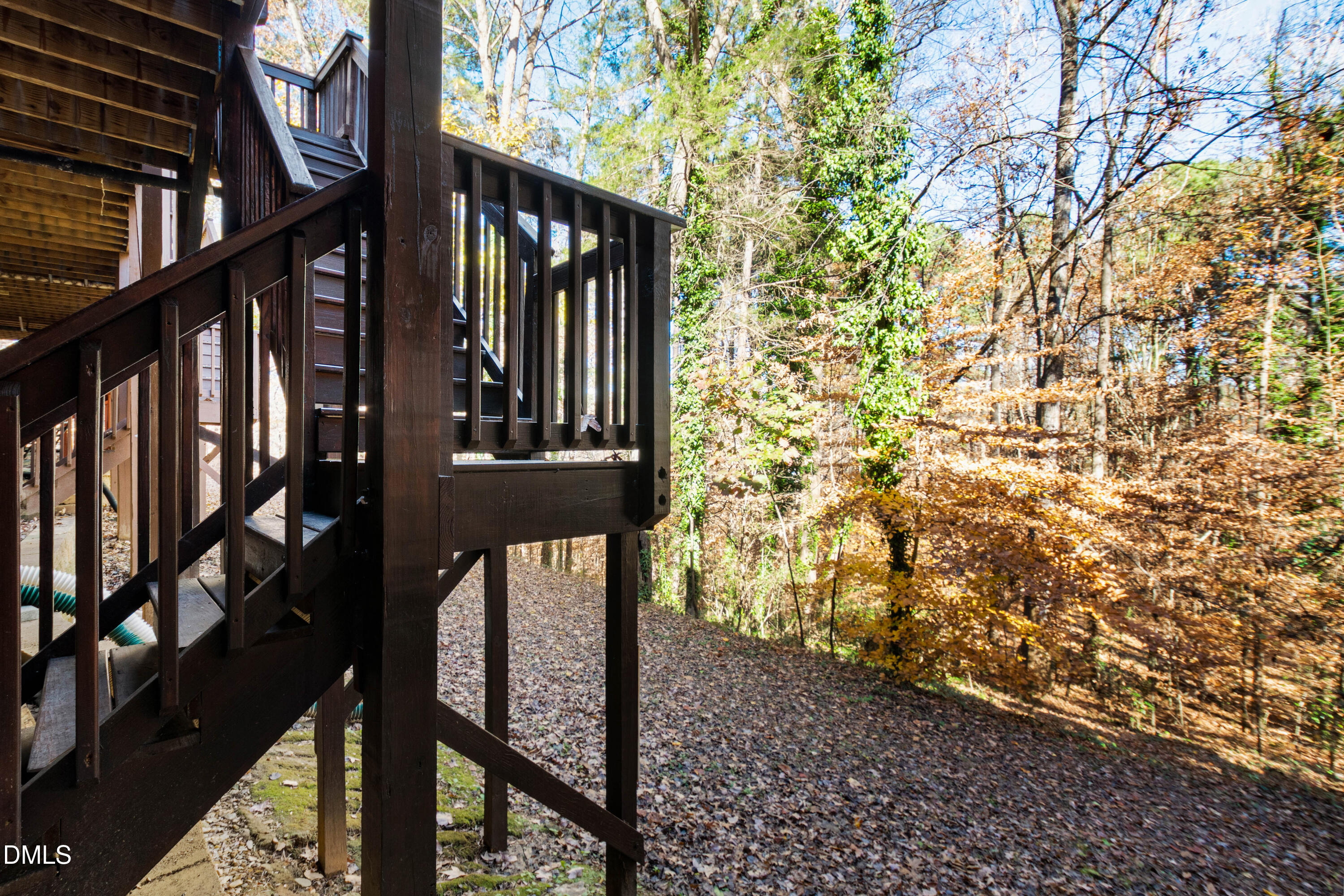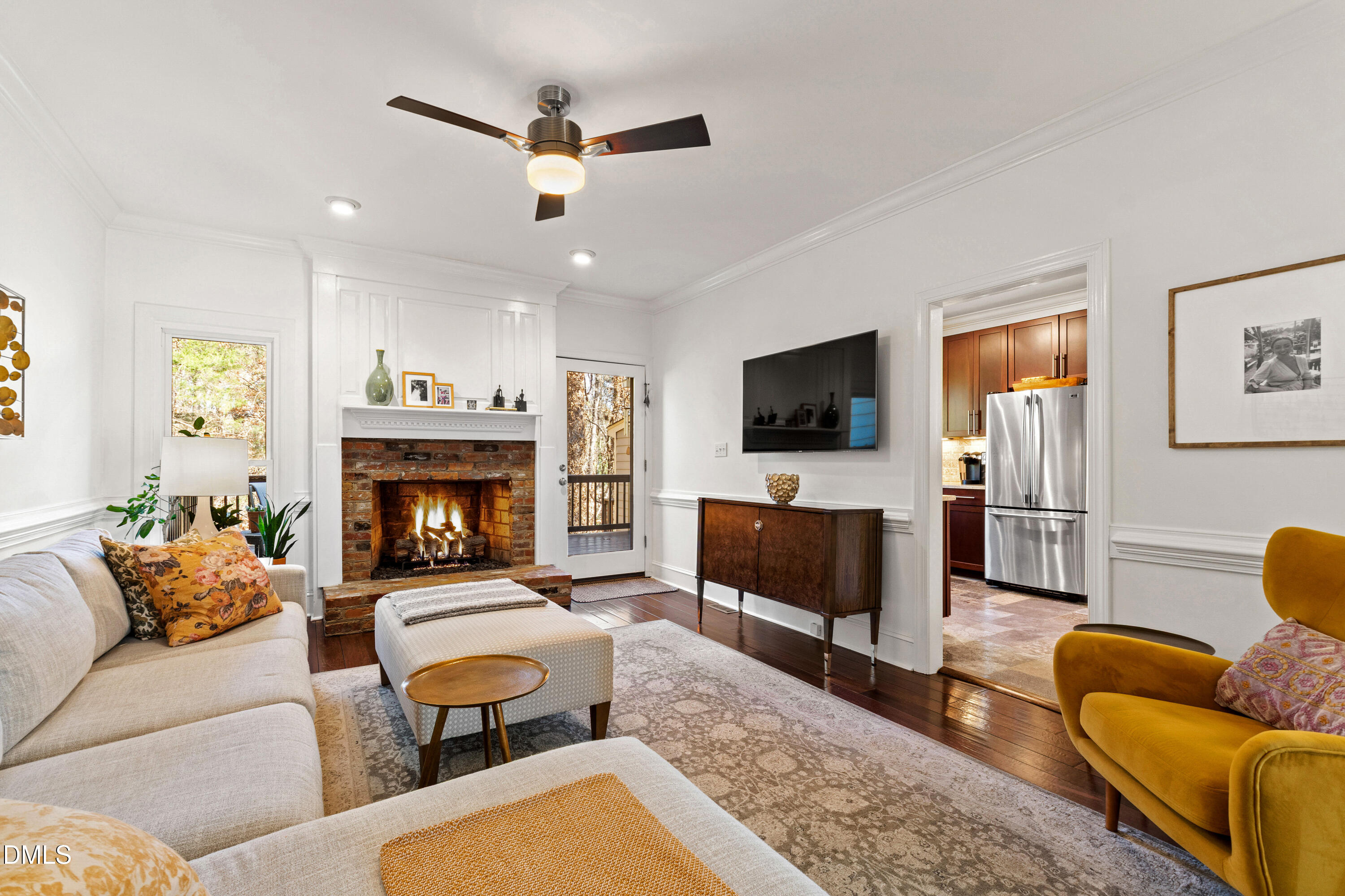 Welcome home to 6840 Gloucester Road--an inviting and beautifully maintained townhome tucked away in one of Raleigh's most convenient locations. This two-bedroom, two-and-a-half-bath home offers thoughtfully updated interiors, comfortable living spaces, and a charming natural backdrop. Enjoy a welcoming brick front porch with room for seating, perfect for soaking up sunshine even on cooler days. Step inside to a cozy living room centered around a classic brick gas-log fireplace, perfect for relaxing evenings at home. A separate dining room flows into the kitchen which is outfitted with a four-burner gas range, built-in microwave, Bosch dishwasher, pantry, granite countertops, and a stylish tile backsplash. The primary suite features a walk-in closet and a walk-in shower, while all bathrooms throughout the home have been refreshed to make every space feel polished and current. Additionally, the custom blinds in the primary bedroom offer both style and light control.