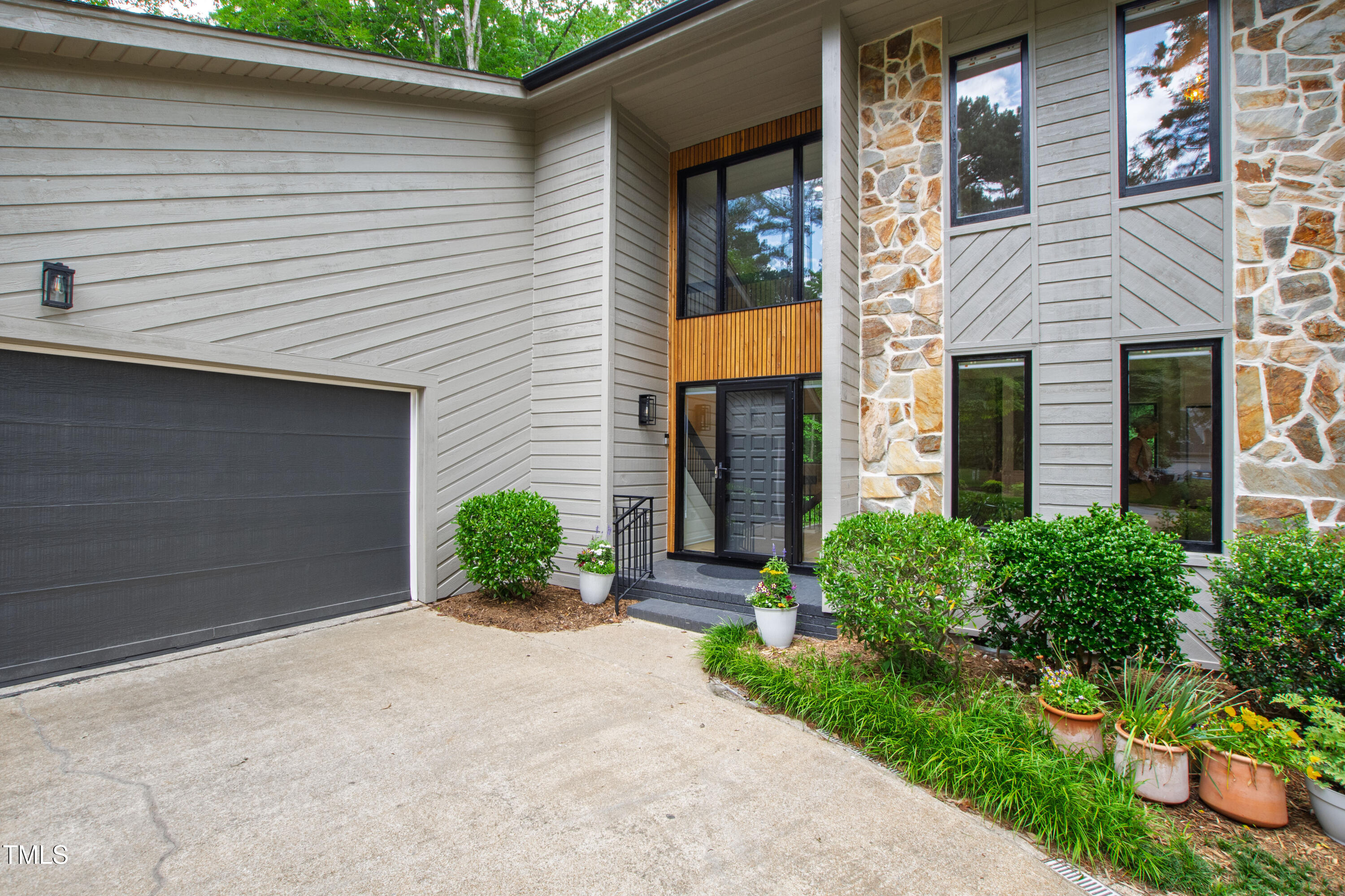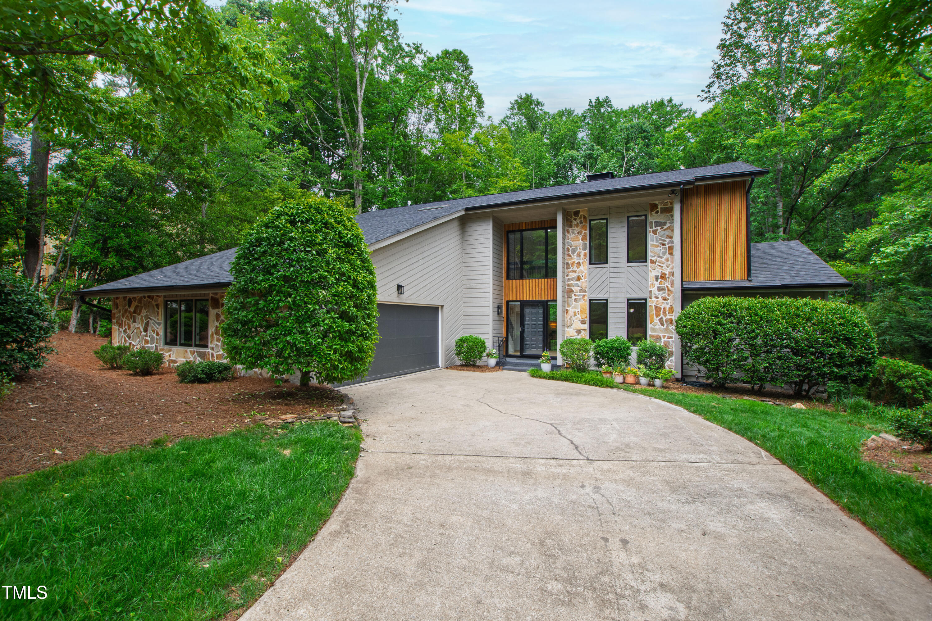 Discover this unique, contemporary home--thoughtfully designed with soaring cathedral ceilings and expansive windows that frame views of the private, wooded backyard. The updated kitchen features elegant dolomite counters with a striking waterfall edge, refaced cabinetry, and all-new hardware. The main-level owner's suite offers a spacious retreat with a large en suite bath, dual vanities, and a generous walk-in shower. With two additional bedrooms and an updated bathroom upstairs, this home is both beautiful and functional. Nearly every corner feels fresh and new. Enjoy the convenience of a two-car garage with ample space for parking and storage. Ideally located near Greystone Swim & Racquet Club, with easy access to premier shopping and dining options, this home is a rare find--blending unique architecture with a coveted location.
