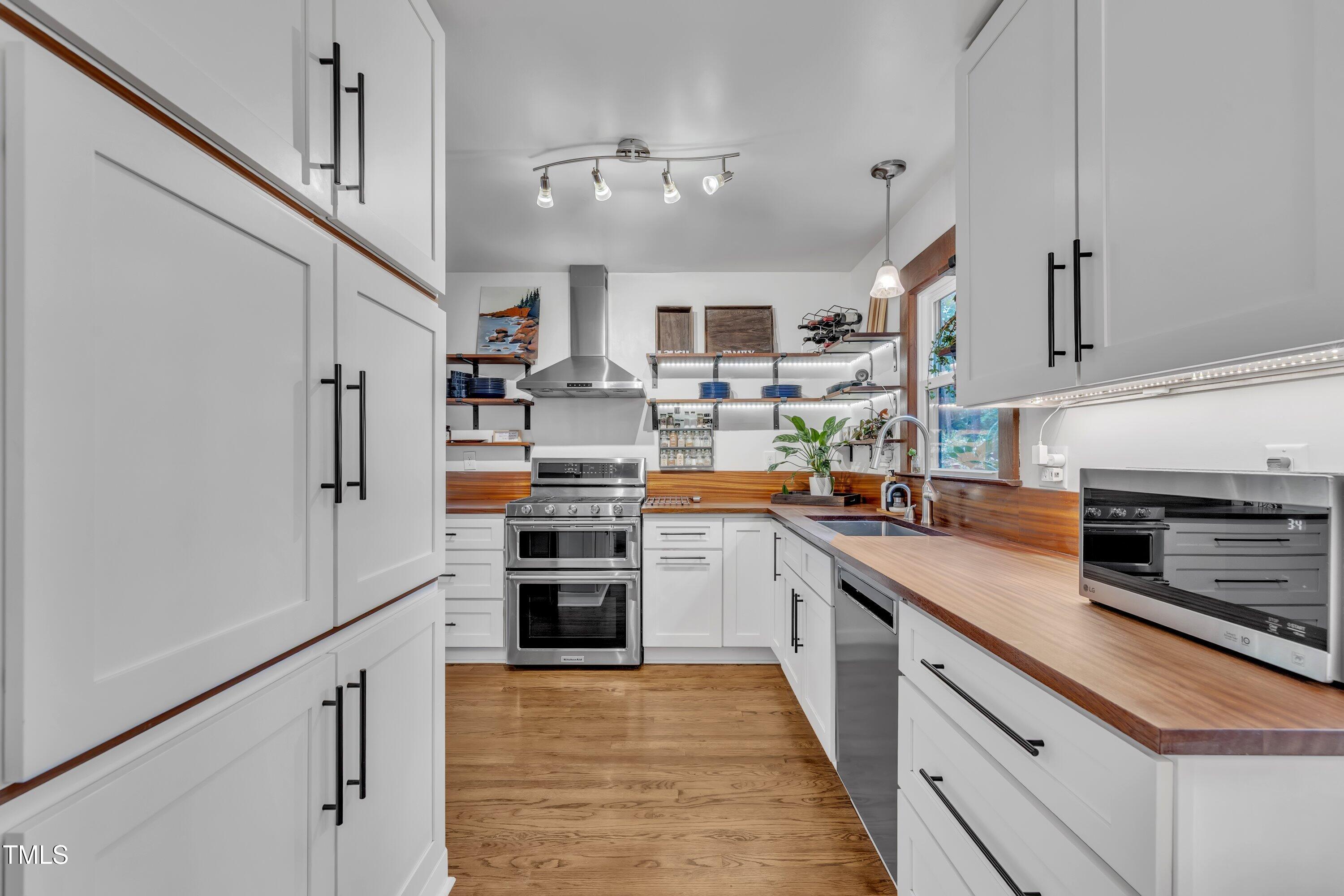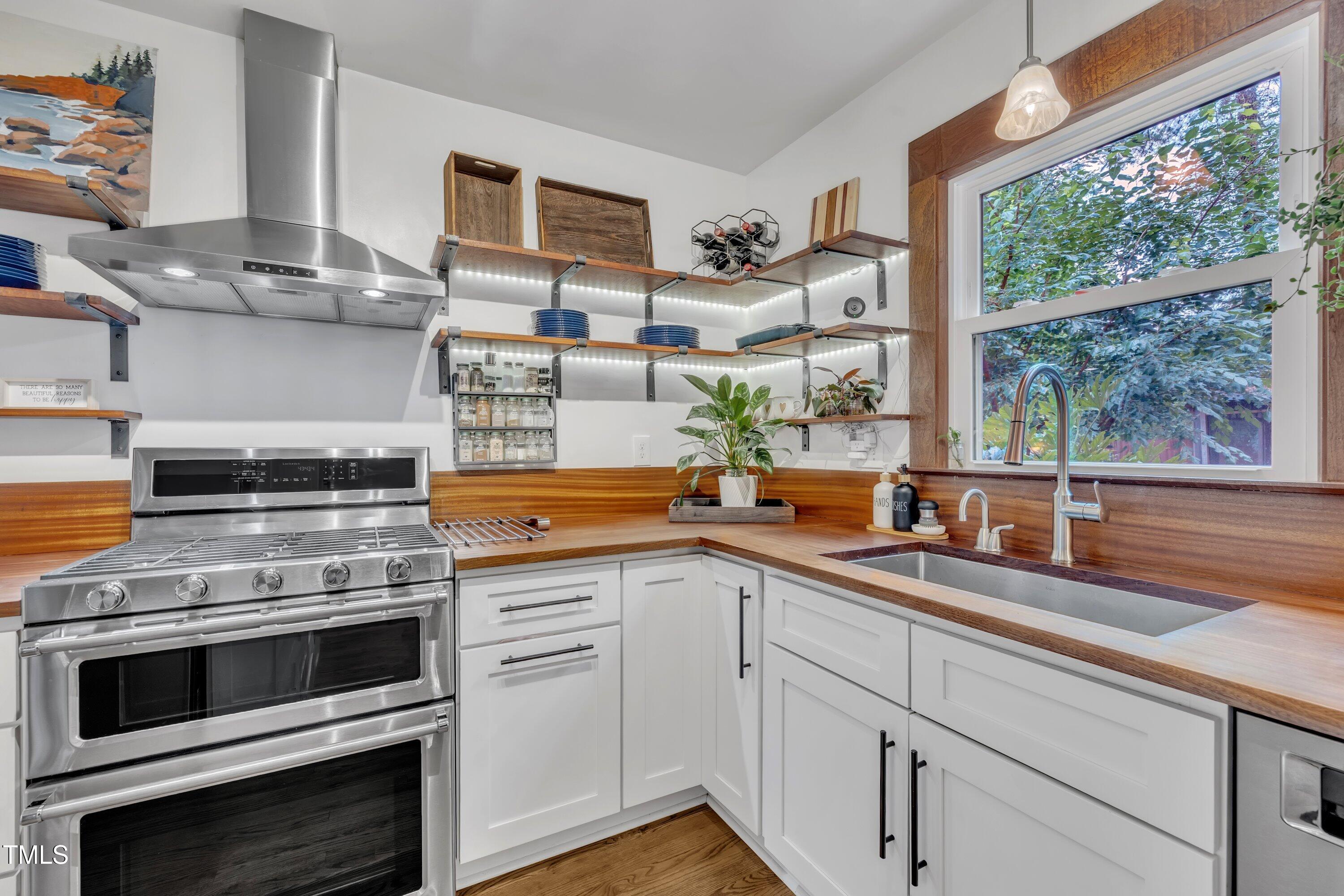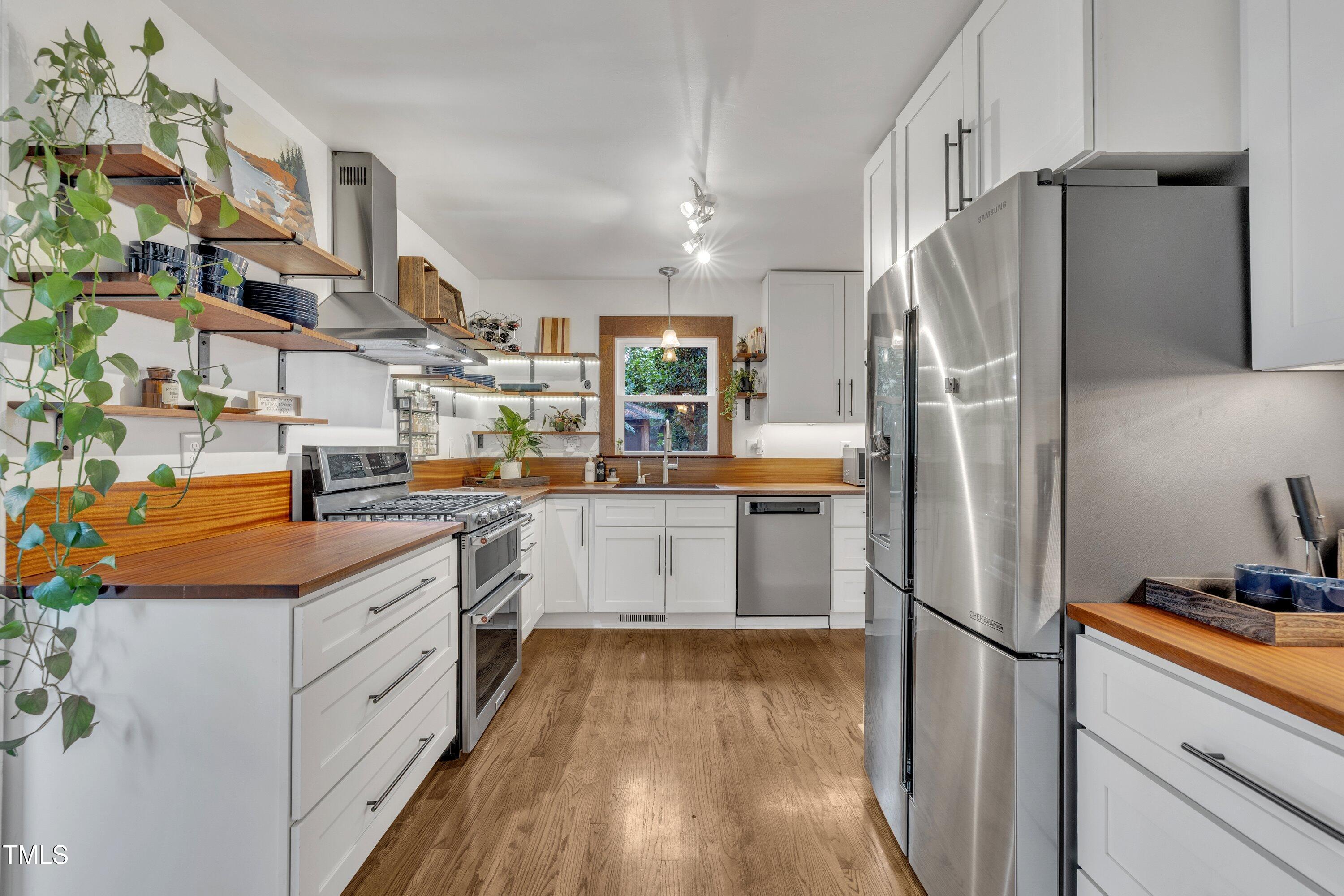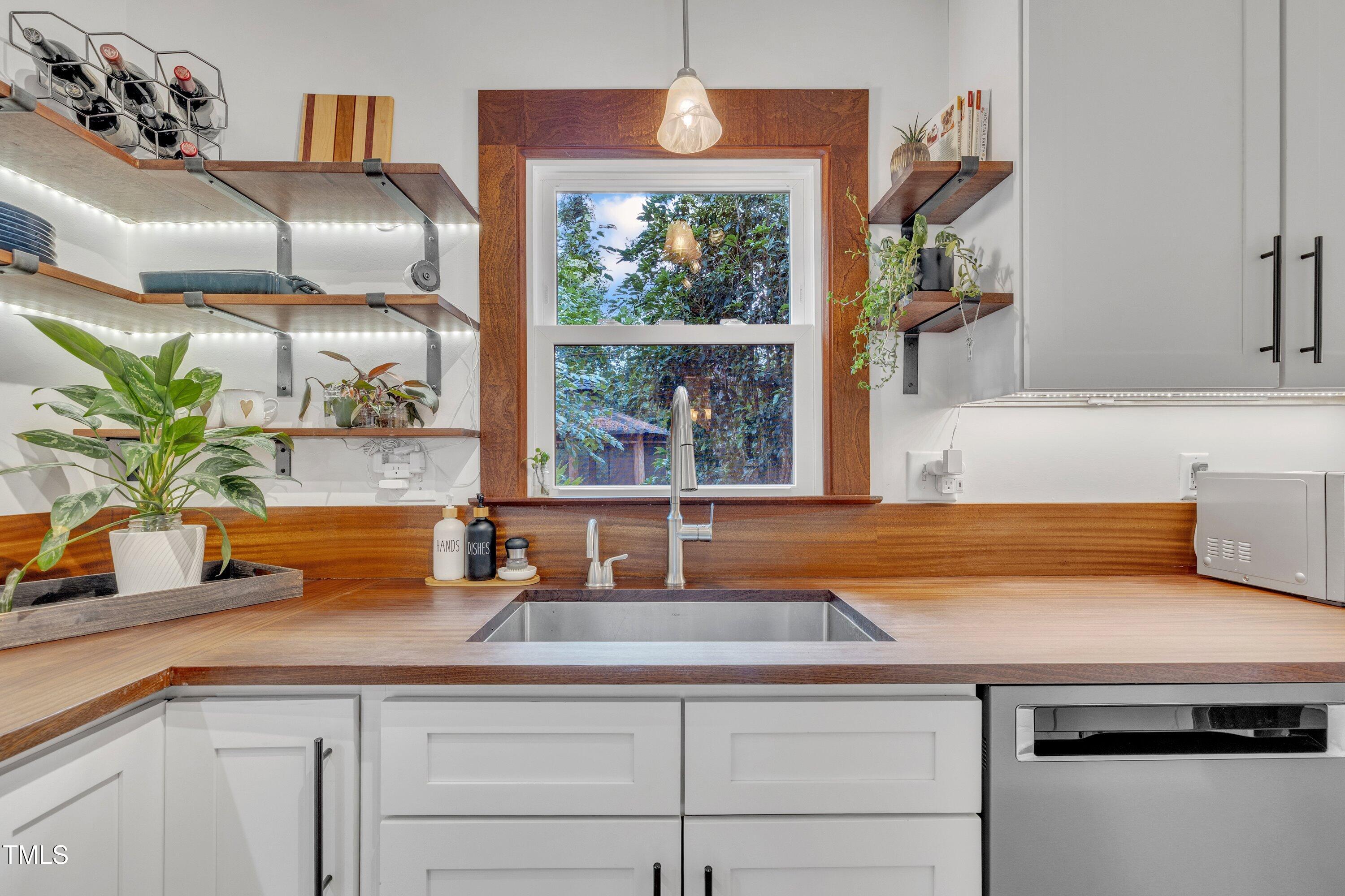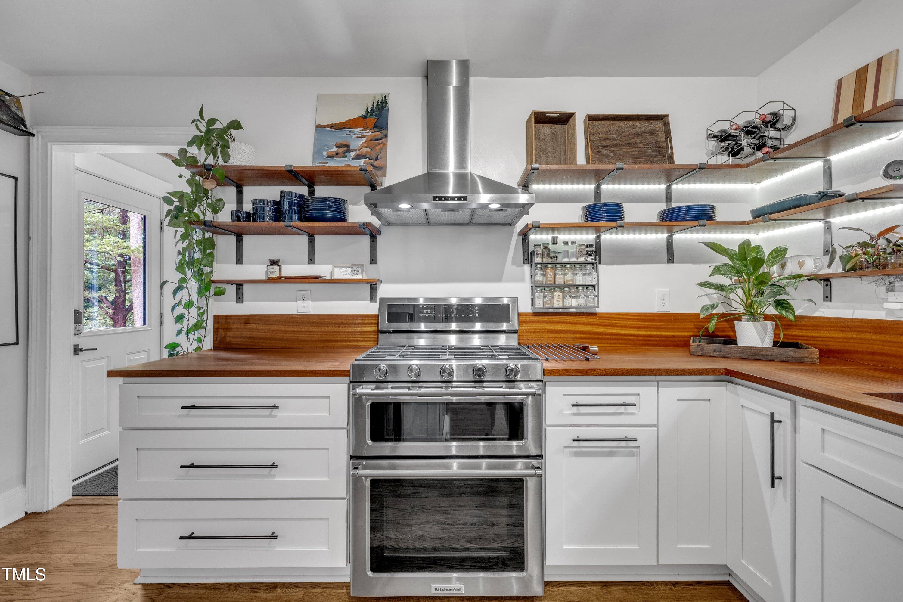 Inside, gleaming hardwood floors flow throughout the main level. The kitchen is a true showstopper with custom open shelving crafted from sapele and a matching sapele mahogany countertop--rich wood tones that pair perfectly with white cabinetry and stainless steel appliances. Just off the side entry, the oversized laundry room offers storage galore--perfect for summer gear or towels after a swim at the nearby YMCA, North Raleigh Swim Club, or Life Time Fitness.