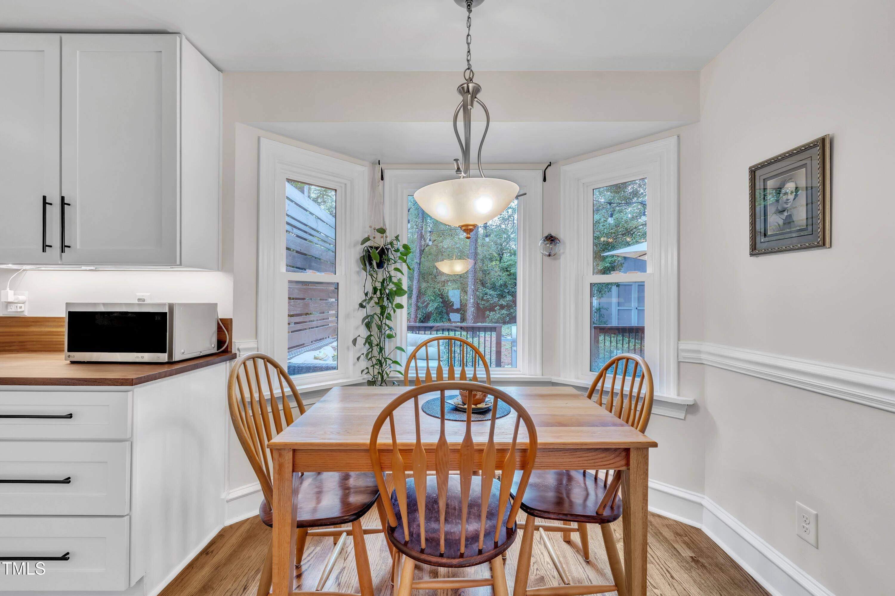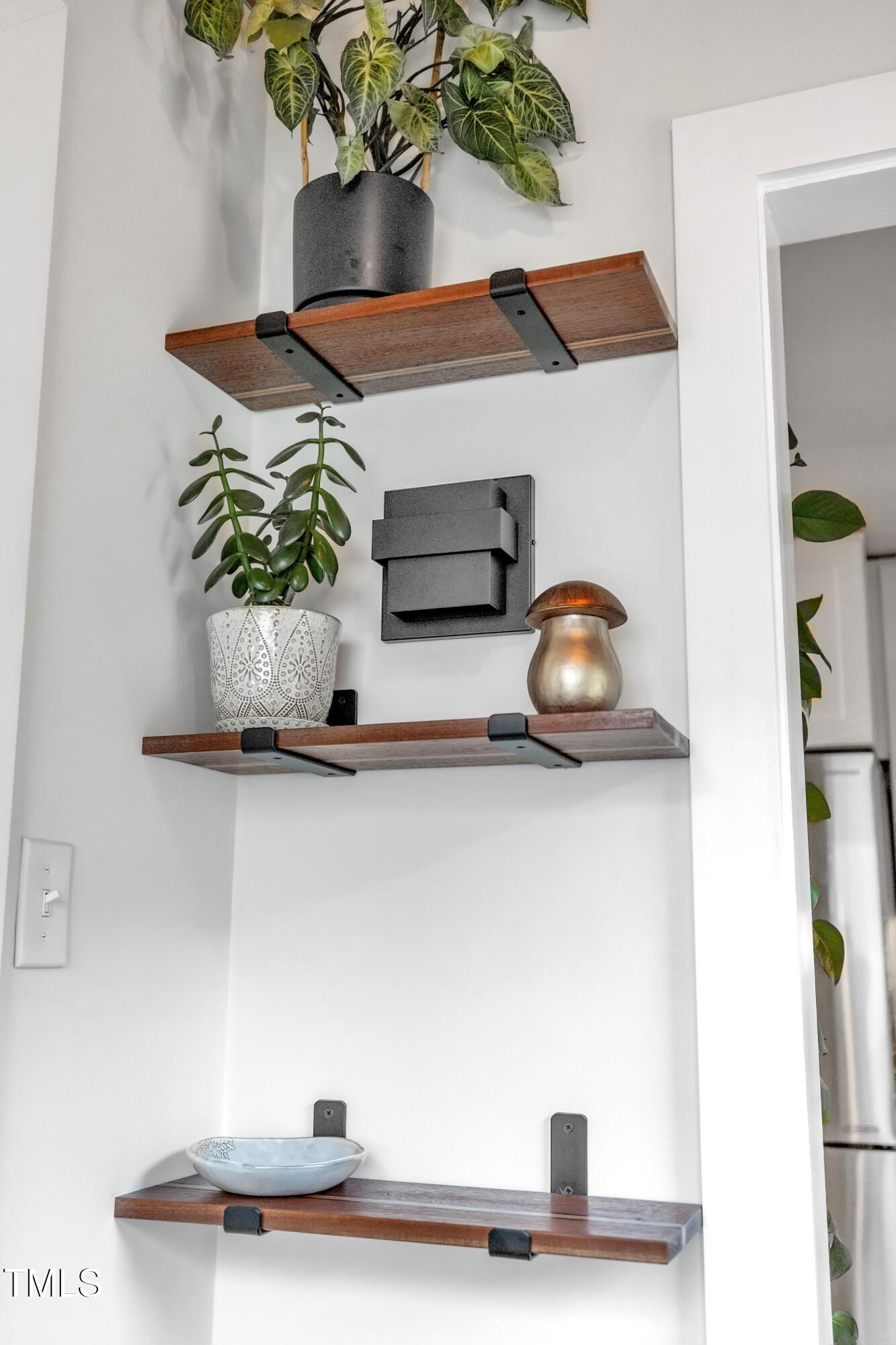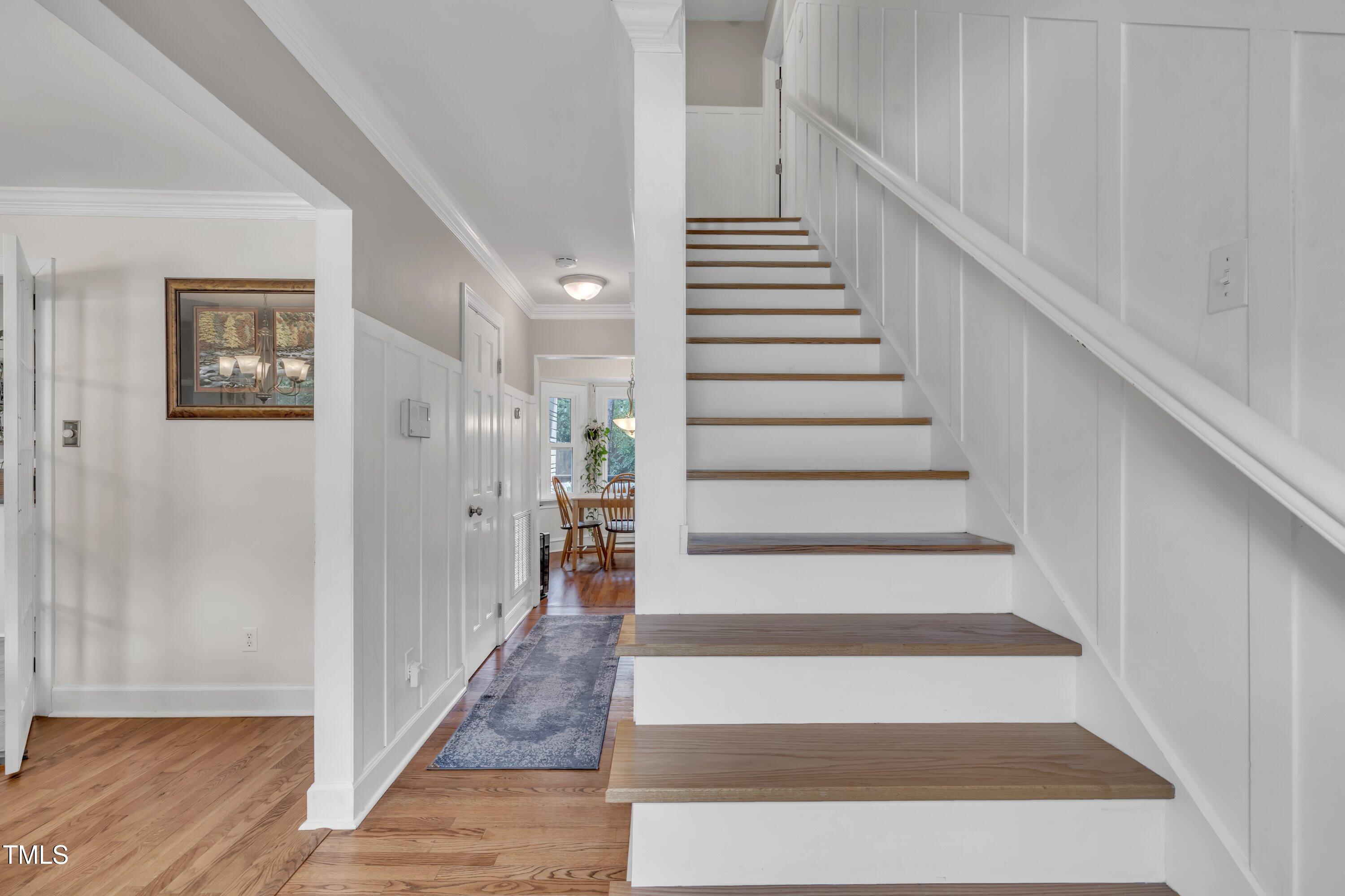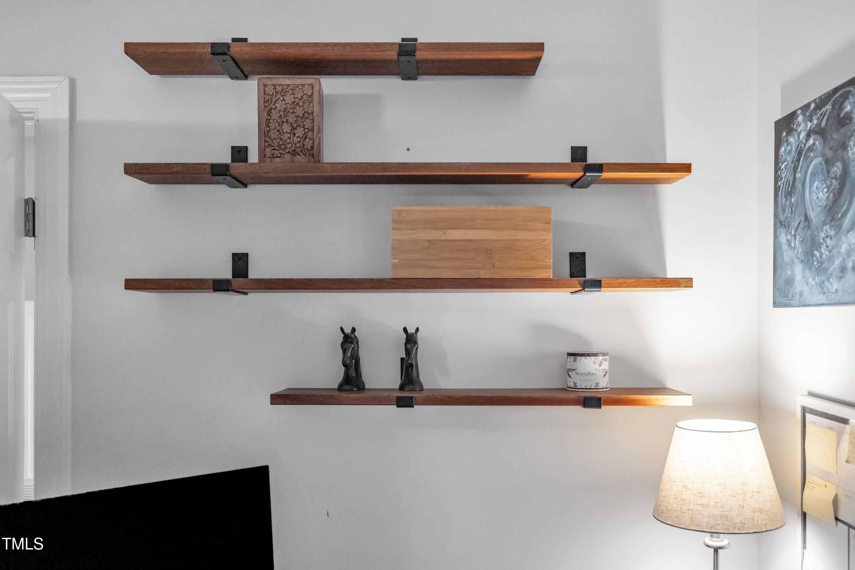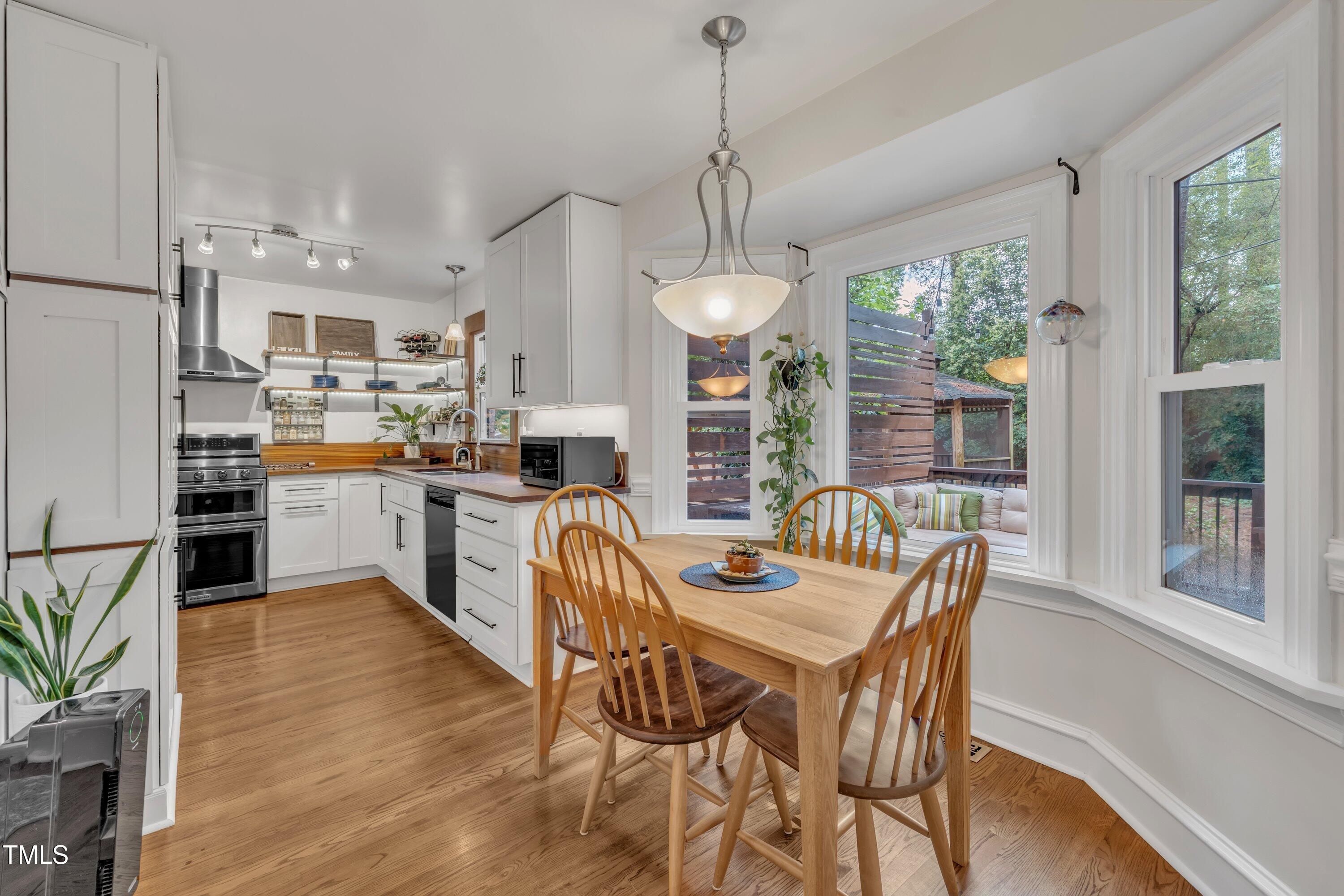 Inside, gleaming hardwood floors flow throughout the main level. The kitchen is a true showstopper with custom open shelving crafted from sapele and a matching sapele mahogany countertop--rich wood tones that pair perfectly with white cabinetry and stainless steel appliances. Just off the side entry, the oversized laundry room offers storage galore--perfect for summer gear or towels after a swim at the nearby YMCA, North Raleigh Swim Club, or Life Time Fitness.