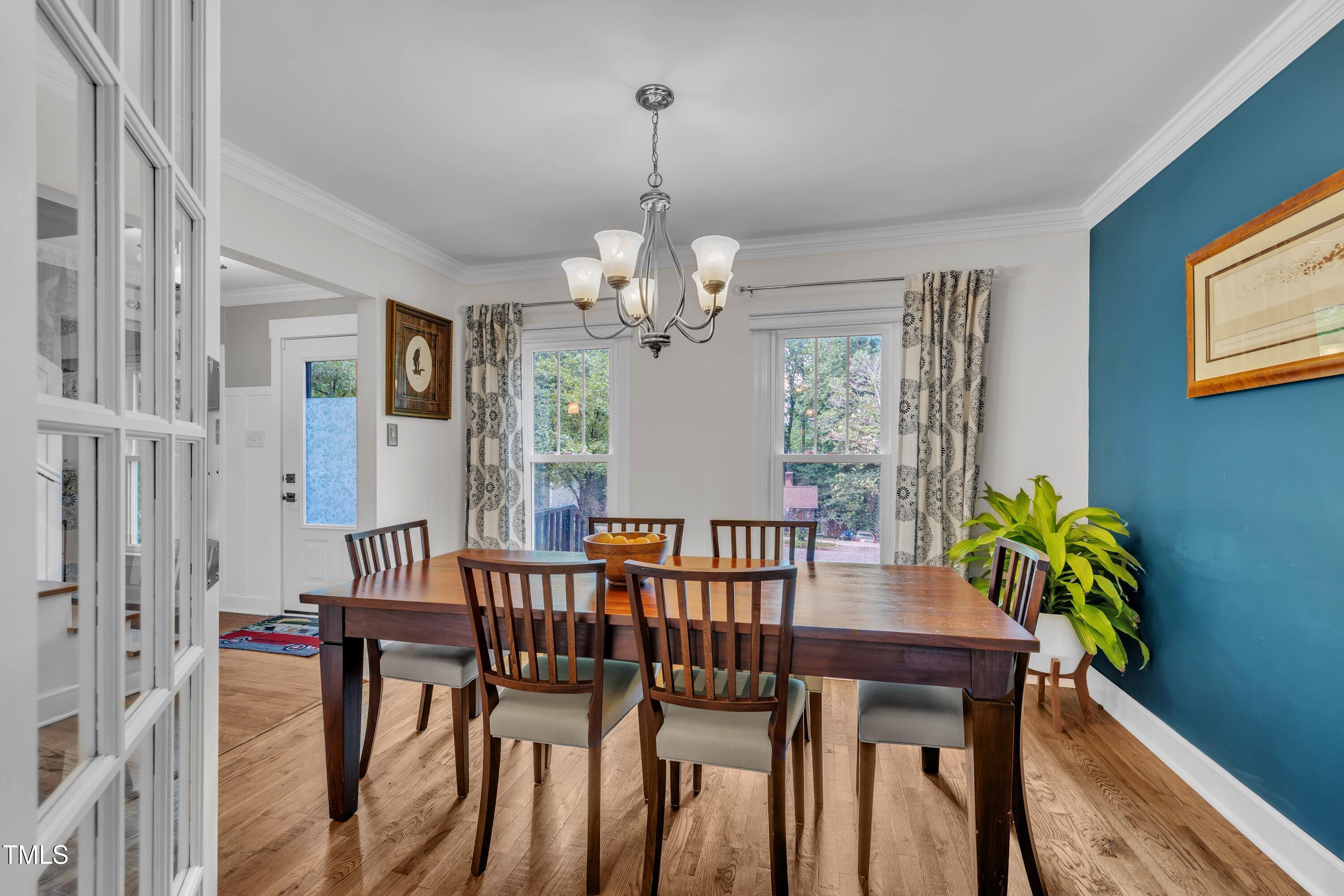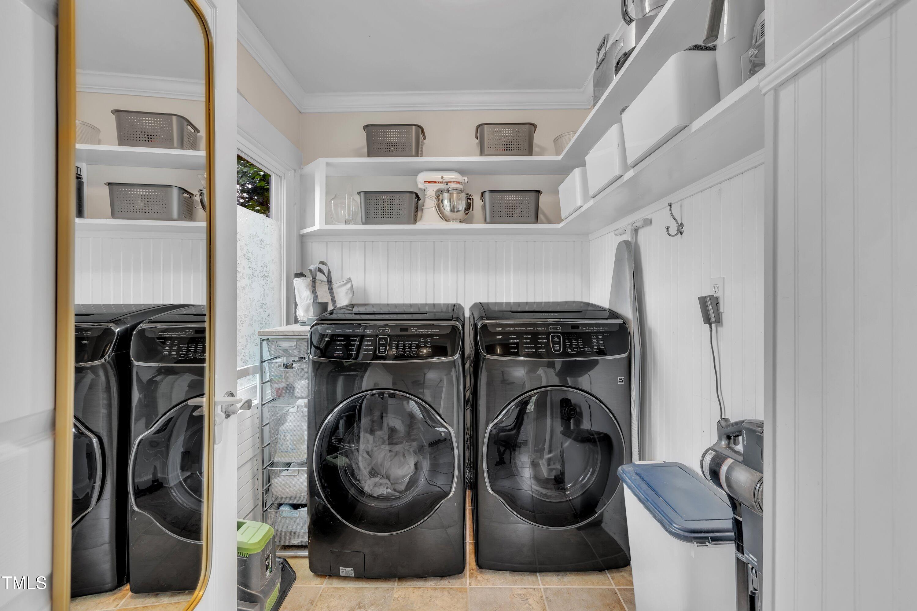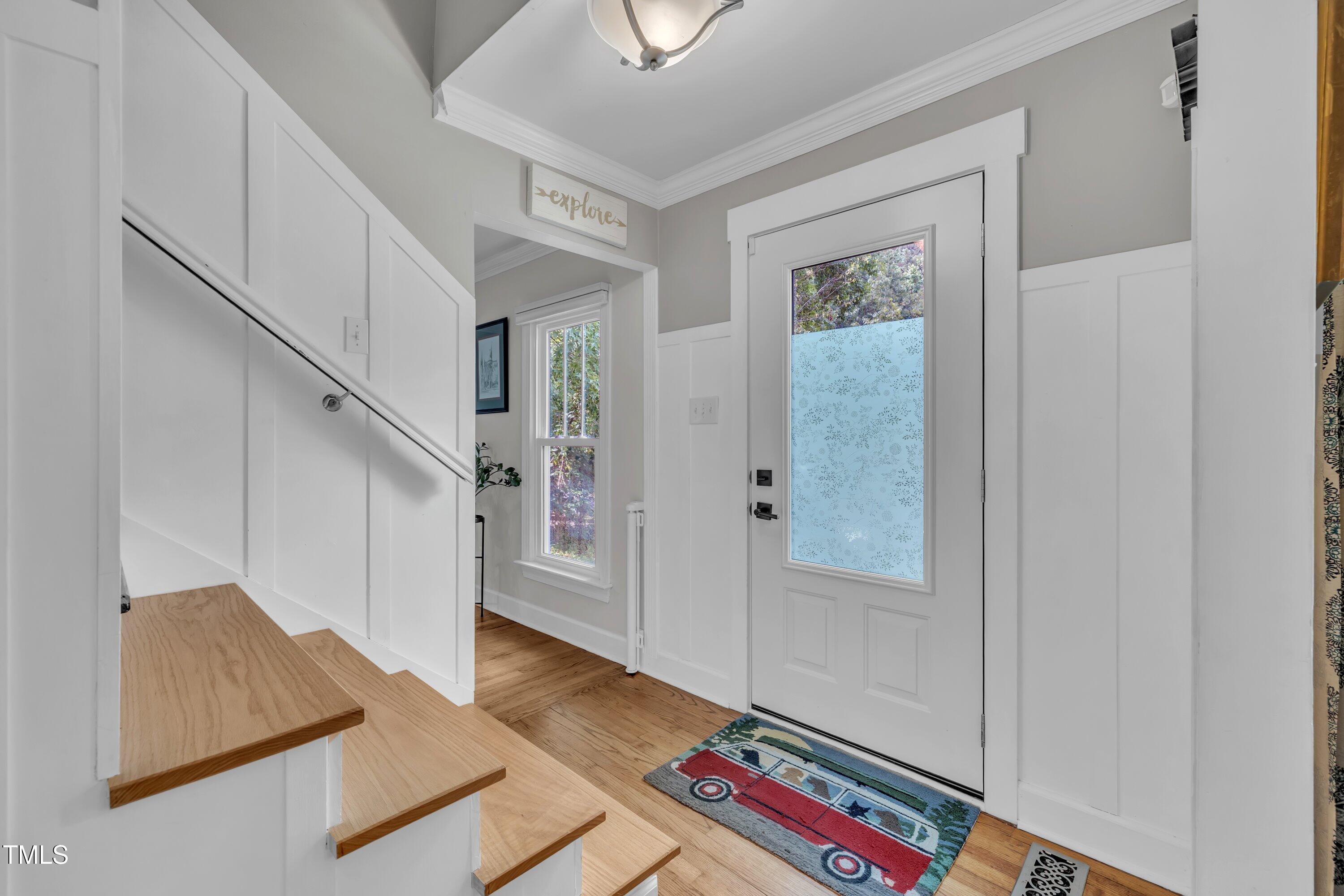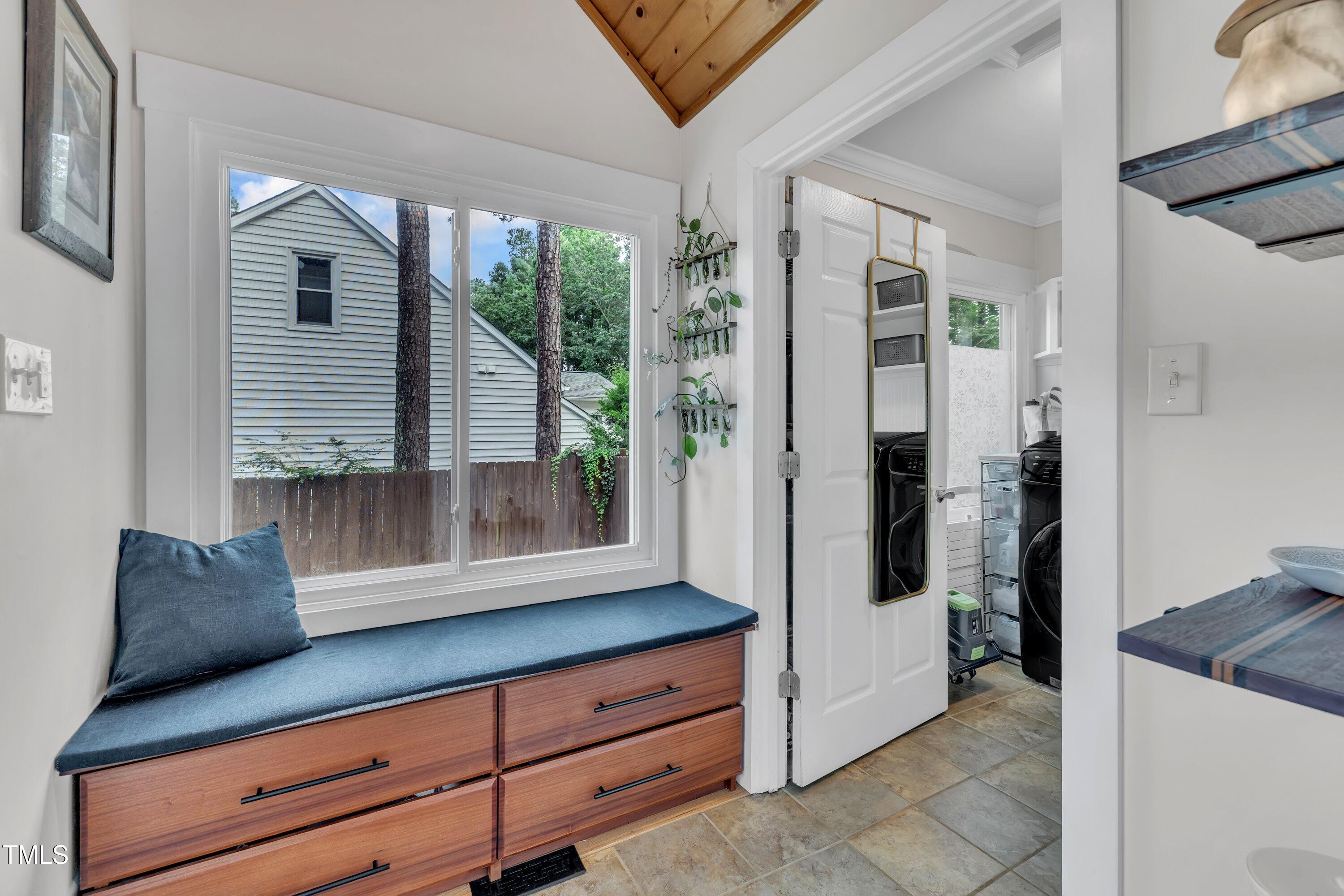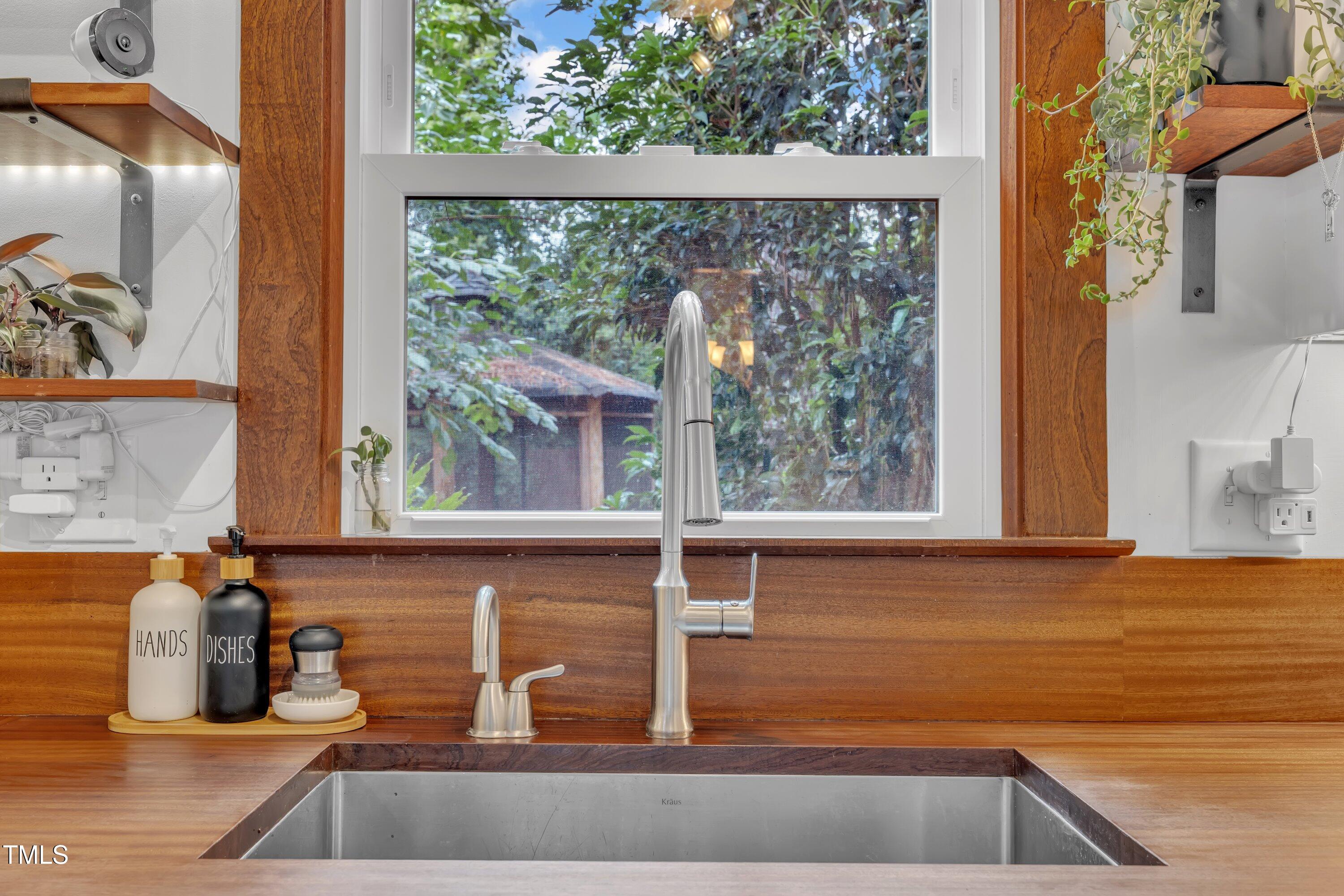 Inside, gleaming hardwood floors flow throughout the main level. The kitchen is a true showstopper with custom open shelving crafted from sapele and a matching sapele mahogany countertop--rich wood tones that pair perfectly with white cabinetry and stainless steel appliances. Just off the side entry, the oversized laundry room offers storage galore--perfect for summer gear or towels after a swim at the nearby YMCA, North Raleigh Swim Club, or Life Time Fitness.