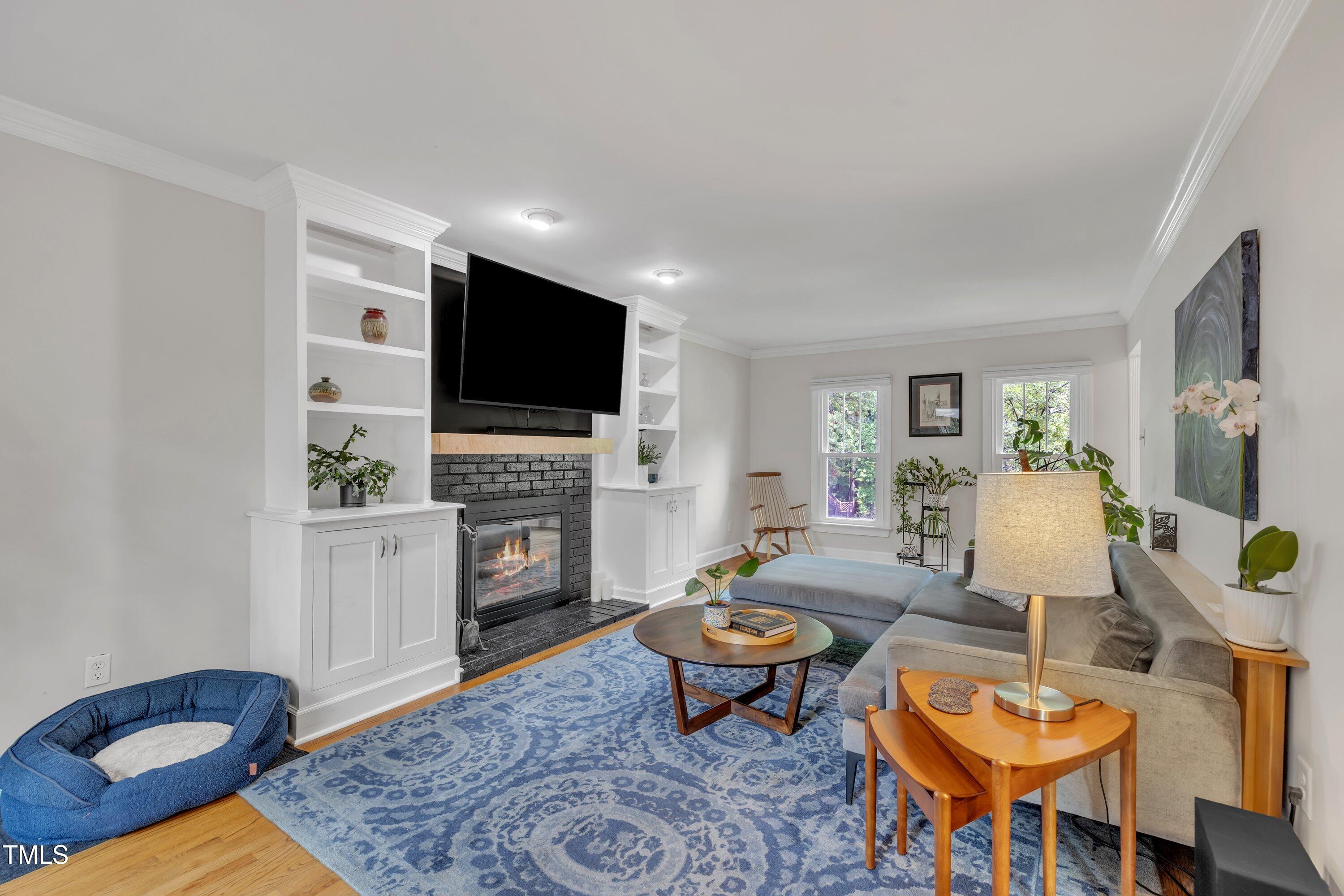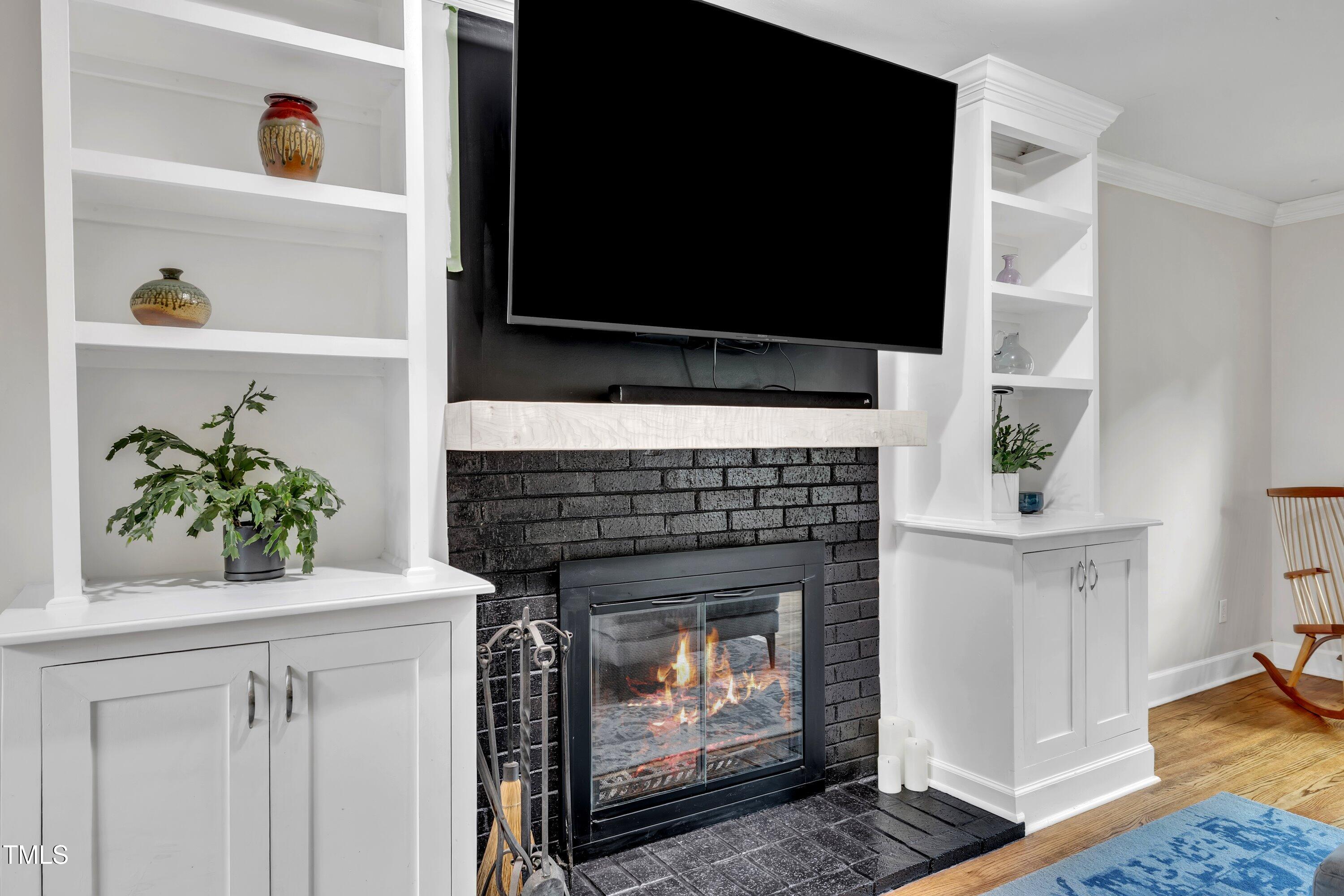 The spacious family room features a painted brick fireplace, built-in shelves, and a custom quilted maple mantle--cozy in winter, cool in the A/C during summer movie nights. Upstairs, red oak stairs lead you to three generous bedrooms with custom closets and two stylishly updated baths. The primary suite includes a tiled walk-in shower and double vanity, creating a spa-like retreat.