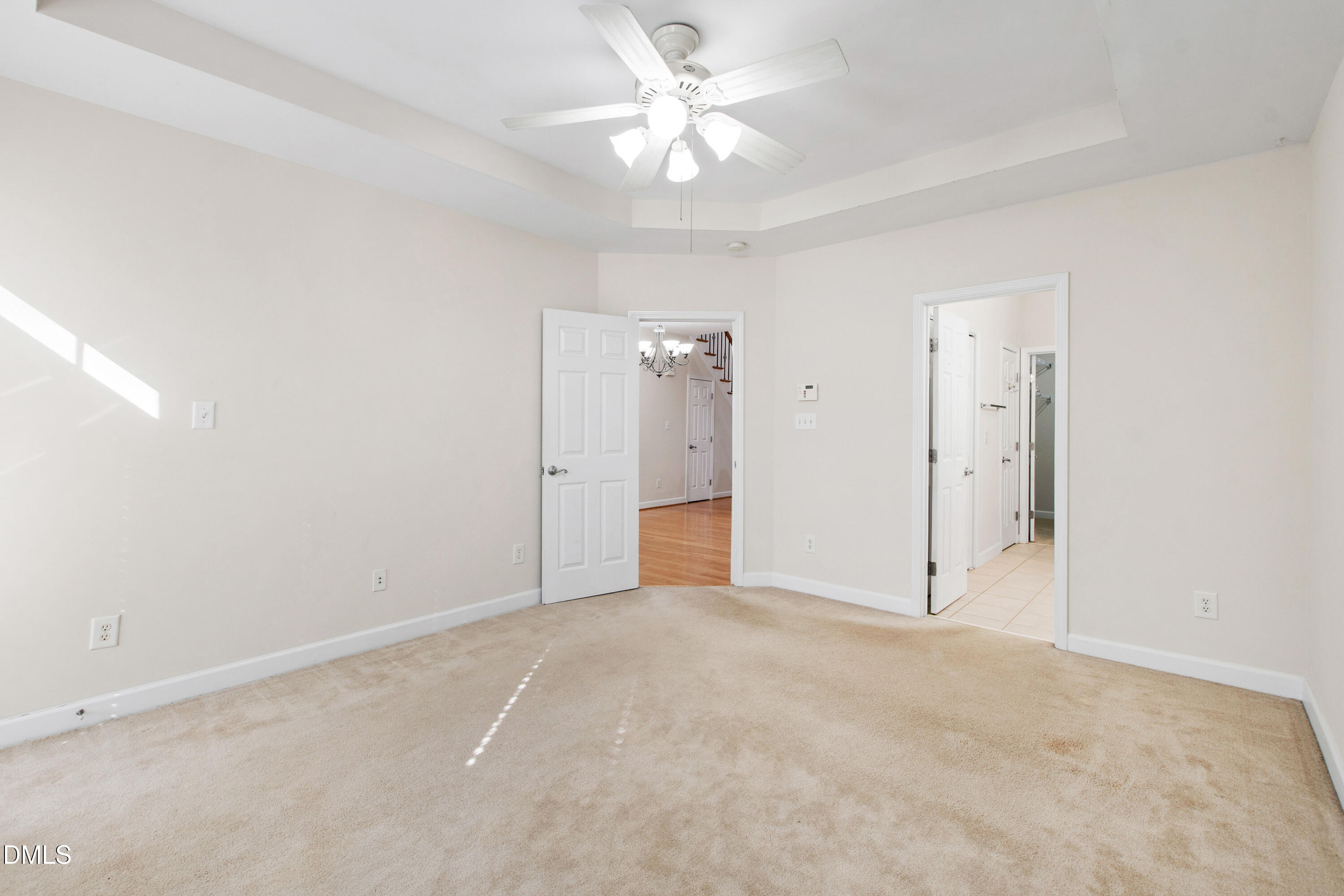 Awesome Allyn's Landing end-unit townhouse with first-floor primary suite! Features include open floor plan; primary bathroom with double vanity, oversized walk-in shower, water closet and large walk-in closet; nine-foot ceilings downstairs; plantation blinds throughout; two enormous bedrooms upstairs with Jack-and-Jill bathroom; tons of storage throughout; patio; two-car garage. Well maintained. Refrigerator, washer and dryer convey. Convenient North Raleigh location near Target, Chick-fil-A, Home Depot, Whole Foods, I-540 and more!