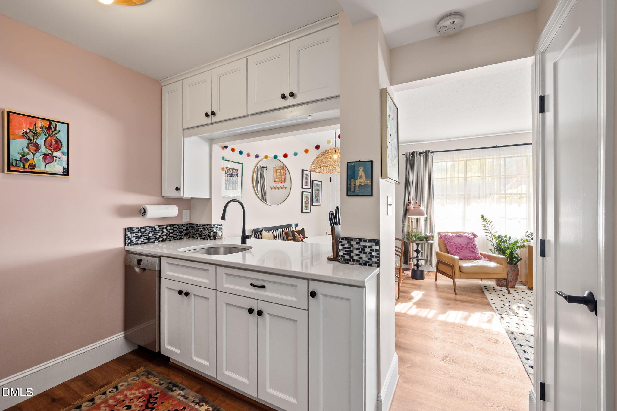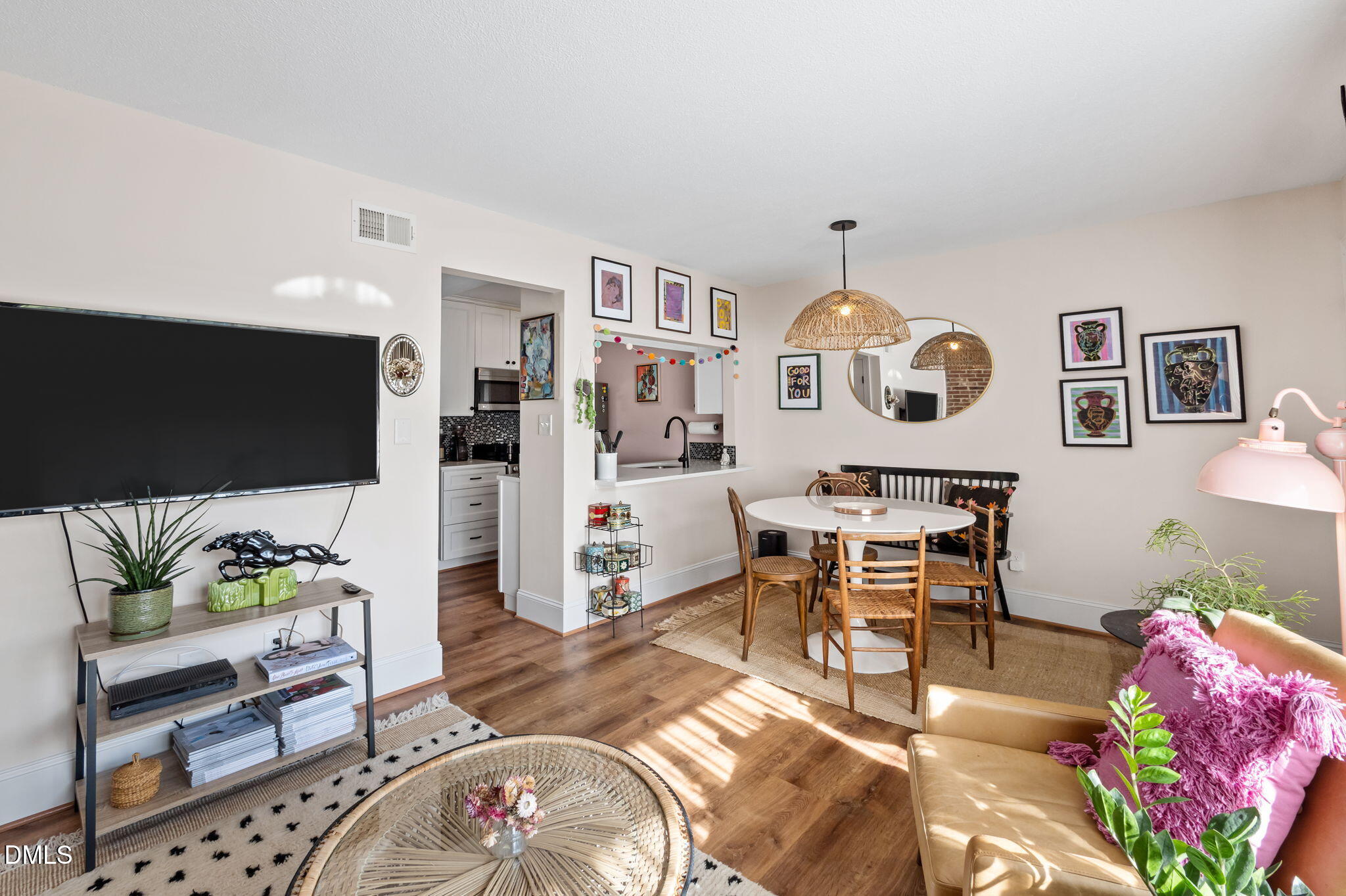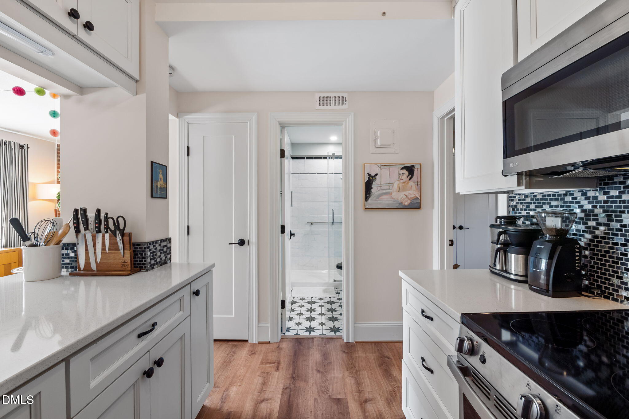 Pearl Mill Flats offers an unbeatable downtown Durham location, walkable to restaurants, bars, the Durham Farmers Market, yoga studios, and just minutes from the DPAC, Duke University and Duke Hospital. This is one of the few condo communities that permits short-term rentals without limits, creating a rare opportunity for Airbnb, mid-term, or long-term investment potential. This impeccably renovated unit was fully updated in 2020, with improved kitchen countertops, cabinetry, appliances, bathroom, flooring, and thoughtfully improved closet storage. Behind secure gated entrances, discover an unexpected urban oasis with lush landscaping, picnic areas, a saltwater pool, and life-size chess and checkers, ideal for both quiet enjoyment and vibrant community gatherings. South Ellerbe Restoration Project is underway across Trinity Ave.