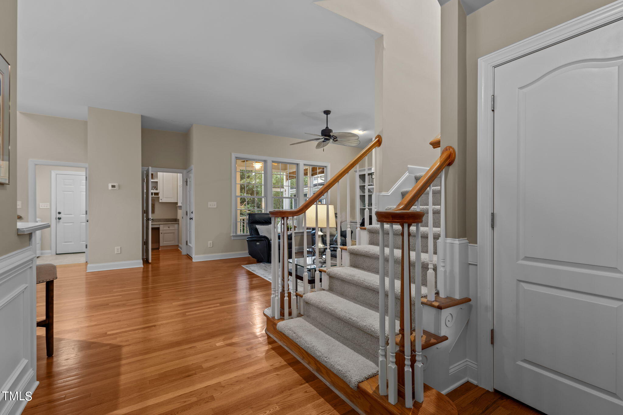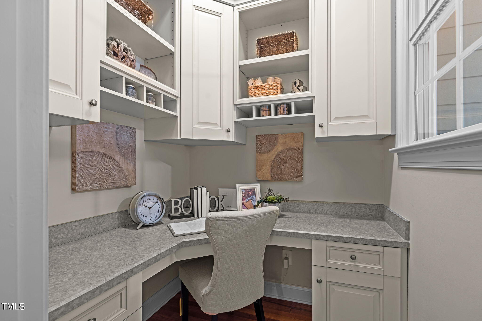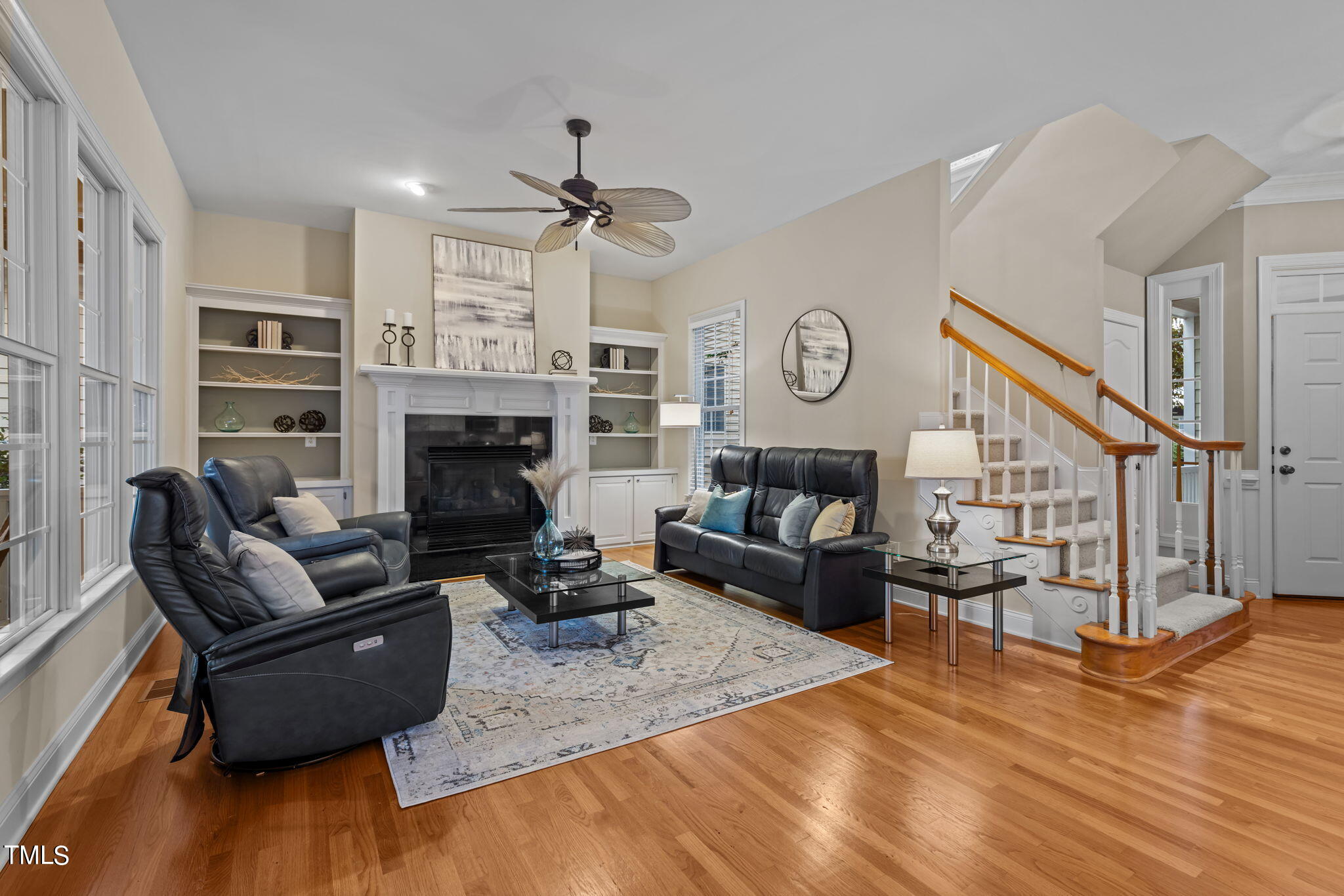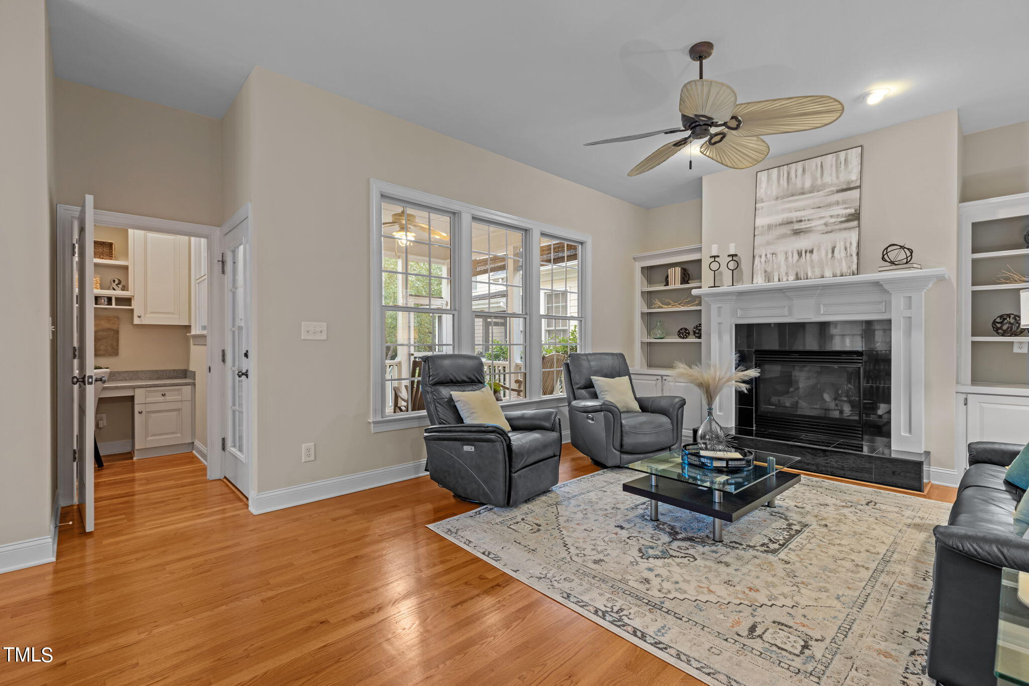 Large family room with custom bookcase surrounding gas fireplace, formal dining room, hardwood floors, and a cute office nook on main! Step outside to the screened-in porch and patio in the back to relax!