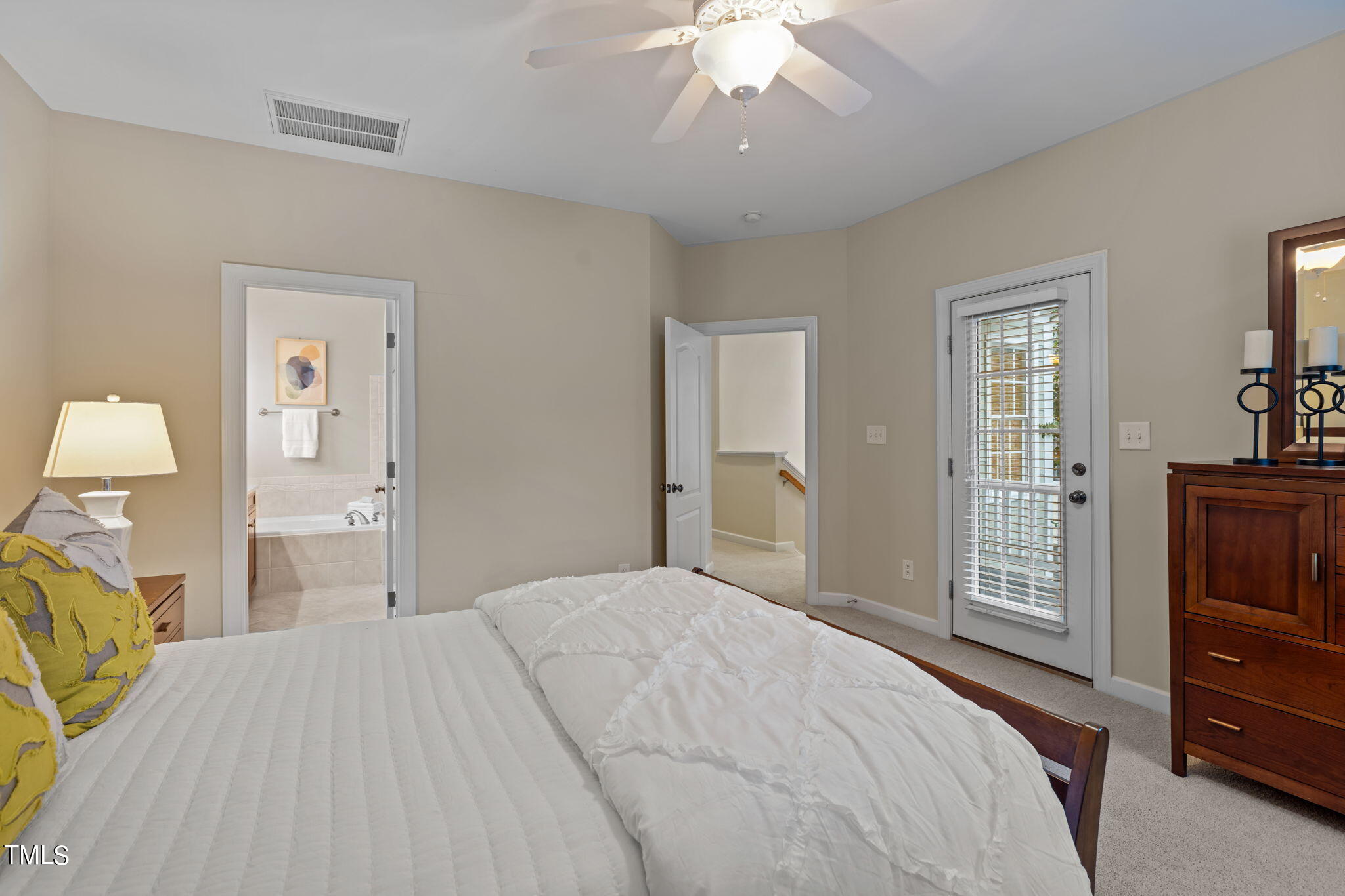 The primary suite includes a private balcony accessible from both the bedroom and the hallway. Additional features include a convenient laundry chute and a brand-new two-car garage door for easy access.