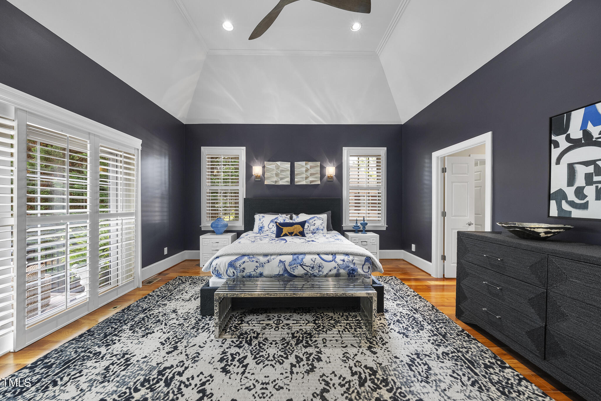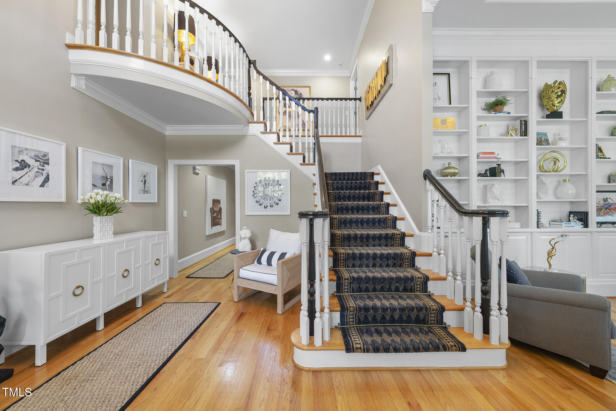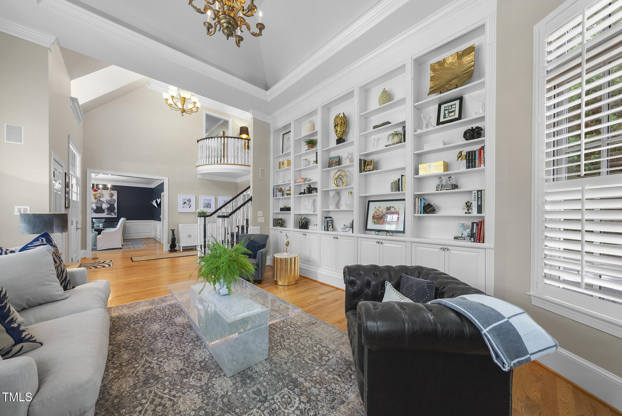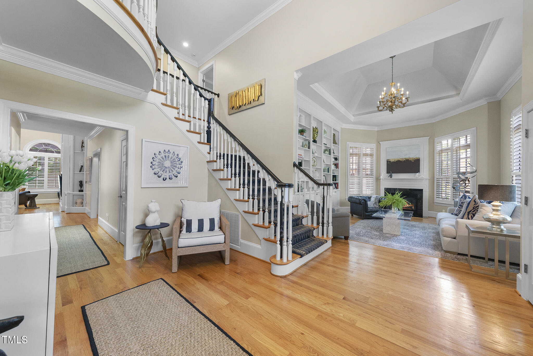 Step inside to a dramatic two-story foyer that sets the tone for the custom details found throughout. The main level features gorgeous hardwood floors, custom plantation shutters, built-in audio and Minka Aire ceiling fans (except for in the sunroom). The cathedral-ceiling study offers a quiet, inspiring workspace with a floor-to-ceiling wall of built-ins and a cozy fireplace.
