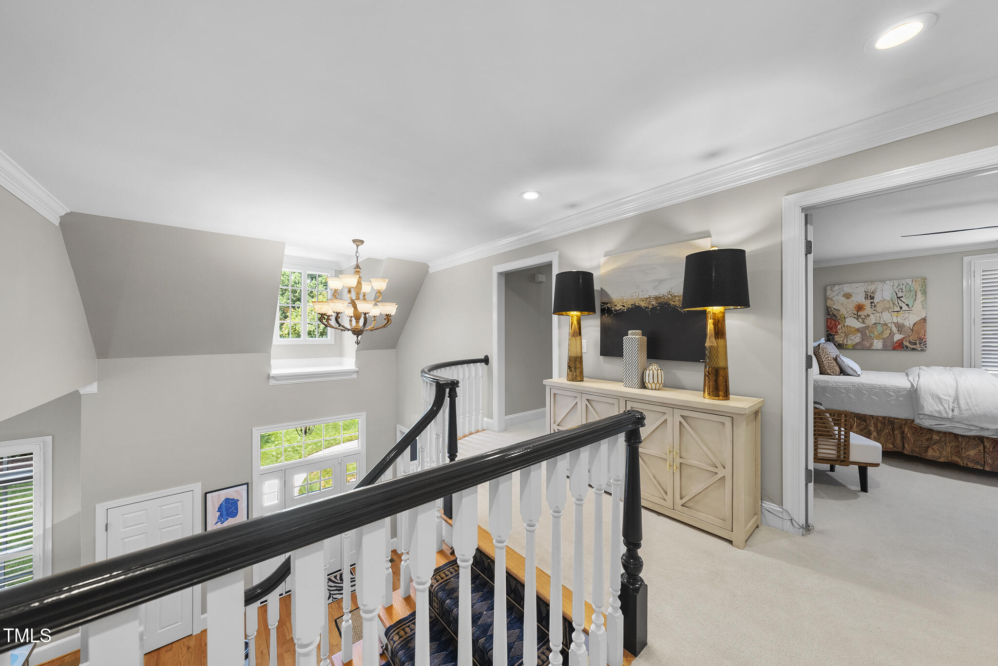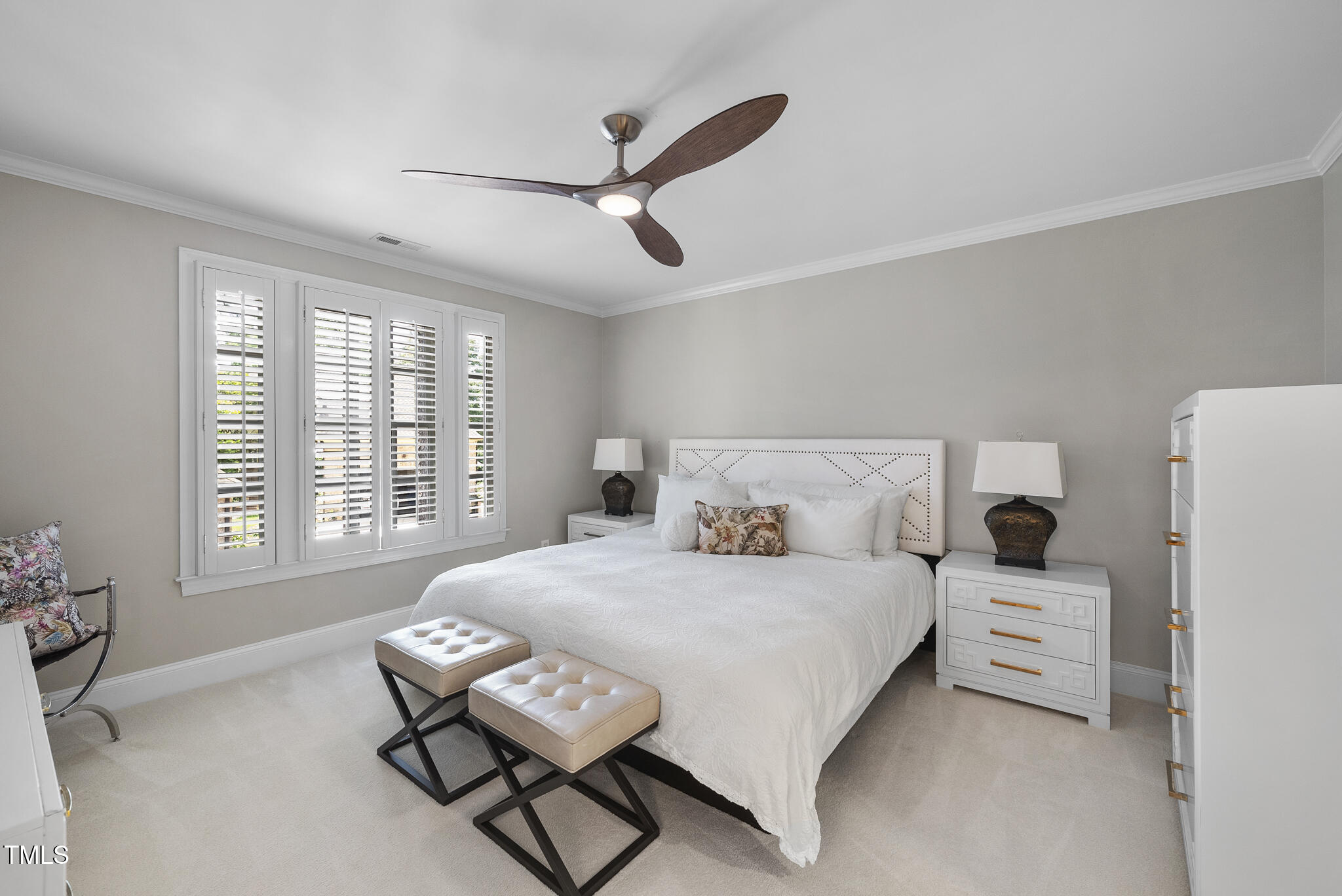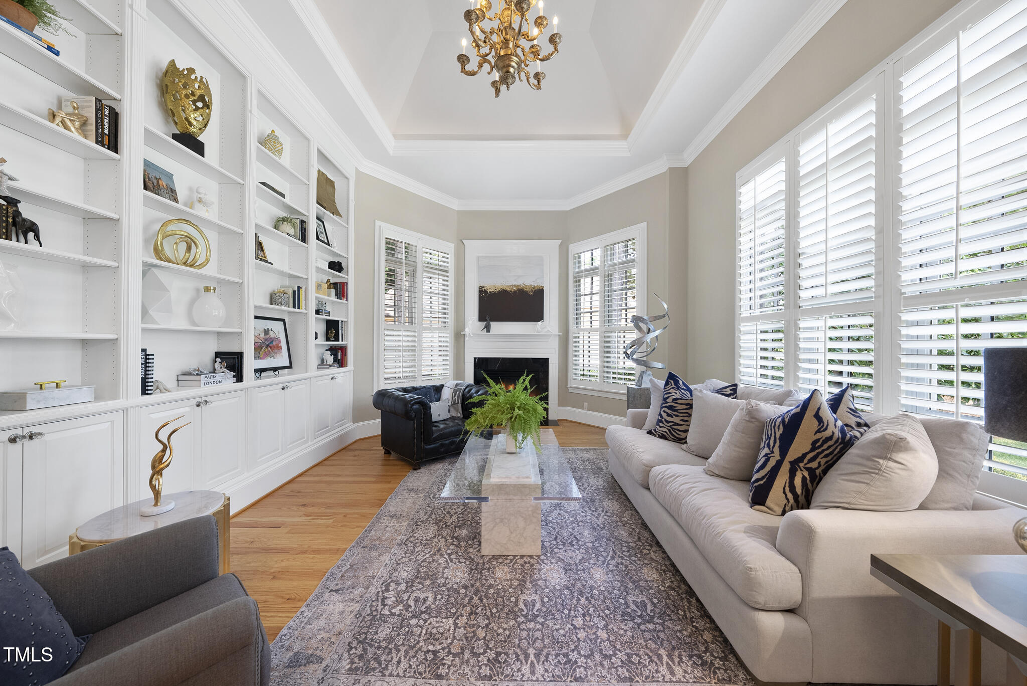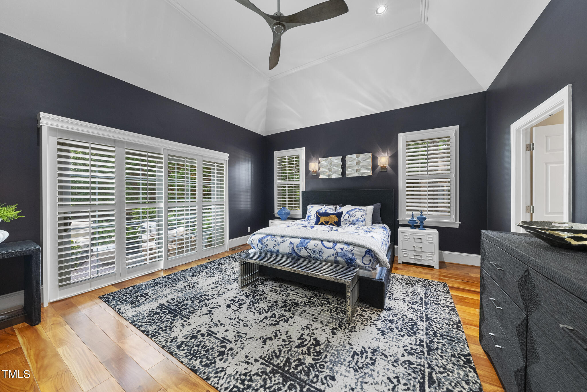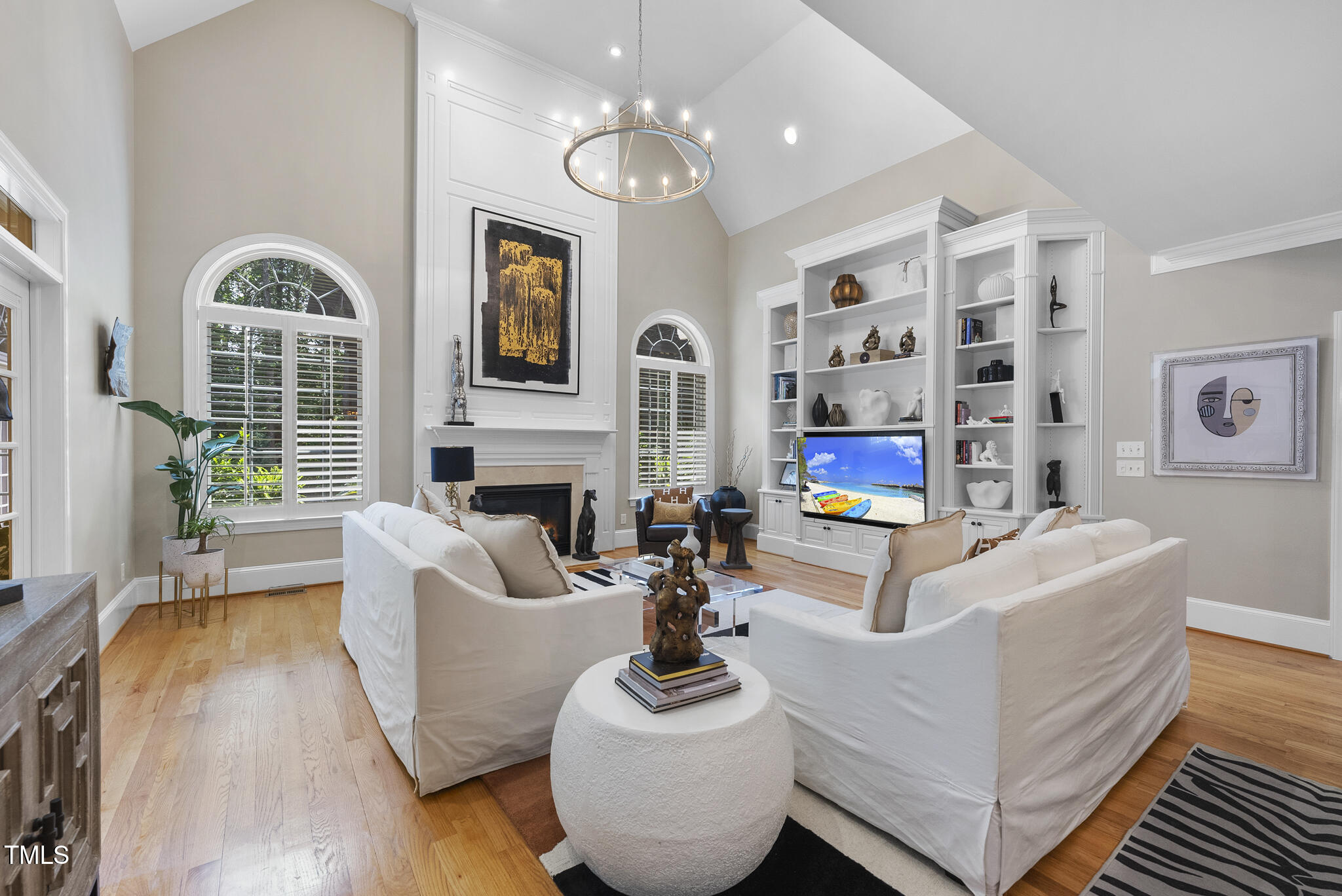 Step inside to a dramatic two-story foyer that sets the tone for the custom details found throughout. The main level features gorgeous hardwood floors, custom plantation shutters, built-in audio and Minka Aire ceiling fans (except for in the sunroom). The cathedral-ceiling study offers a quiet, inspiring workspace with a floor-to-ceiling wall of built-ins and a cozy fireplace.
