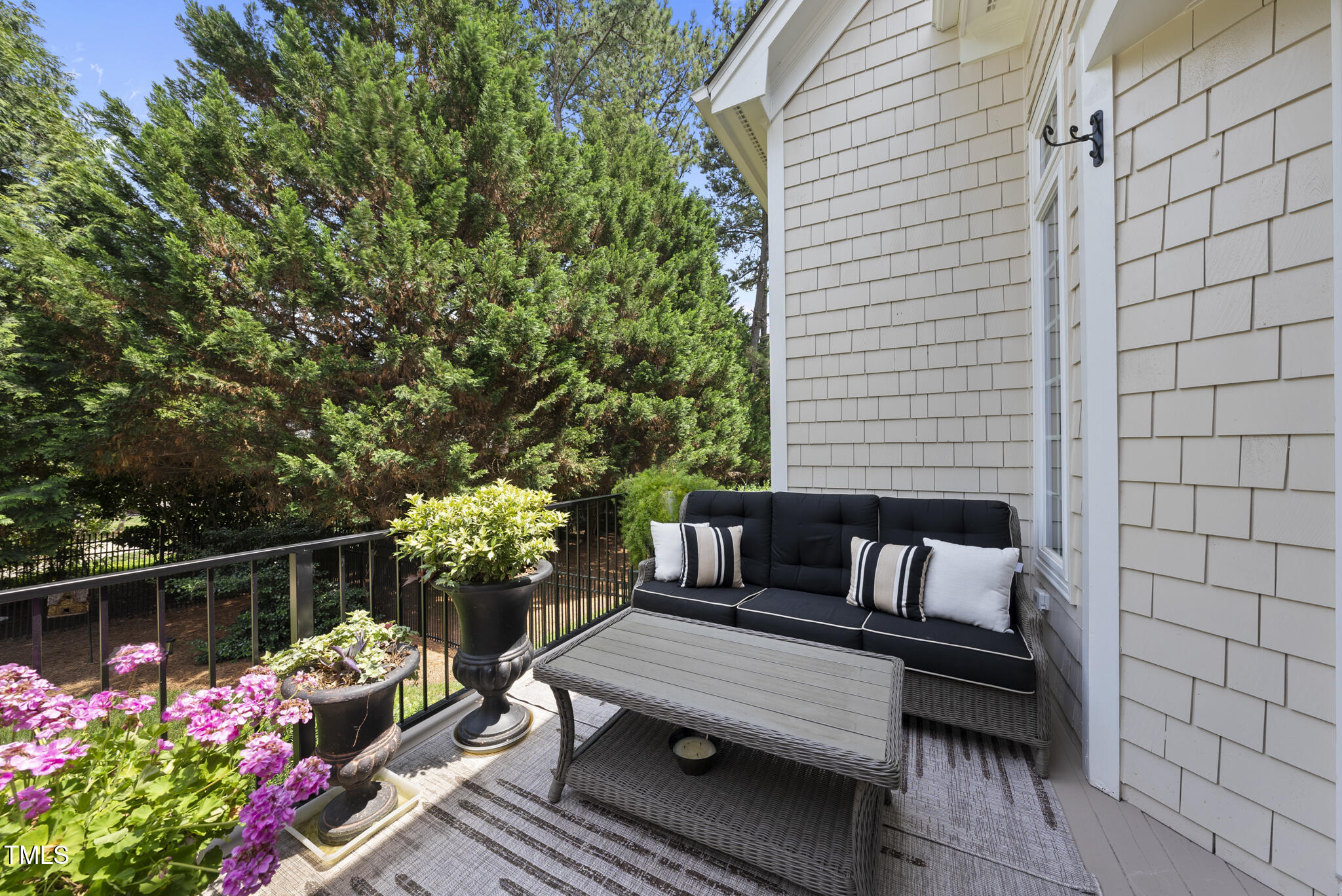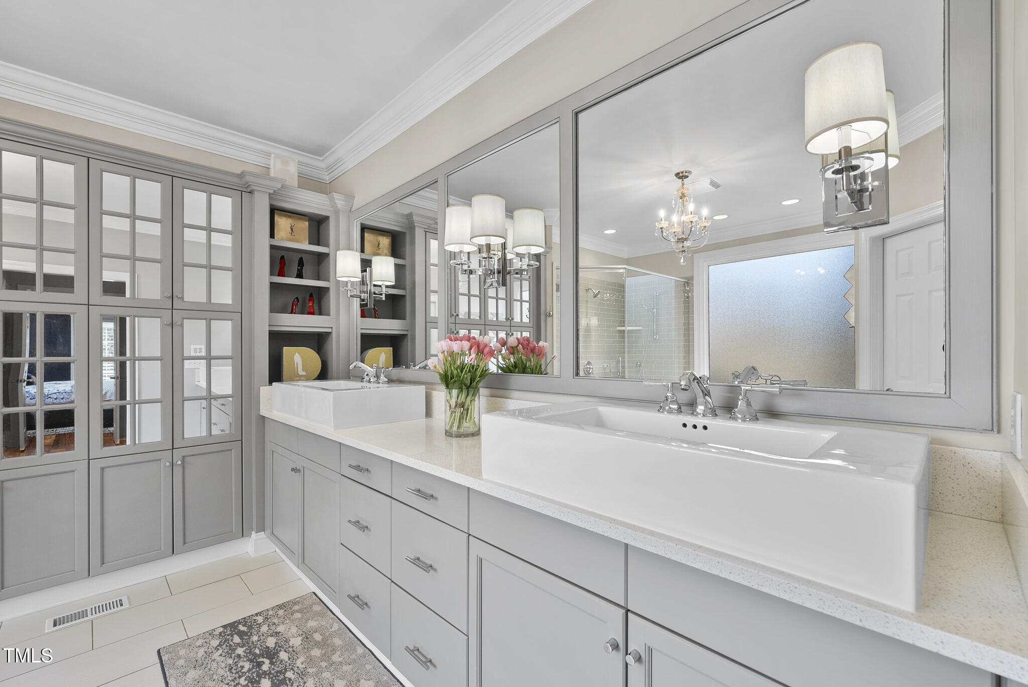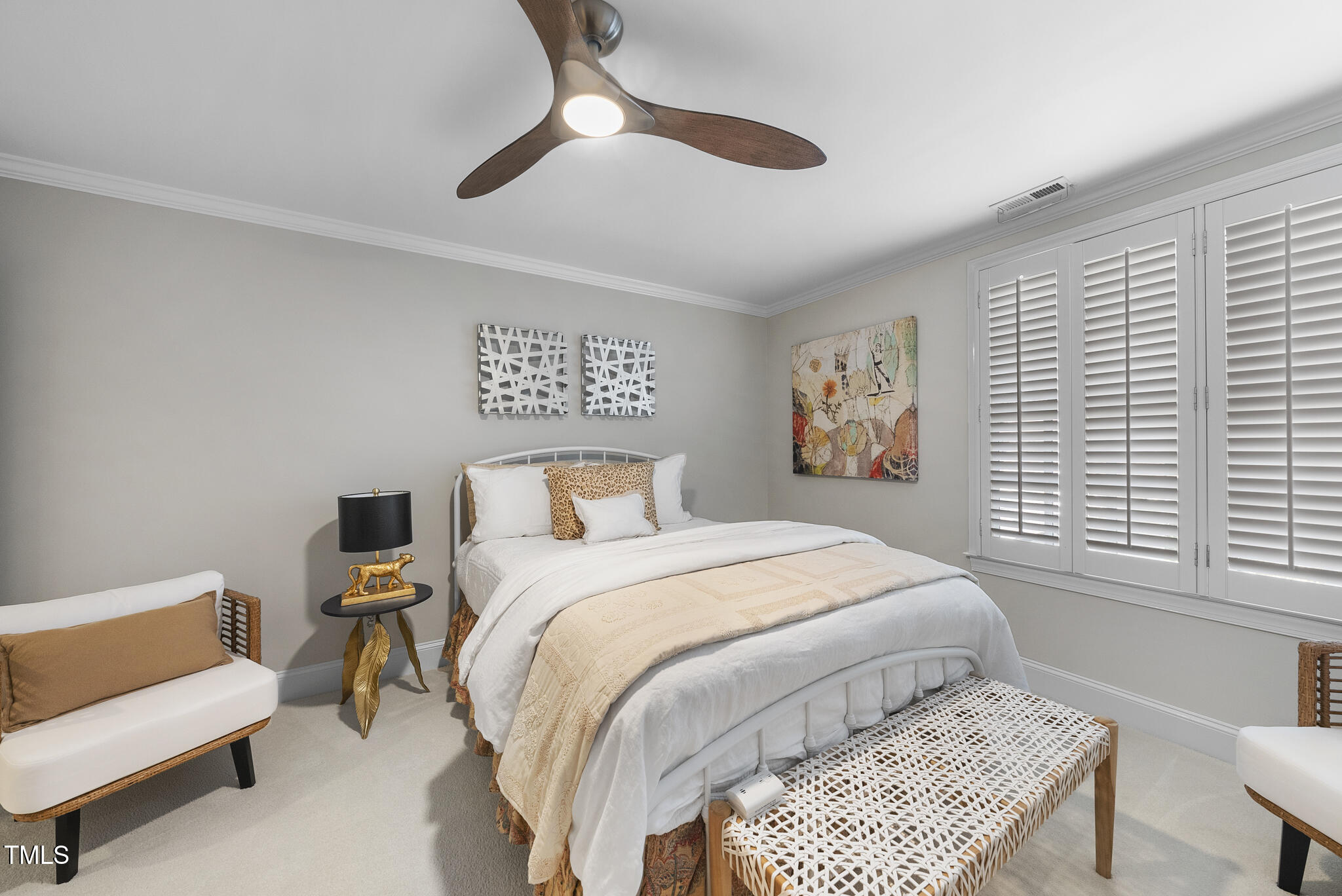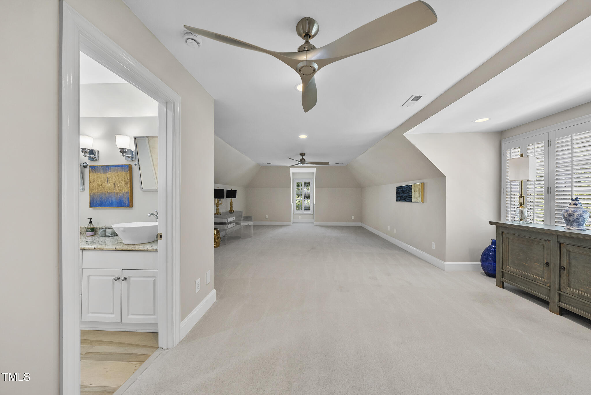 Step inside to a dramatic two-story foyer that sets the tone for the custom details found throughout. The main level features gorgeous hardwood floors, custom plantation shutters, built-in audio and Minka Aire ceiling fans (except for in the sunroom). The cathedral-ceiling study offers a quiet, inspiring workspace with a floor-to-ceiling wall of built-ins and a cozy fireplace.