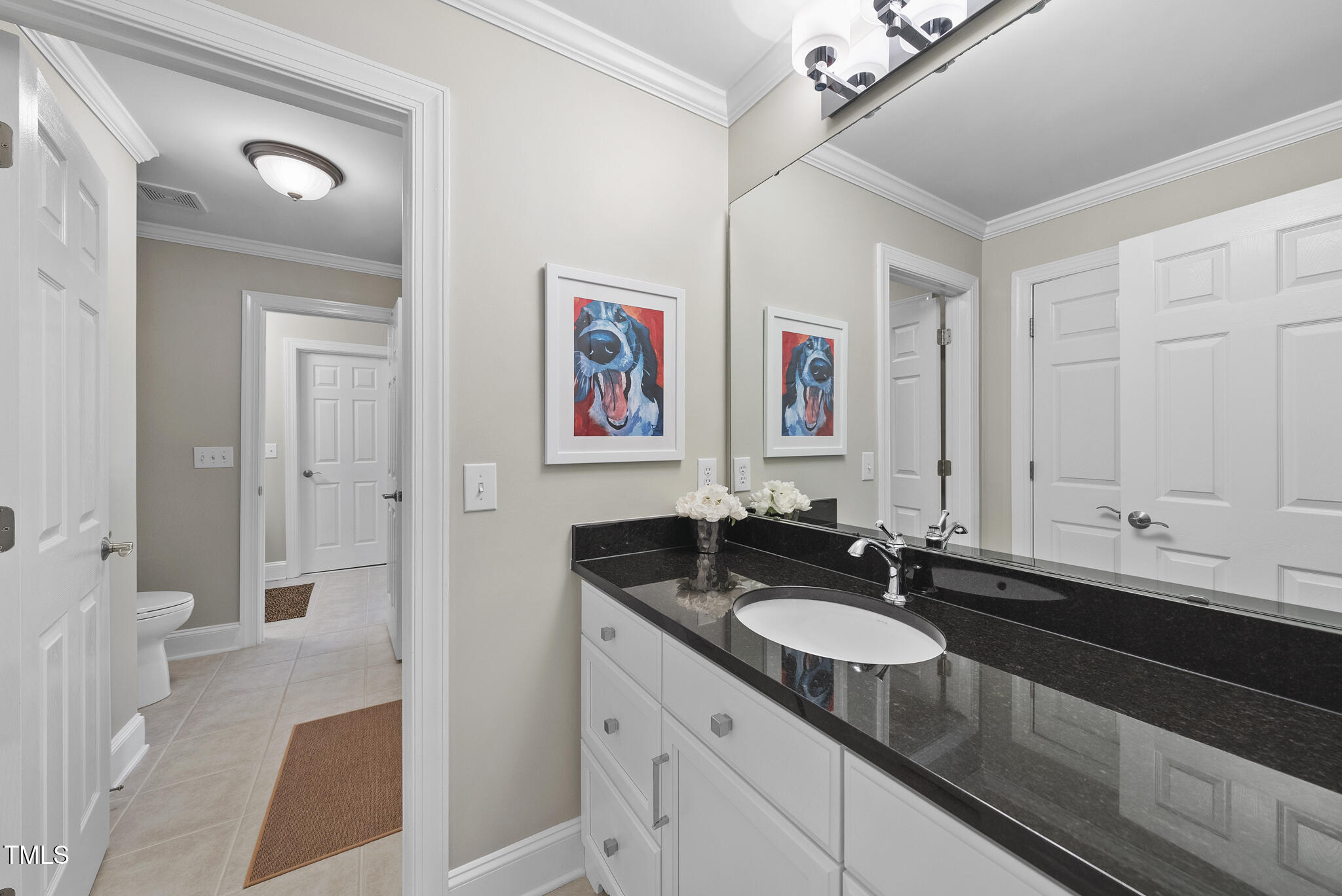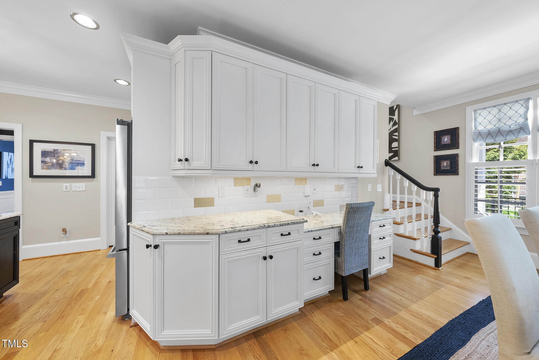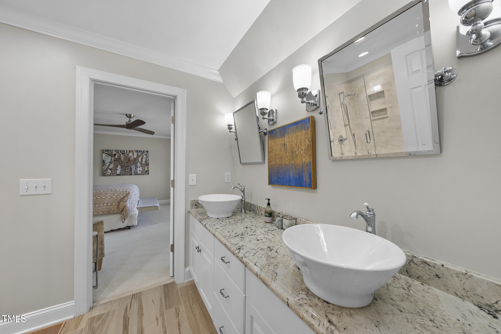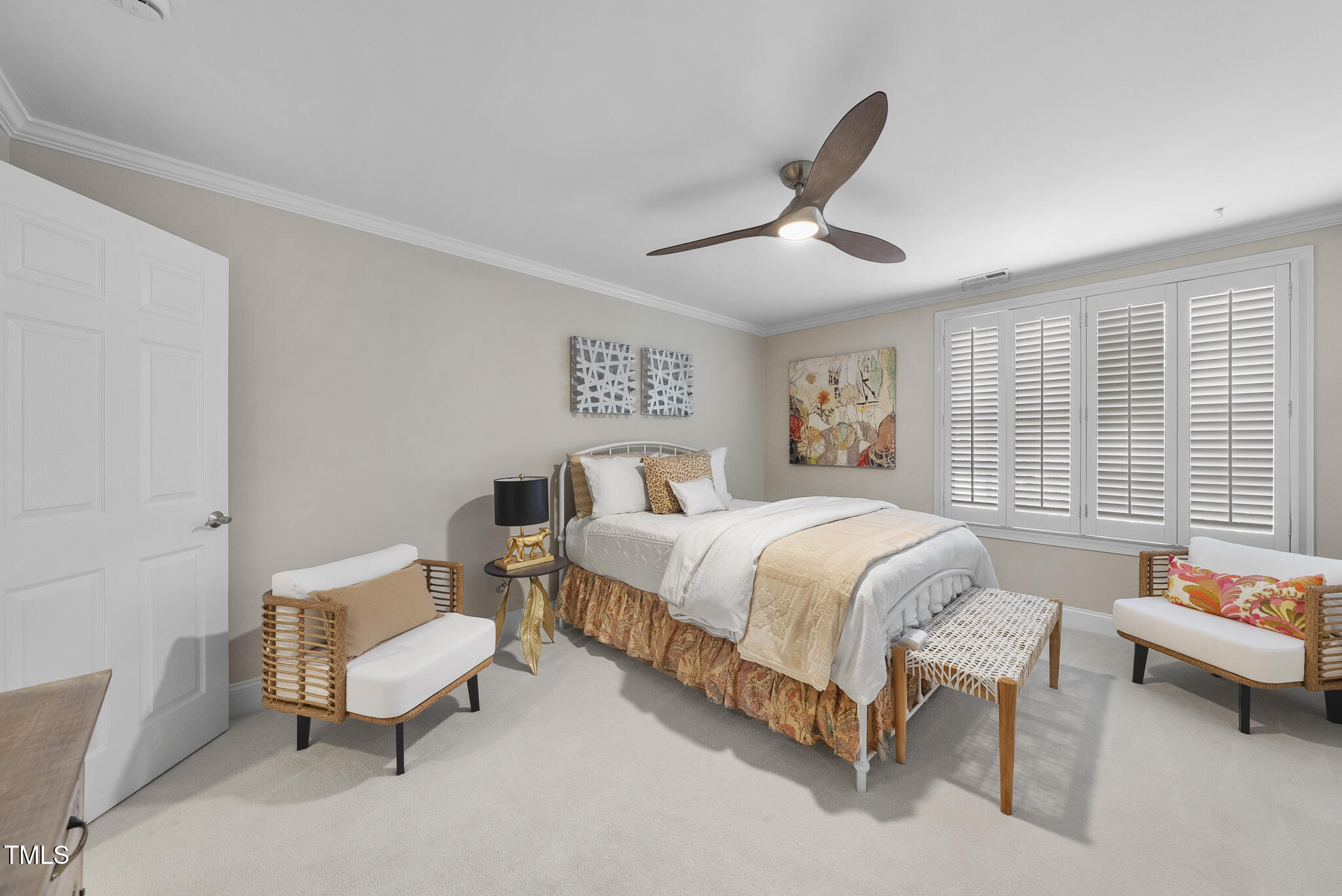 Step inside to a dramatic two-story foyer that sets the tone for the custom details found throughout. The main level features gorgeous hardwood floors, custom plantation shutters, built-in audio and Minka Aire ceiling fans (except for in the sunroom). The cathedral-ceiling study offers a quiet, inspiring workspace with a floor-to-ceiling wall of built-ins and a cozy fireplace.