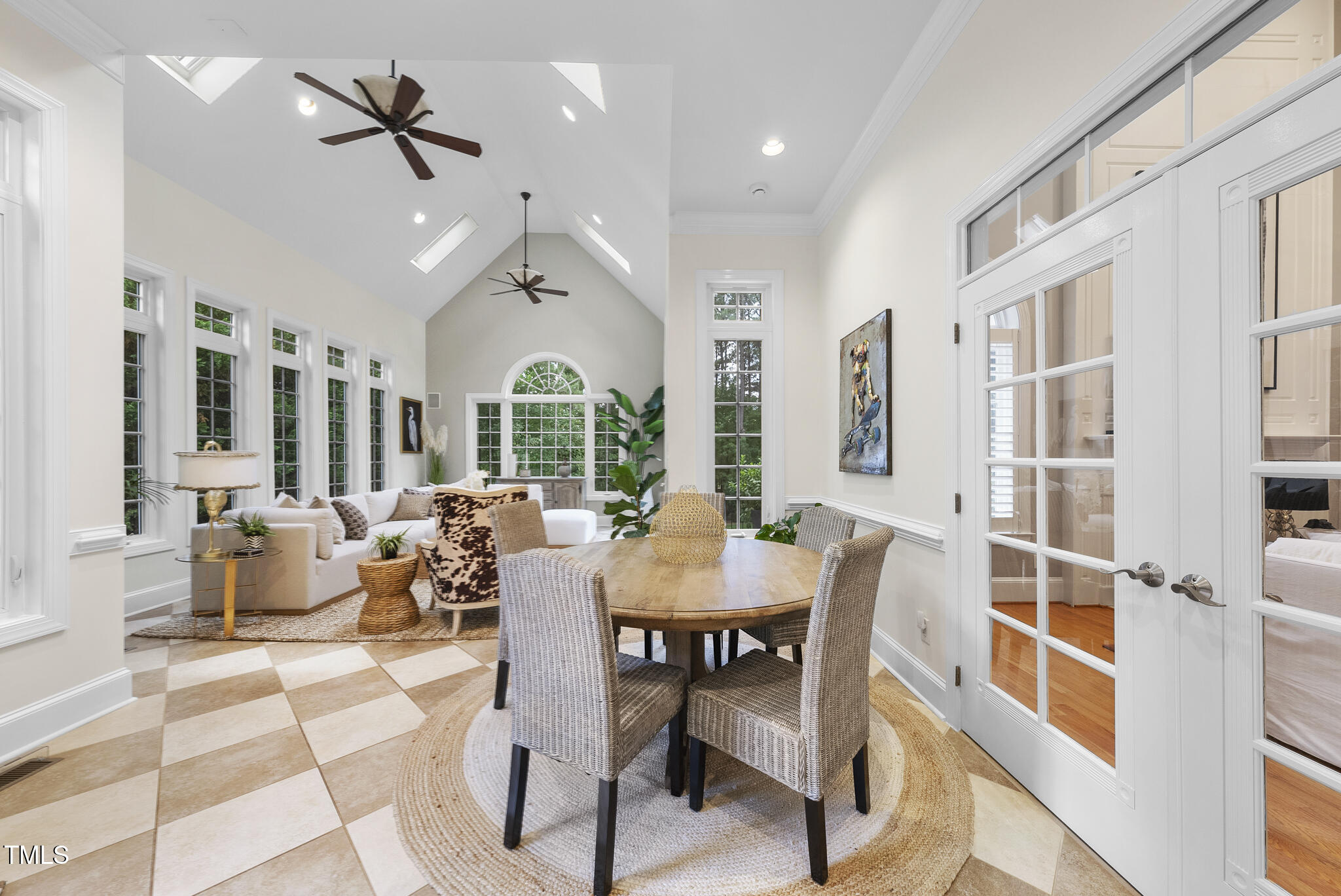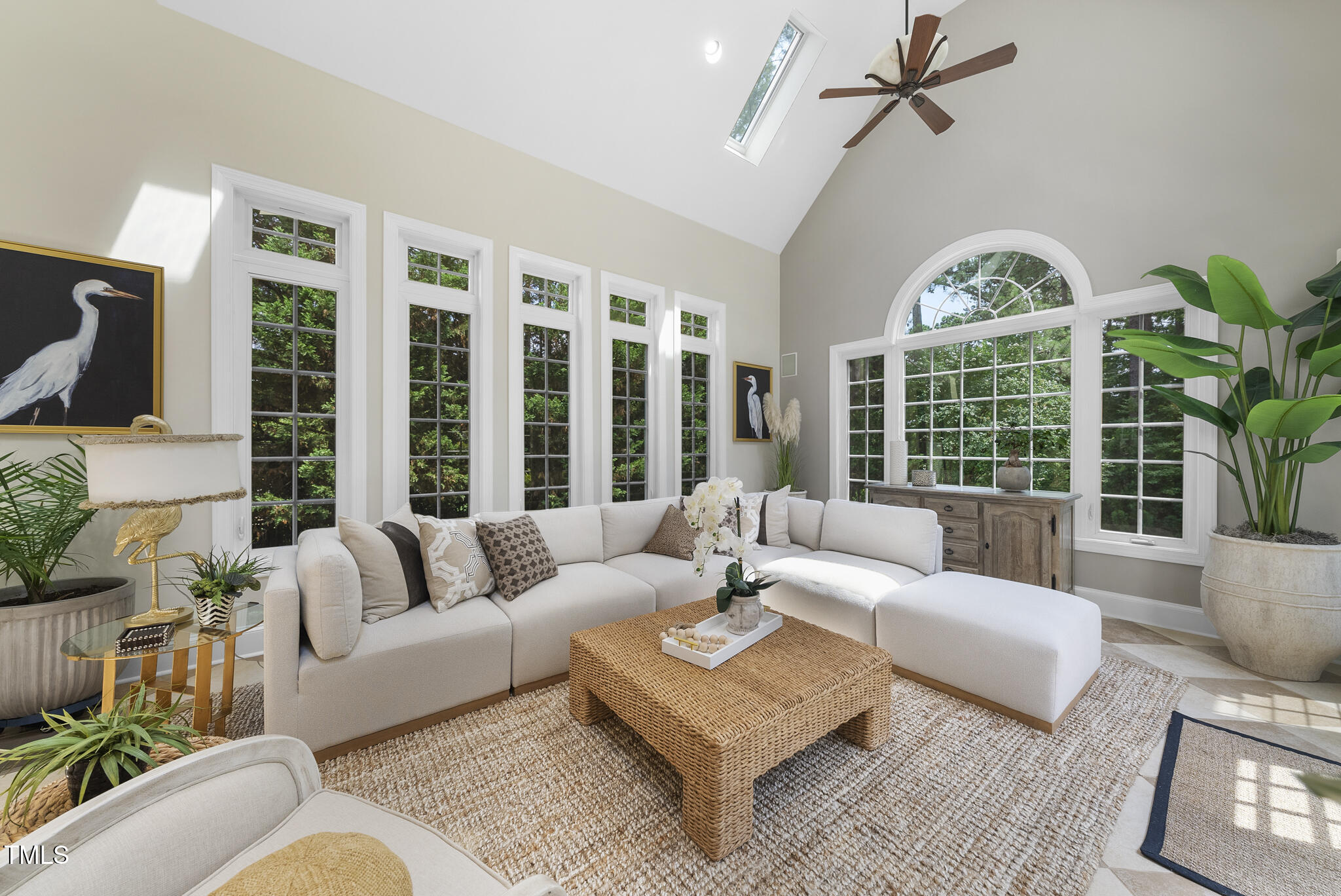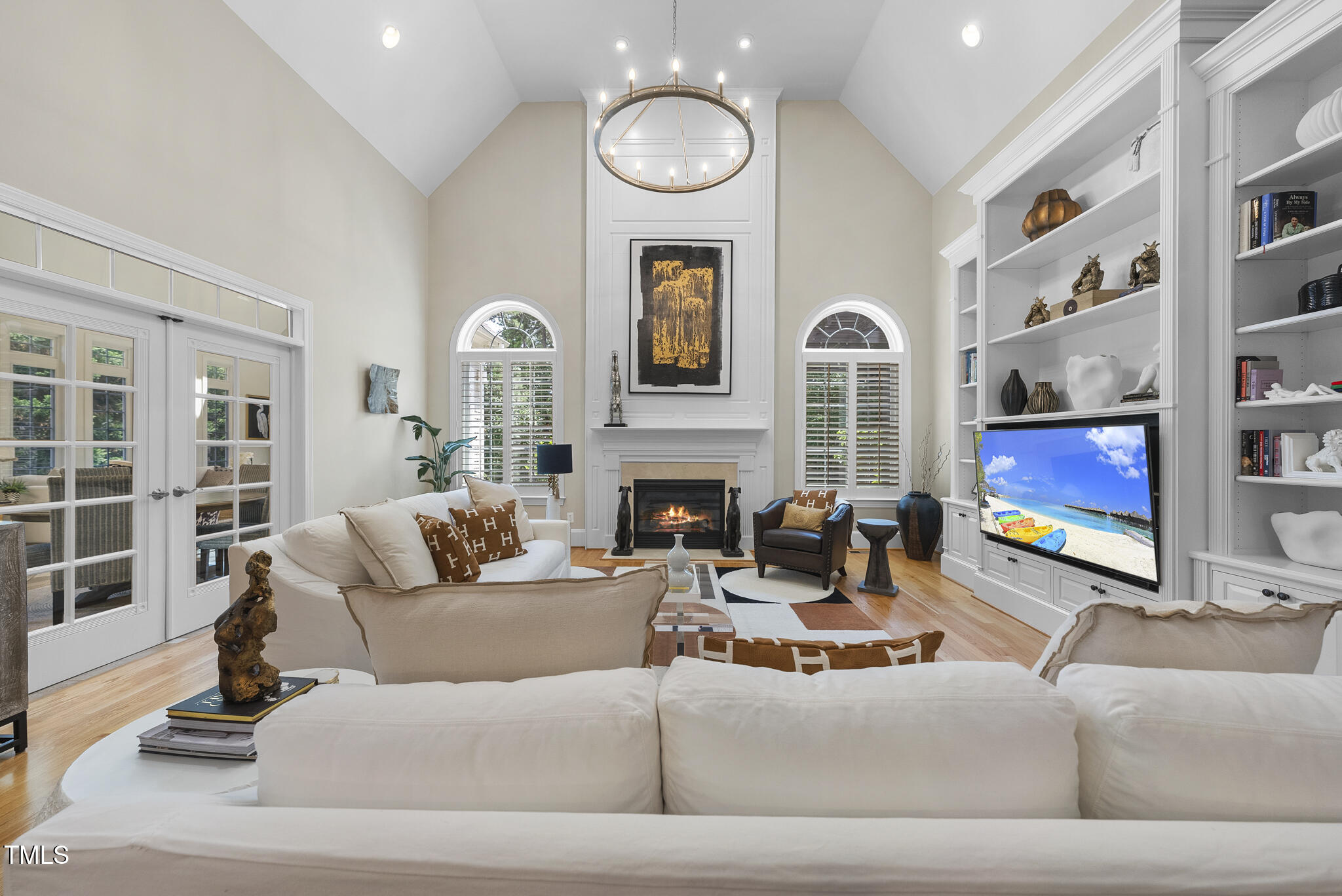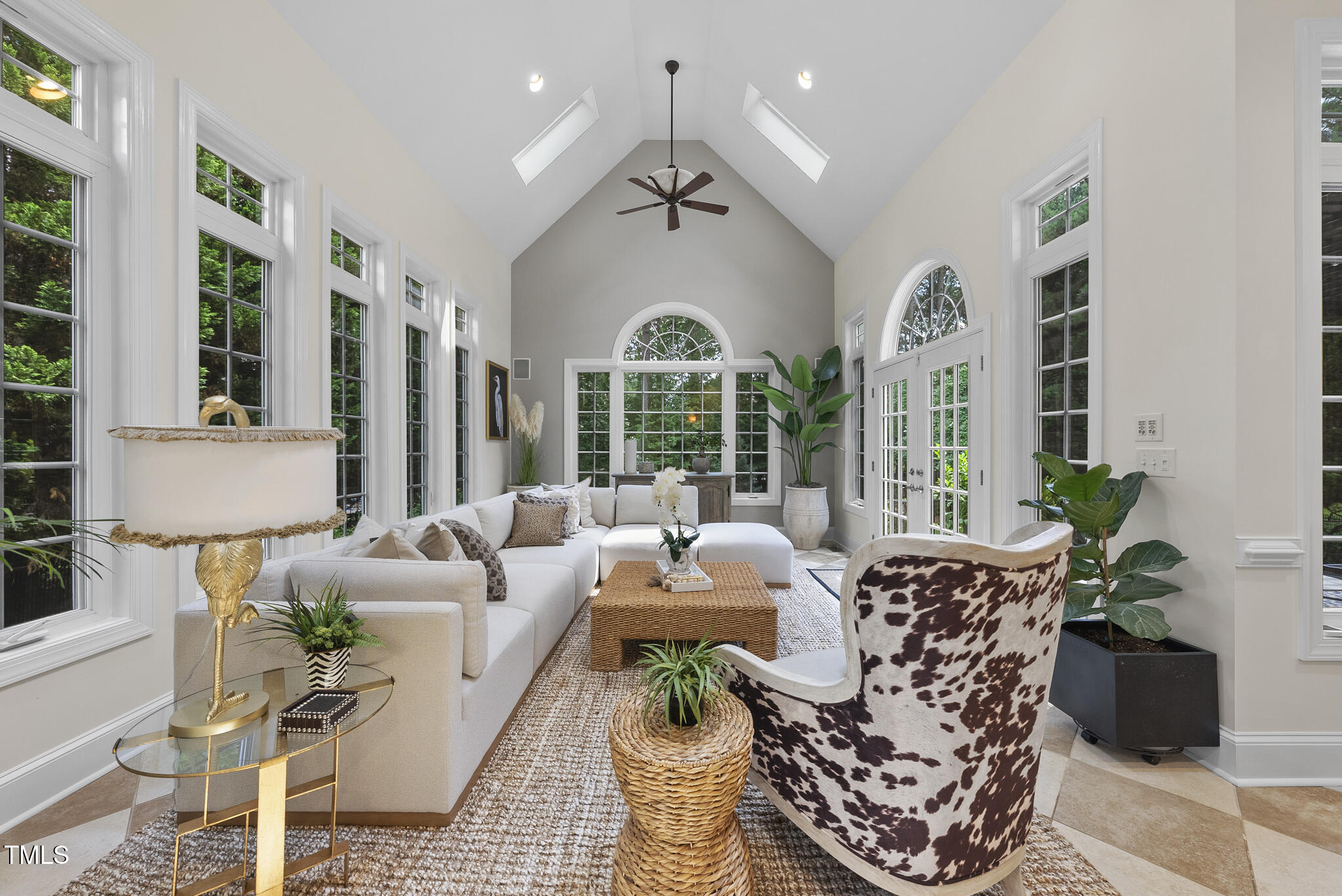 At the heart of the home is the expansive family room with soaring 18-foot ceilings, a second fireplace with custom built-ins, and large windows that bring in natural light. Just off the family room, the light-filled sunroom features radiant heated floors and automated skylights, creating a comfortable retreat year-round.