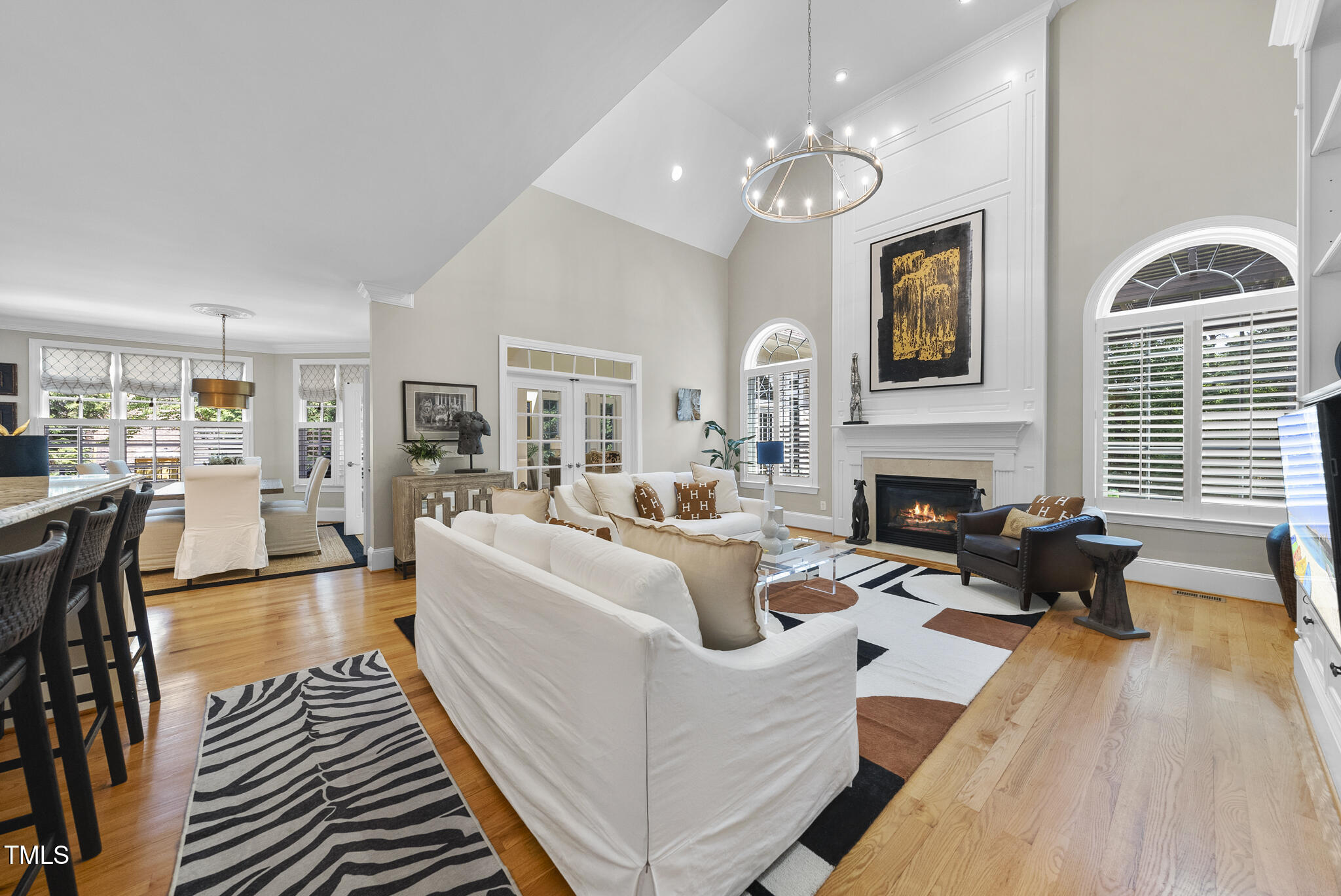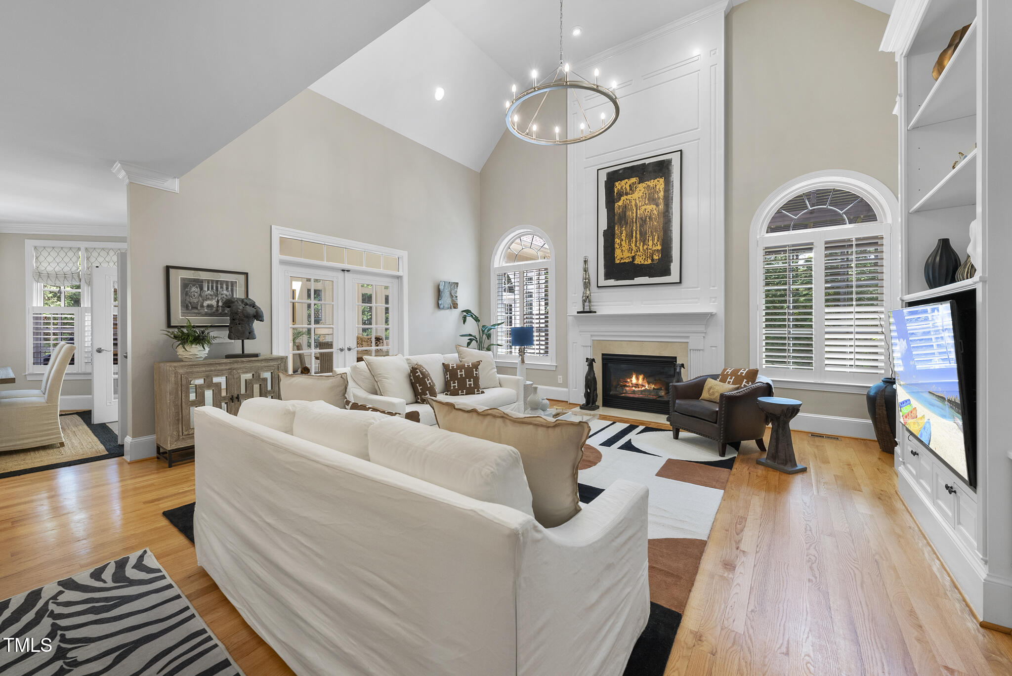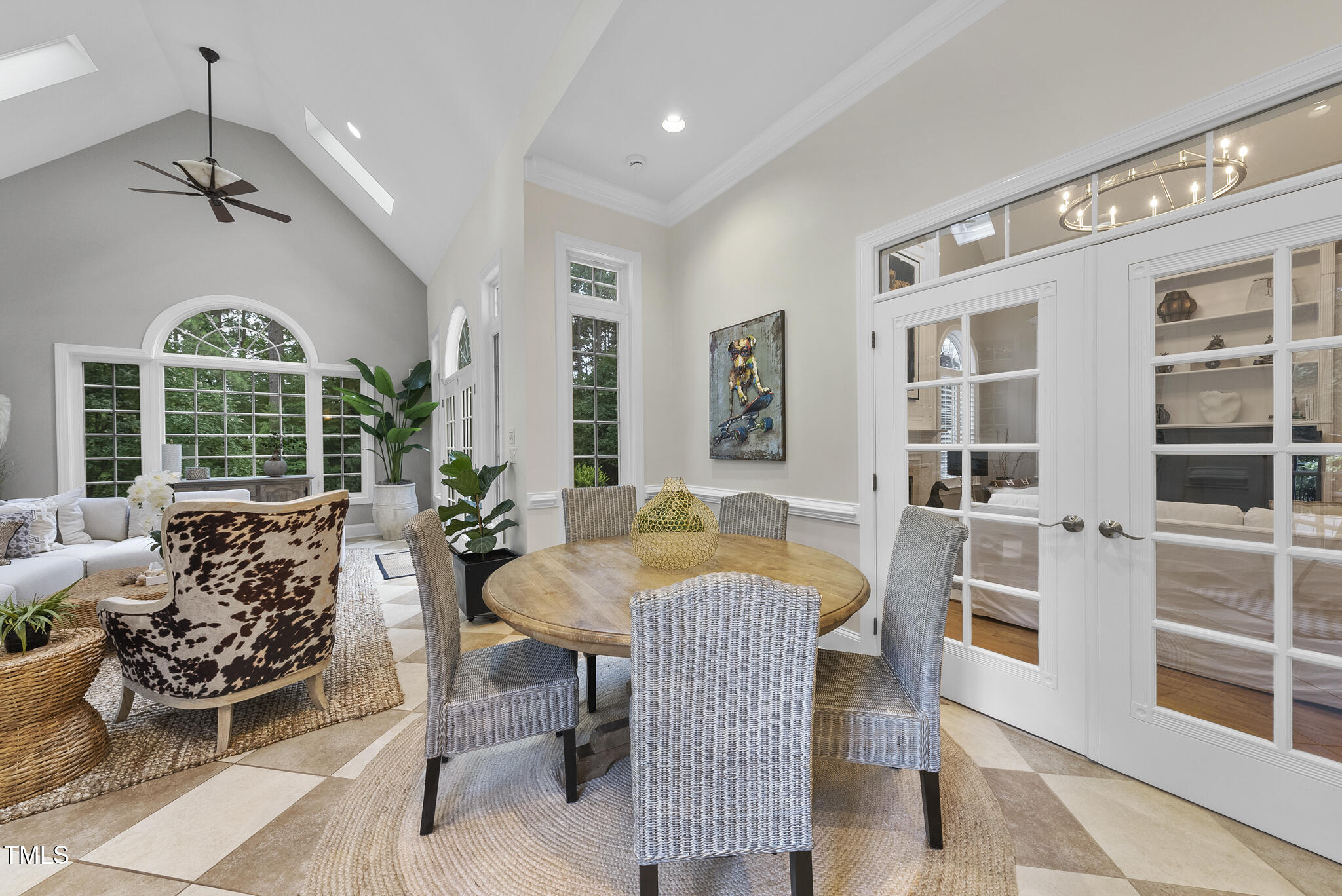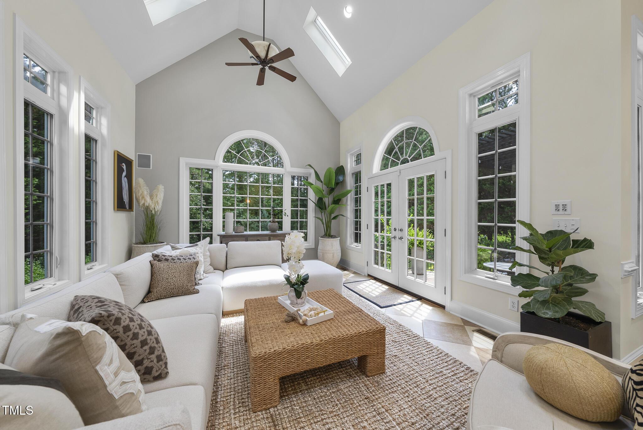 At the heart of the home is the expansive family room with soaring 18-foot ceilings, a second fireplace with custom built-ins, and large windows that bring in natural light. Just off the family room, the light-filled sunroom features radiant heated floors and automated skylights, creating a comfortable retreat year-round.