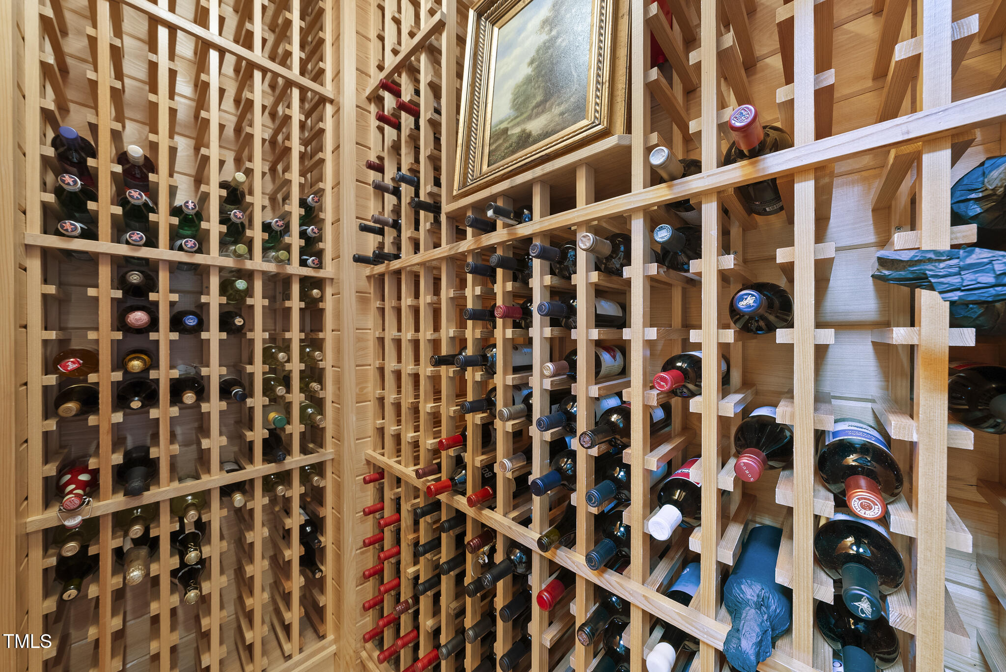 The gourmet kitchen is both elegant and functional, equipped with Fisher & Paykel upper and lower pull-out dishwashers, a JennAir French door refrigerator with in-door water, GE Profile double ovens, a GE Monogram 5-burner downdraft gas cooktop, under-cabinet lighting, and a butler's pantry with wet bar, wine racks, and glass display cabinetry. Wine enthusiasts will appreciate the temperature-controlled 300-bottle wine cellar with teak racks and its own dedicated HVAC unit.