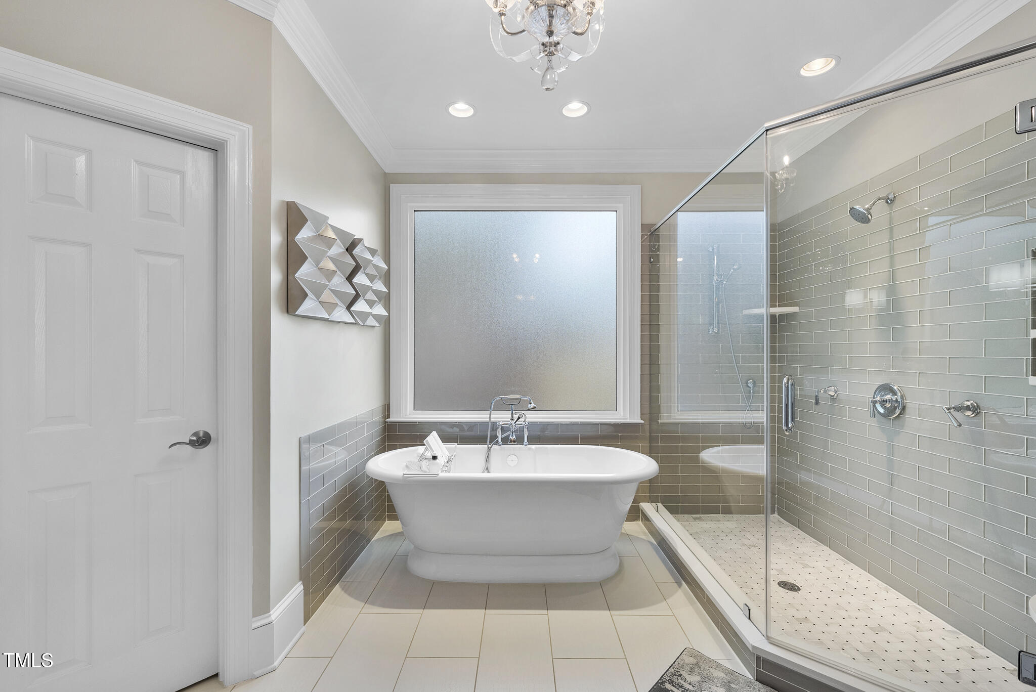 The first-floor owner's suite is a private retreat with a tray ceiling, sconce reading lights, and a spa-like bath featuring a Victoria + Albert freestanding tub, large tile-surround shower with semi-frameless glass, and dual vanities.