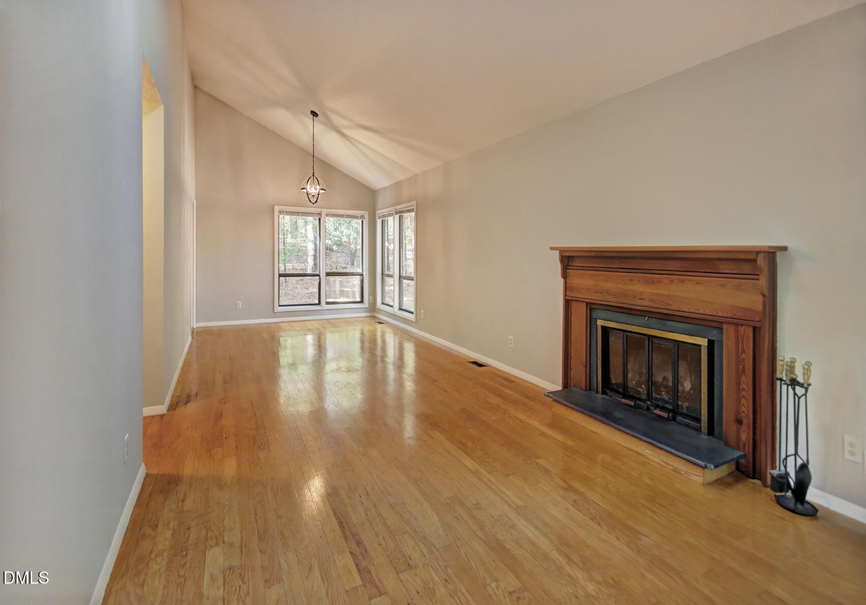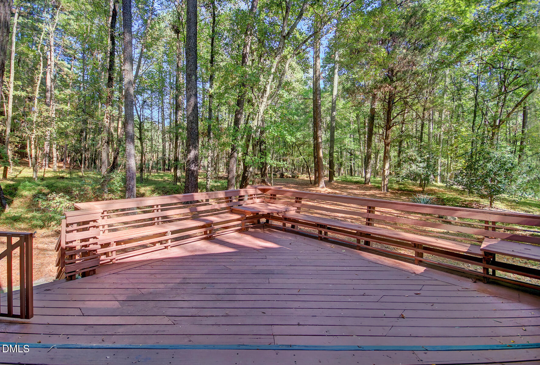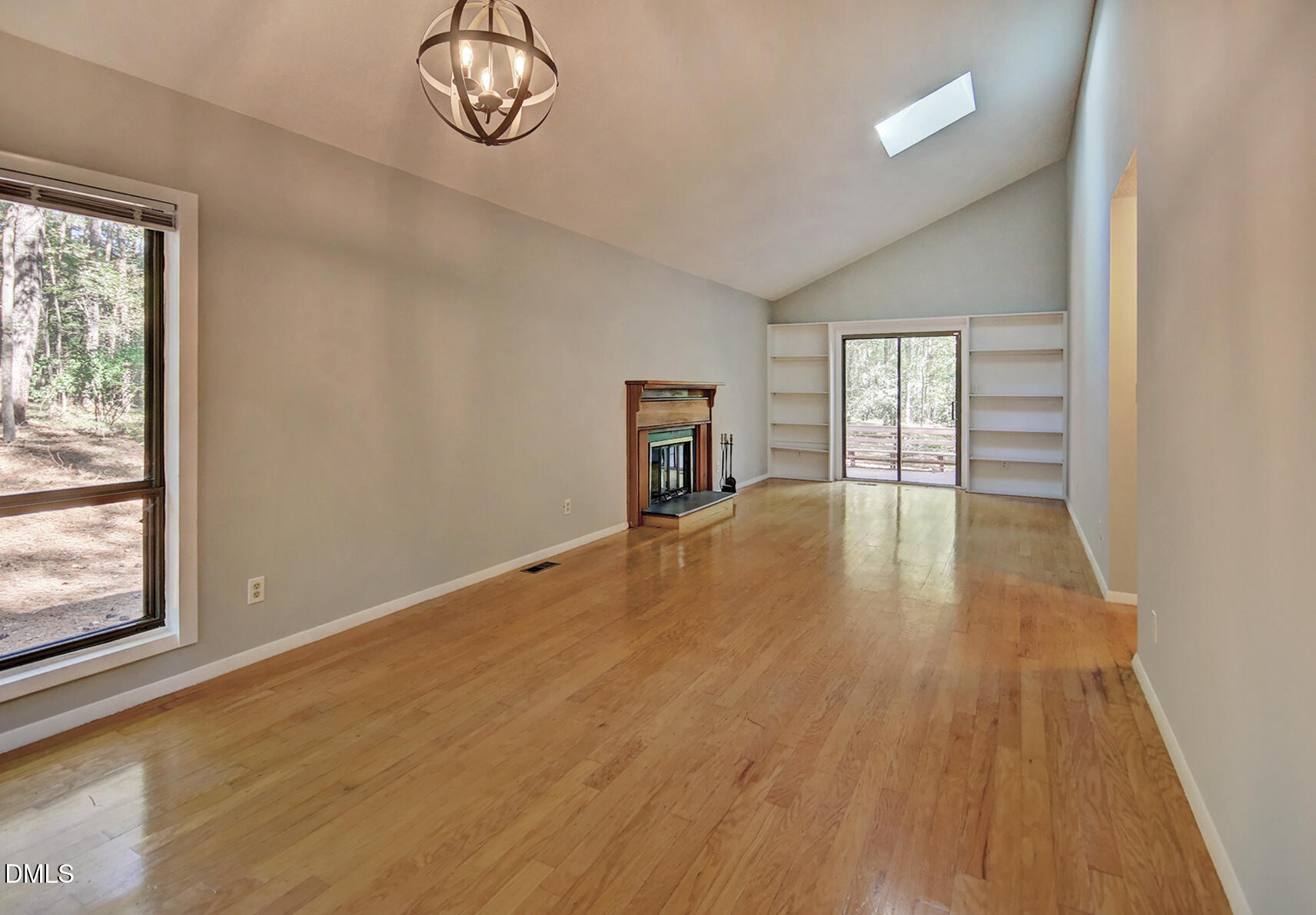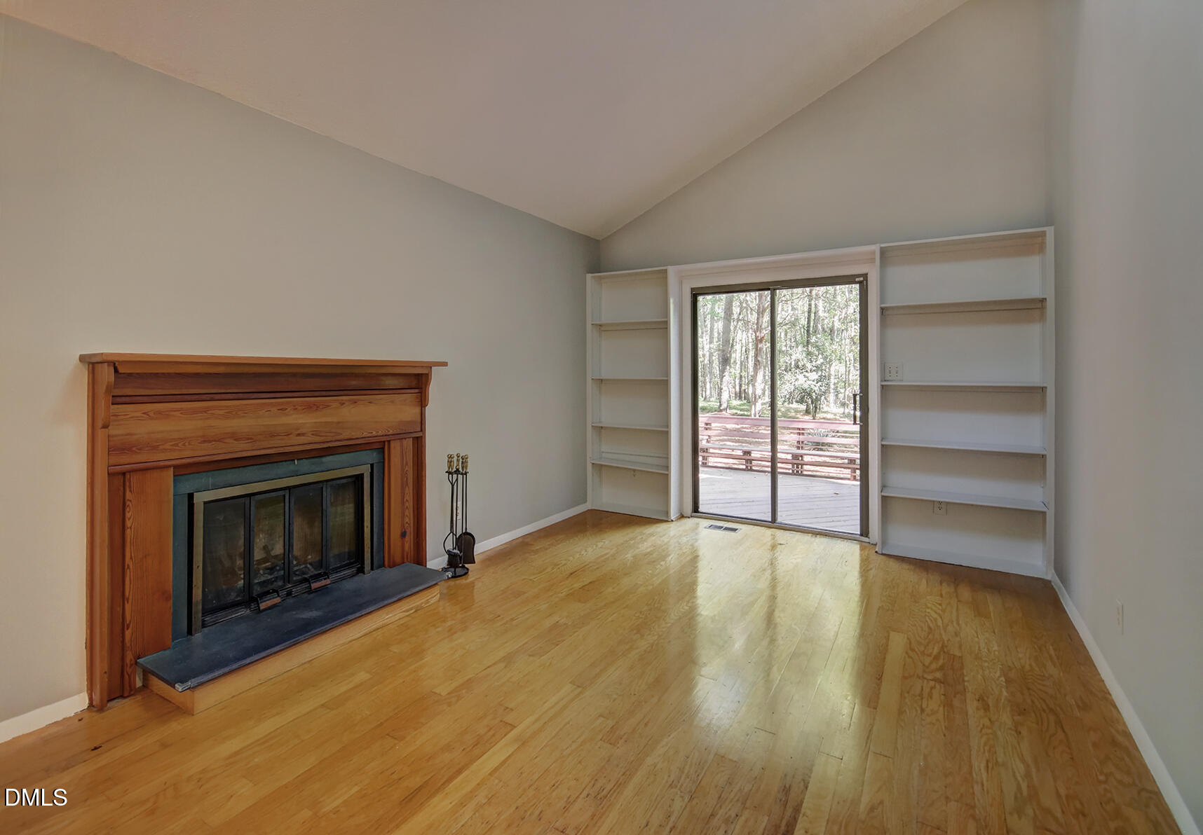 Nestled in the hardwoods and pines on a private 0.6 acre lot in popular Fearrington Village! Single-level living with large corner Deck accessed from both the Primary Bedroom and Family Room. Many rooms have vaulted ceilings. This home lives large for its size. Freshly painted both inside and out. Several skylights, oak HW flooring plus vinyl tile in both Bathrooms (no carpeting). Primary BR has glass sliders accessing the deck, WIC, large window plus ensuite with concrete top vanity & tiled tub/shower combo with skylight. Bedrooms 2 and 3 have large closets and access to the Full Bath in the Hall, which also features the Laundry Area with storage shelves. This spacious Full Bath has a large vanity with concrete top, tiled tub/shower with skylight, vinyl tiled floor. Kitchen offers a skylight, granite tops, tiled splash, under-cabinet lighting, built-in MW, electric range, DW, fridge, pantry. Nearby Breakfast features vaulted ceiling and corner windows overlooking the wooded yard. Family Room has a wood-burning fireplace surrounded by a handsome solid wood mantel and granite hearth. Double bookshelves flank the glass sliders that access the Rear Deck; vaulted ceiling extends to the Dining Area with 4 corner windows. Nearby Hall Closet. Attic pull-down. Wonderful gardener's Storage Shed is attached and adjacent to a winding gravel Path that meanders from the Front Driveway (with several Parking Pads) to the Rear Deck. Concrete Front Path leads to the covered Front Stoop. Enjoy the sun-dappled under story of this lovely wooded lot in popular Fearrington Village!