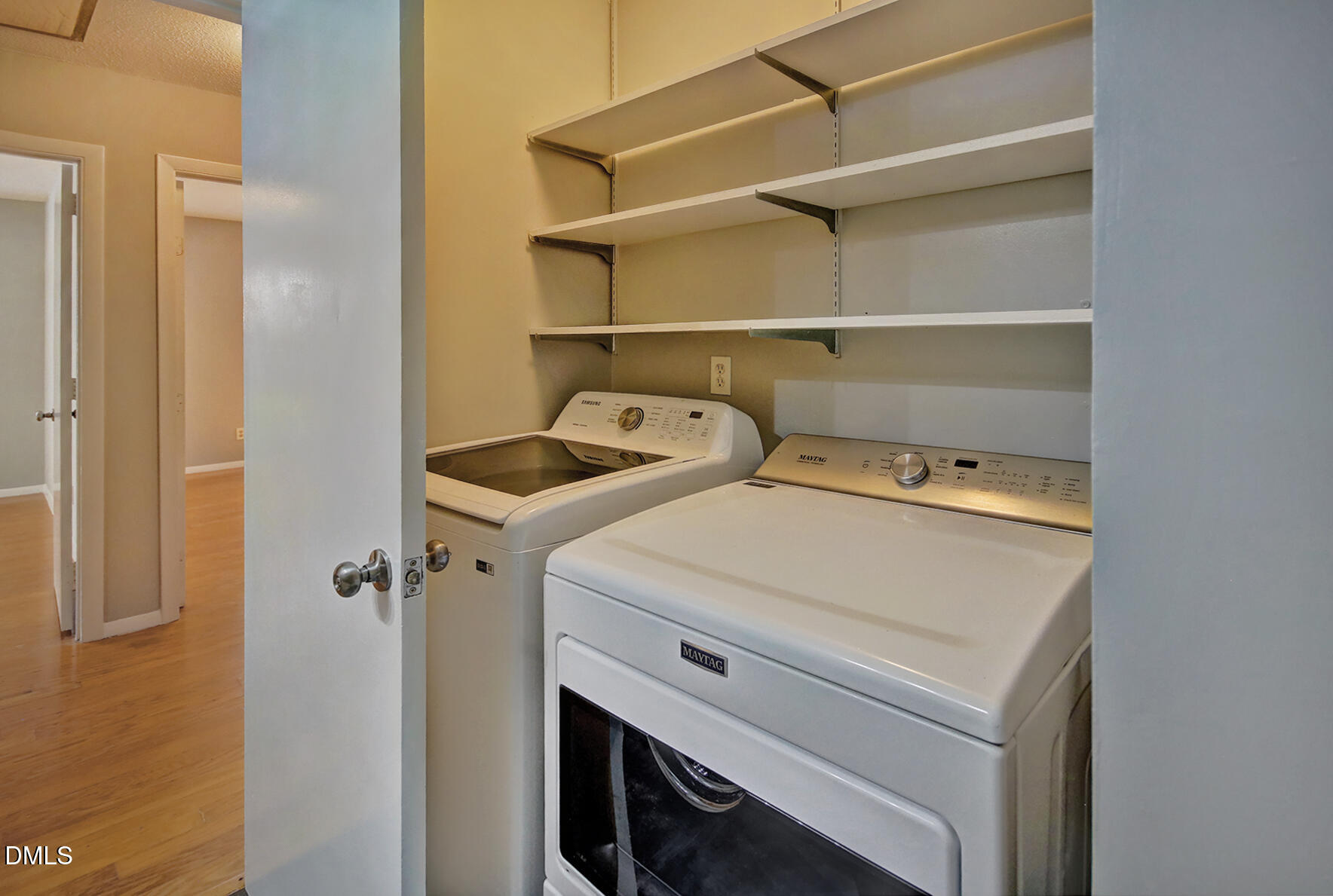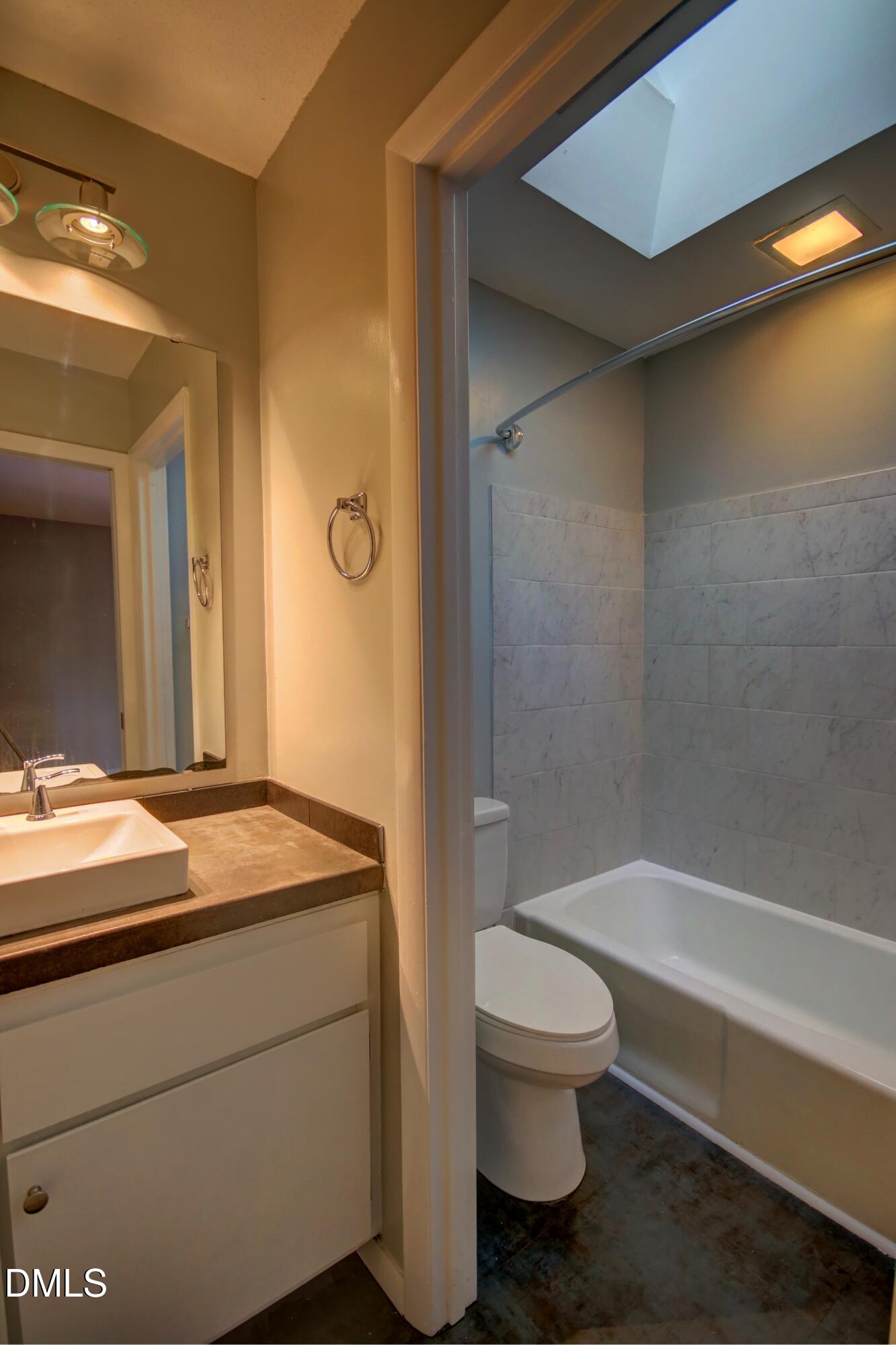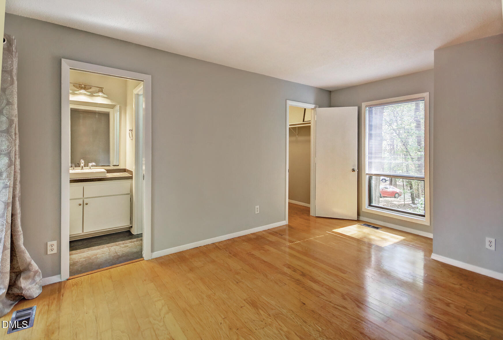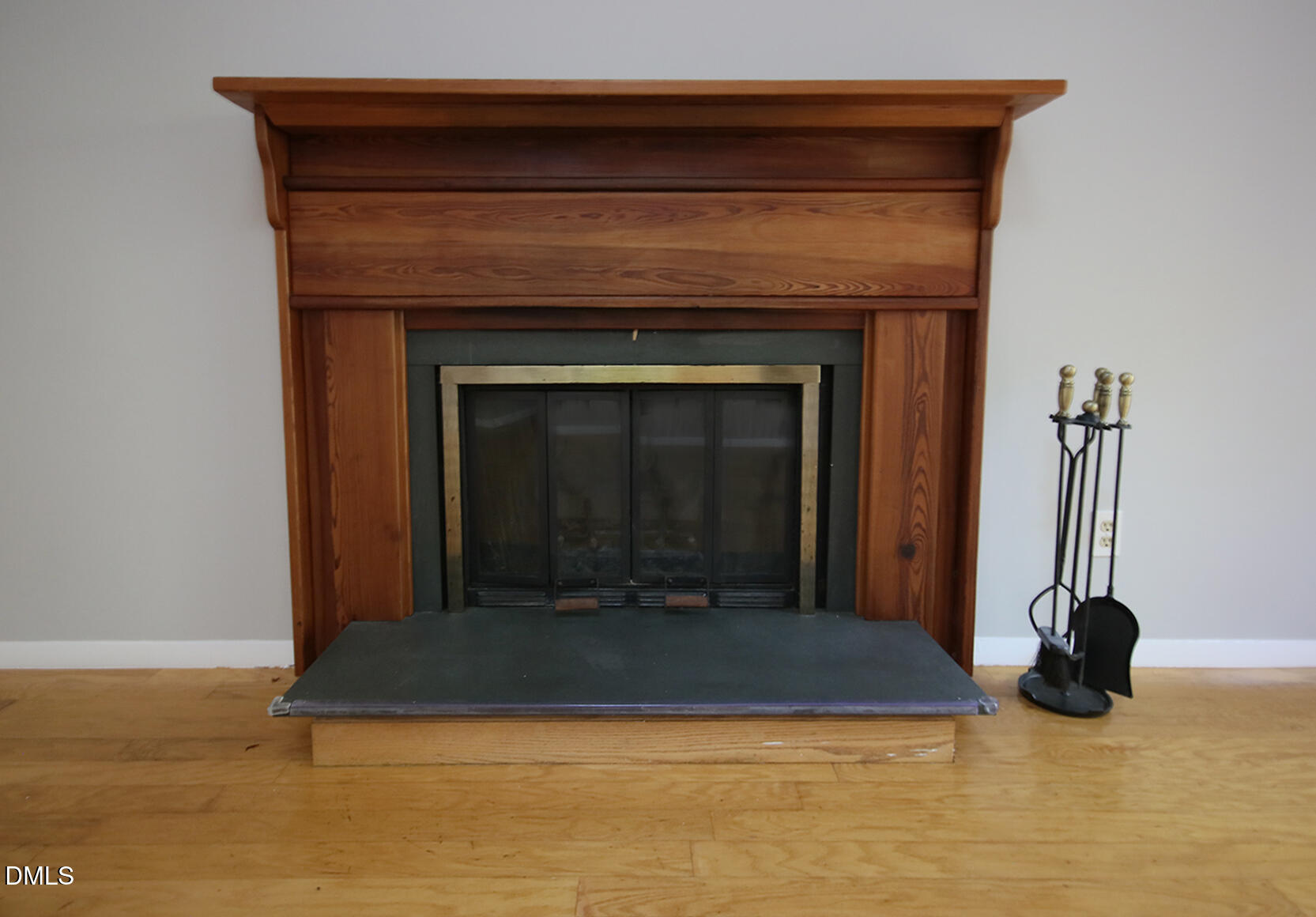 Nestled in the hardwoods and pines on a private 0.6 acre lot in popular Fearrington Village! Single-level living with large corner Deck accessed from both the Primary Bedroom and Family Room. Many rooms have vaulted ceilings. This home lives large for its size. Freshly painted both inside and out. Several skylights, oak HW flooring plus vinyl tile in both Bathrooms (no carpeting). Primary BR has glass sliders accessing the deck, WIC, large window plus ensuite with concrete top vanity & tiled tub/shower combo with skylight. Bedrooms 2 and 3 have large closets and access to the Full Bath in the Hall, which also features the Laundry Area with storage shelves. This spacious Full Bath has a large vanity with concrete top, tiled tub/shower with skylight, vinyl tiled floor. Kitchen offers a skylight, granite tops, tiled splash, under-cabinet lighting, built-in MW, electric range, DW, fridge, pantry. Nearby Breakfast features vaulted ceiling and corner windows overlooking the wooded yard. Family Room has a wood-burning fireplace surrounded by a handsome solid wood mantel and granite hearth. Double bookshelves flank the glass sliders that access the Rear Deck; vaulted ceiling extends to the Dining Area with 4 corner windows. Nearby Hall Closet. Attic pull-down. Wonderful gardener's Storage Shed is attached and adjacent to a winding gravel Path that meanders from the Front Driveway (with several Parking Pads) to the Rear Deck. Concrete Front Path leads to the covered Front Stoop. Enjoy the sun-dappled under story of this lovely wooded lot in popular Fearrington Village!